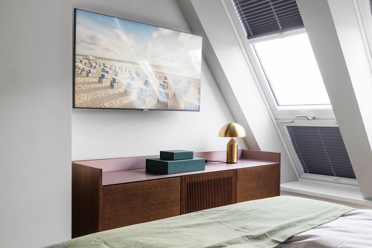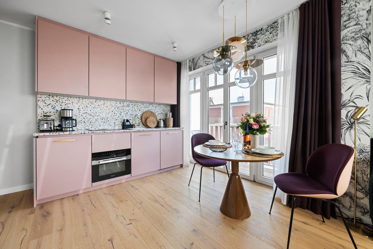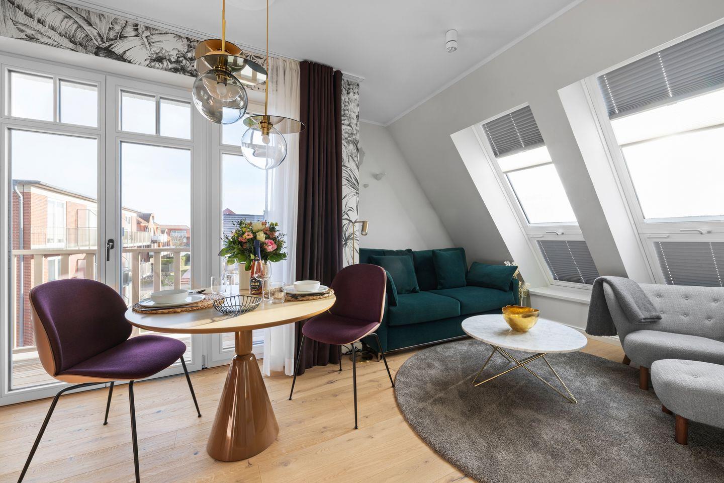 Der offene Wohnbereich empfängt Sie mit einem hochwertigen Schlafsofa, das sich im Handumdrehen in einen zusätzlichen Schlafplatz verwandeln lässt. Große Fenster öffnen den Raum und führen direkt auf die Loggia mit Ostausrichtung. Starten Sie hier mit einer Tasse Kaffee in der Morgensonne, atmen Sie die frische Nordseeluft und lassen Sie den Blick über Westerland schweifen. Die offene, voll ausgestattete Küche mit modernsten Geräten und Bora-Dunstabzug lädt dazu ein, gemeinsam zu kochen, zu genießen und den Abend entspannt am Esstisch ausklingen zu lassen.