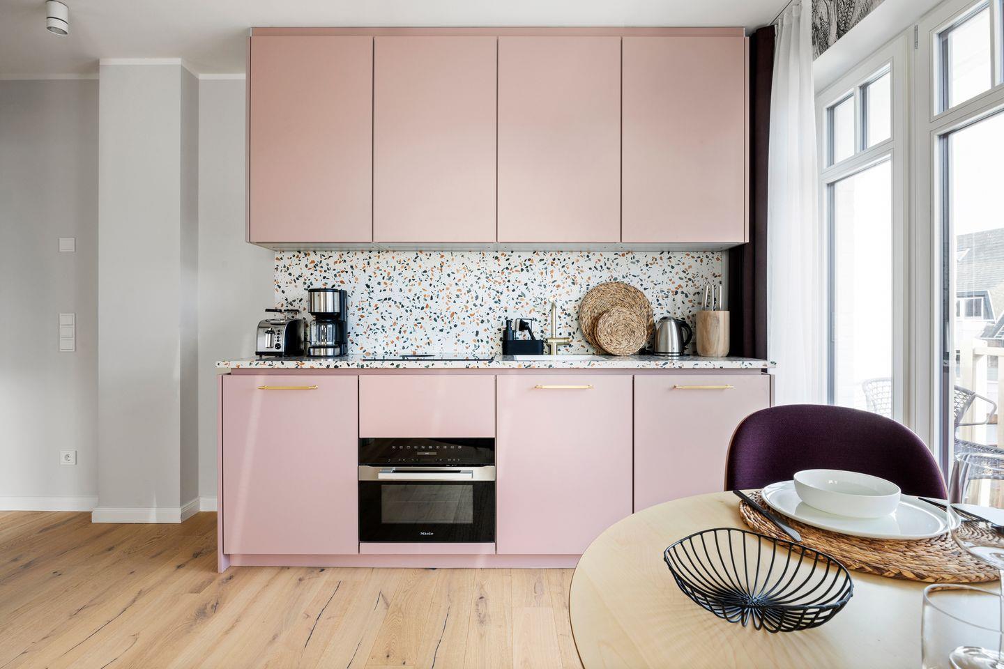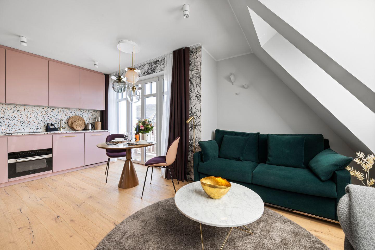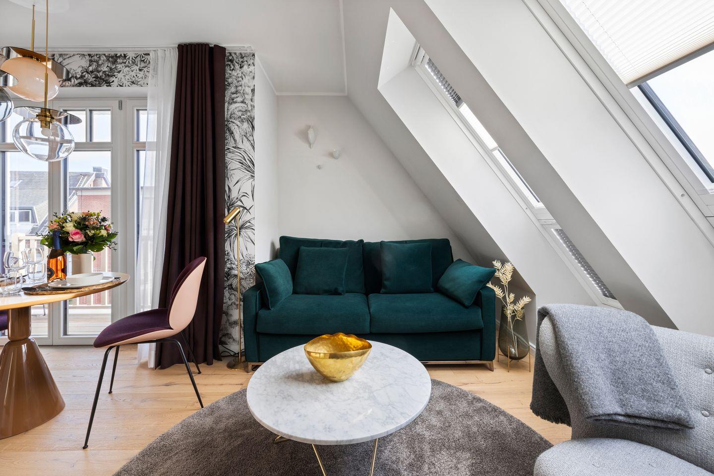 Der offene Wohnbereich empfängt Sie mit einem hochwertigen Schlafsofa, das sich im Handumdrehen in einen zusätzlichen Schlafplatz verwandeln lässt. Große Fenster öffnen den Raum und führen direkt auf die Loggia mit Ostausrichtung. Starten Sie hier mit einer Tasse Kaffee in der Morgensonne, atmen Sie die frische Nordseeluft und lassen Sie den Blick über Westerland schweifen. Die offene, voll ausgestattete Küche mit modernsten Geräten und Bora-Dunstabzug lädt dazu ein, gemeinsam zu kochen, zu genießen und den Abend entspannt am Esstisch ausklingen zu lassen.
