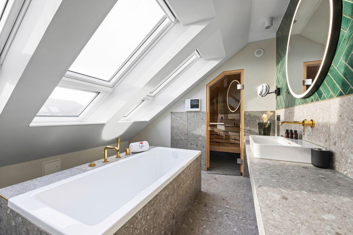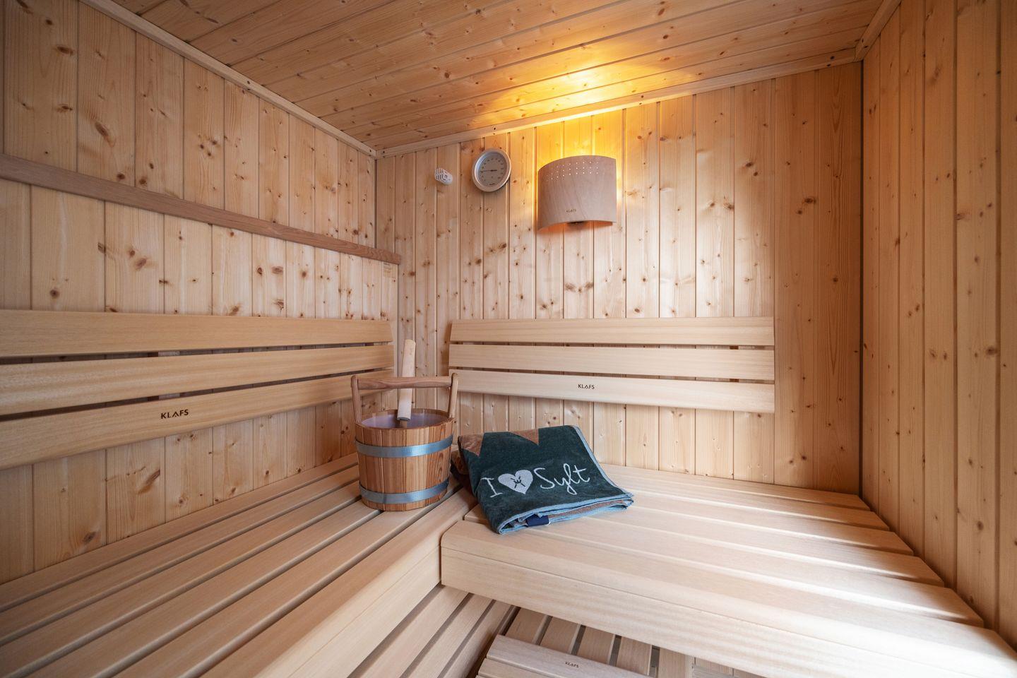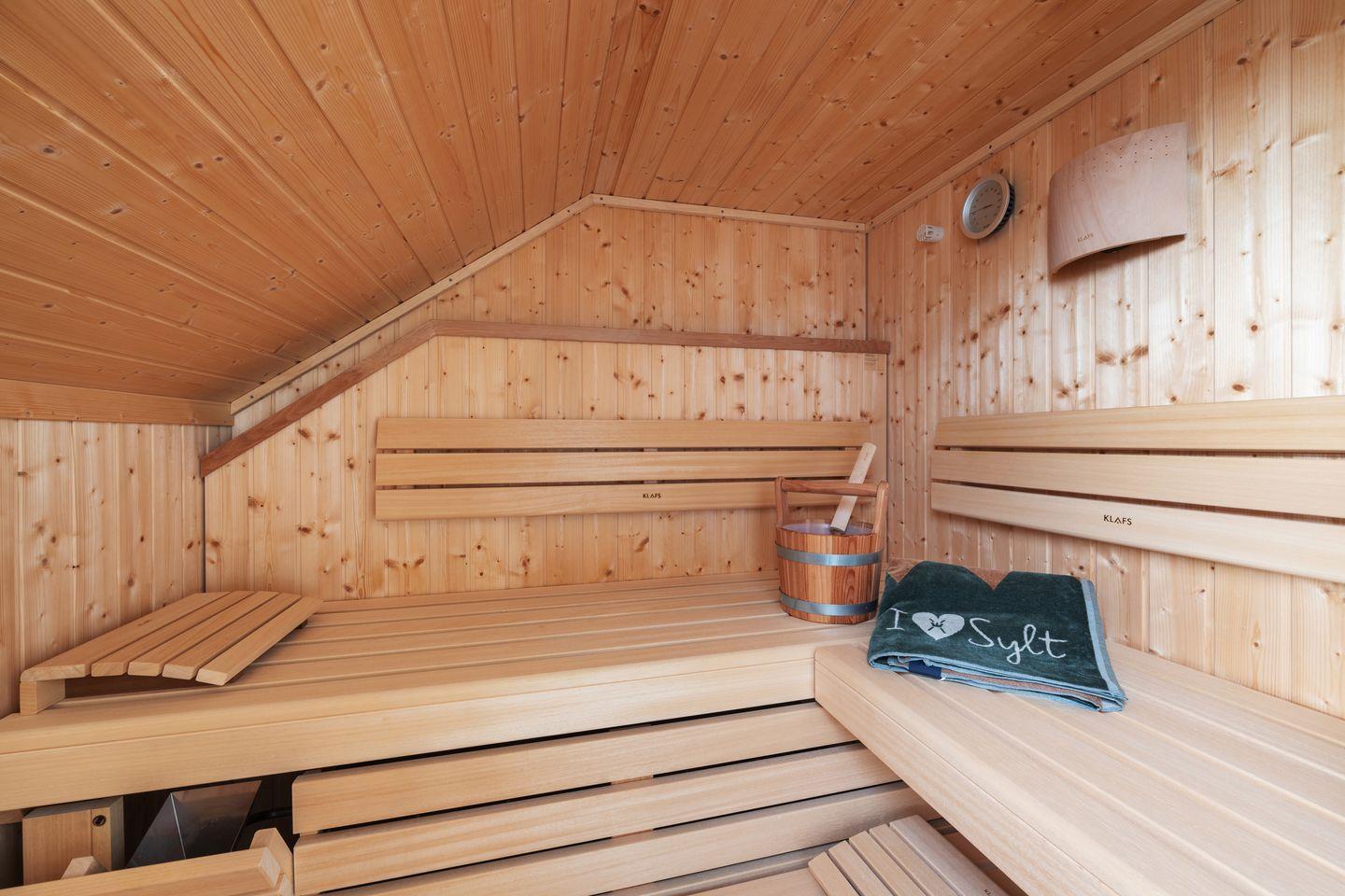 Das gesamte Obergeschoss begeistert mit einem großzügigen, offenen Badezimmer im Spa-Stil. Eine bodengleiche Regendusche schenkt Ihnen das Gefühl eines warmen Sommerregens, während die freistehende Badewanne den Blick in den Sylter Himmel freigibt. Elektrisch zu öffnende Oberlichter lassen Tageslicht hereinströmen und schaffen eine besondere Atmosphäre. Die private KLAFS-Sauna lädt dazu ein, tief durchzuatmen, zur Ruhe zu kommen und vollkommen abzuschalten. Ein separates WC mit Handwaschbecken, Handtuchwärmer und Föhn runden den Komfort ab. „Ankommen und Auftanken“ wird hier spürbar gelebt.