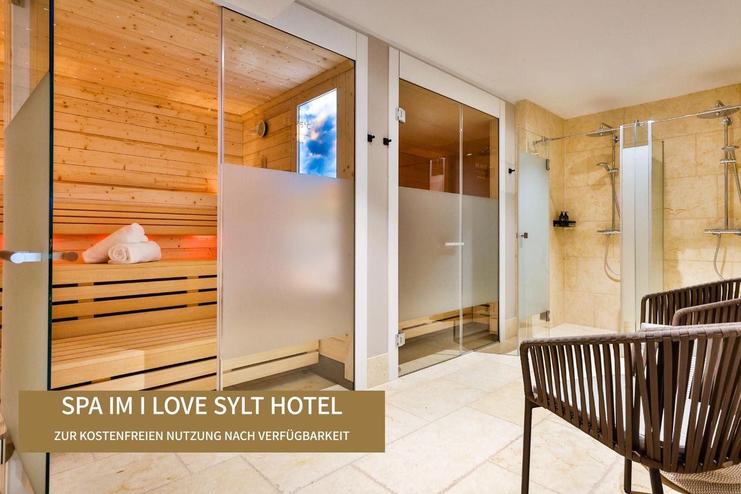 Als Gast genießen Sie kostenfreien Zugang (nach Anmeldung und Verfügbarkeit) zum Wellnessbereich mit Schwimmbad, zwei Saunen und Fitnessraum im I Love Sylt Hotel in der Elisabethstraße 15 – nur wenige Gehminuten entfernt. Ob Sie morgens Ihre Bahnen ziehen, im Dampfbad entspannen oder sich sportlich auspowern möchten – Ihr persönliches Wohlbefinden steht im Mittelpunkt.
