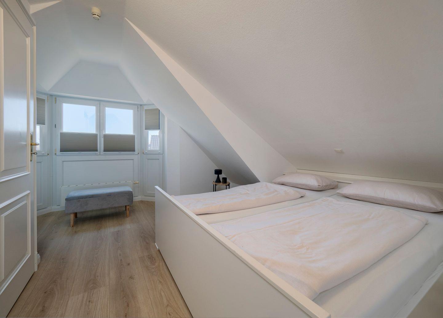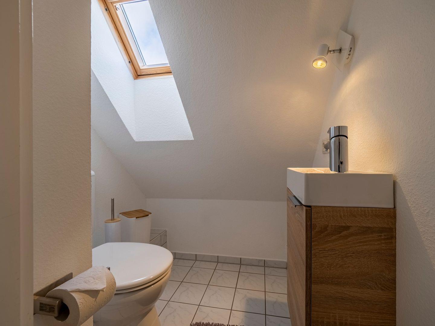 Im Dachgeschoss befindet sich der Schlafraum mit einem komfortablen Doppelbett für erholsame Nächte. Zusätzlich gibt es ein Gäste-WC, das Ihnen Komfort bietet.