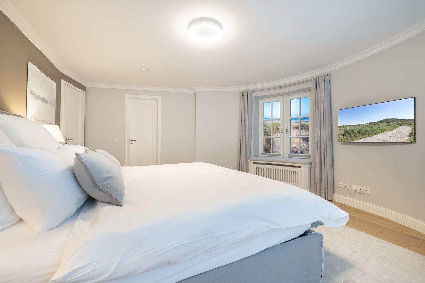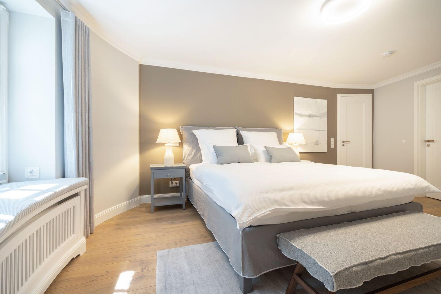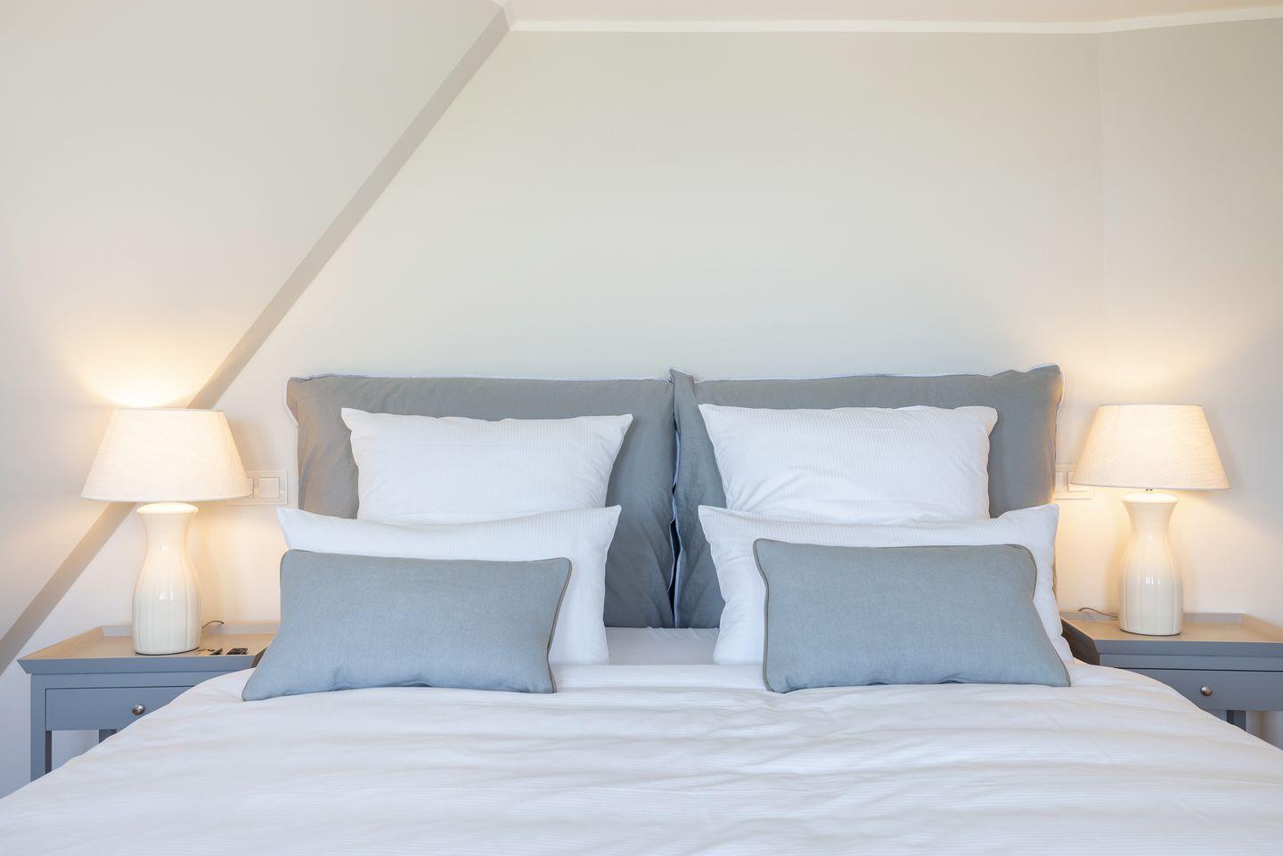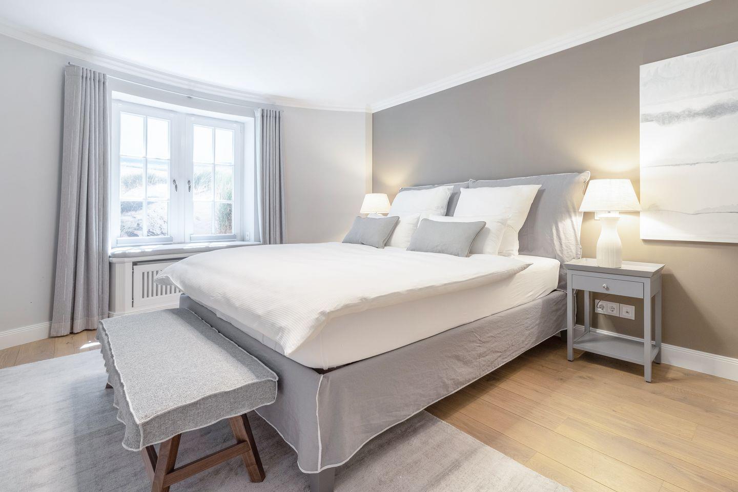 Im Obergeschoss erwarten Sie zwei großzügige Schlafzimmer, die mit hochwertigen Doppelbetten ausgestattet sind und idealen Komfort für erholsame Nächte bieten. Das Hauptschlafzimmer zur Ostseite ermöglicht einen einmaligen Blick über das Wattenmeer und verfügt über ein elektrisch versenkbares TV. Hochwertige Holzeinbauten unterstreichen den luxuriösen Charakter der Einrichtung. Ein weiteres, elegantes Schlafzimmer ist zur Westseite ausgerichtet und mit einem Doppelbett, Kleiderschrank und TV ausgestattet.
