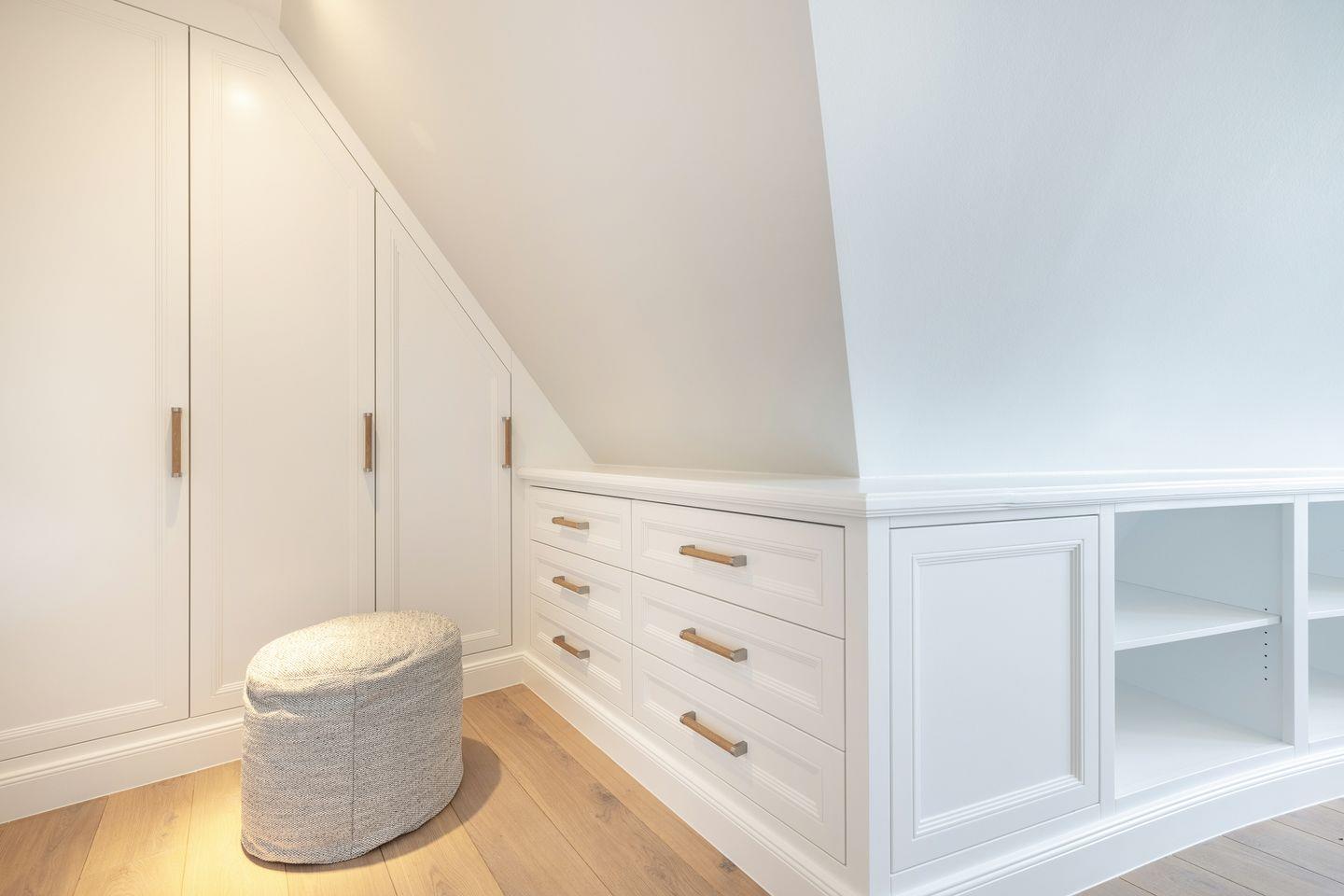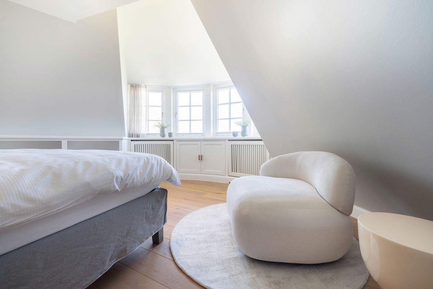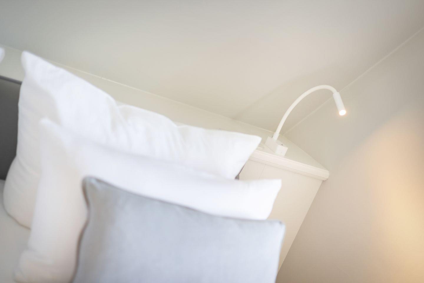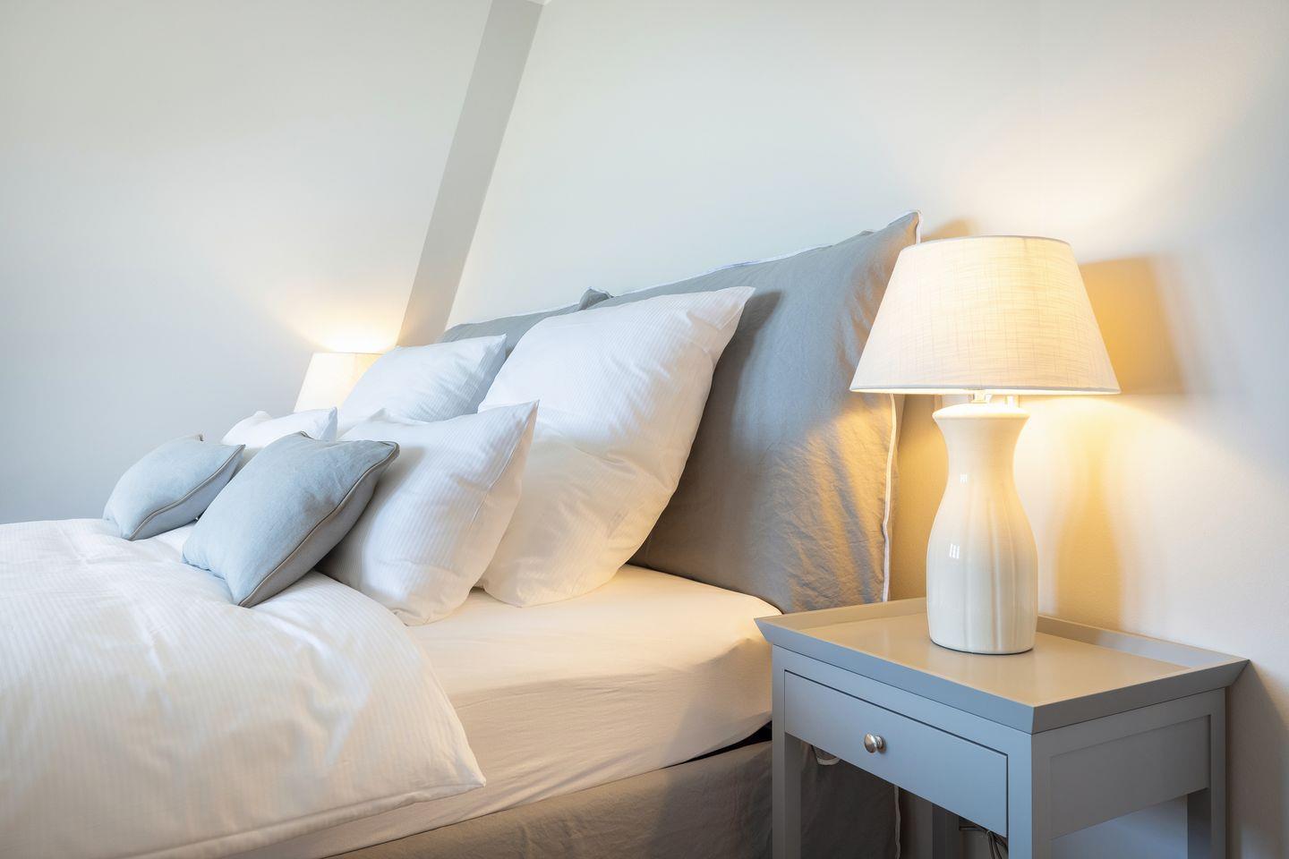 Im Obergeschoss erwarten Sie zwei großzügige Schlafzimmer, die mit hochwertigen Doppelbetten ausgestattet sind und idealen Komfort für erholsame Nächte bieten. Das Hauptschlafzimmer zur Ostseite ermöglicht einen einmaligen Blick über das Wattenmeer und verfügt über ein elektrisch versenkbares TV. Hochwertige Holzeinbauten unterstreichen den luxuriösen Charakter der Einrichtung. Ein weiteres, elegantes Schlafzimmer ist zur Westseite ausgerichtet und mit einem Doppelbett, Kleiderschrank und TV ausgestattet.