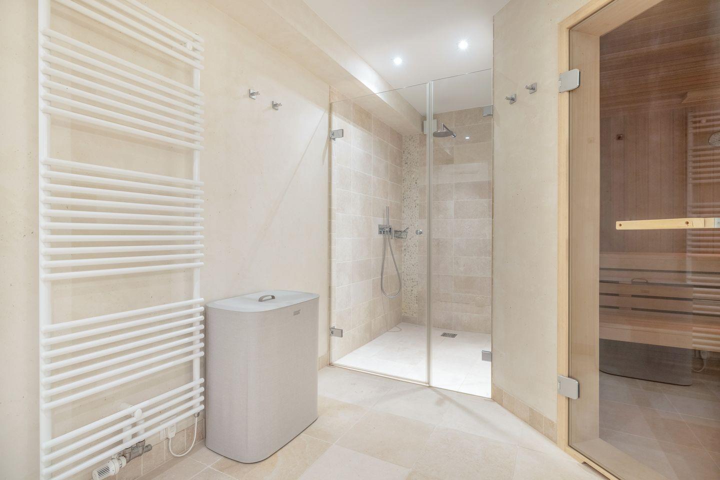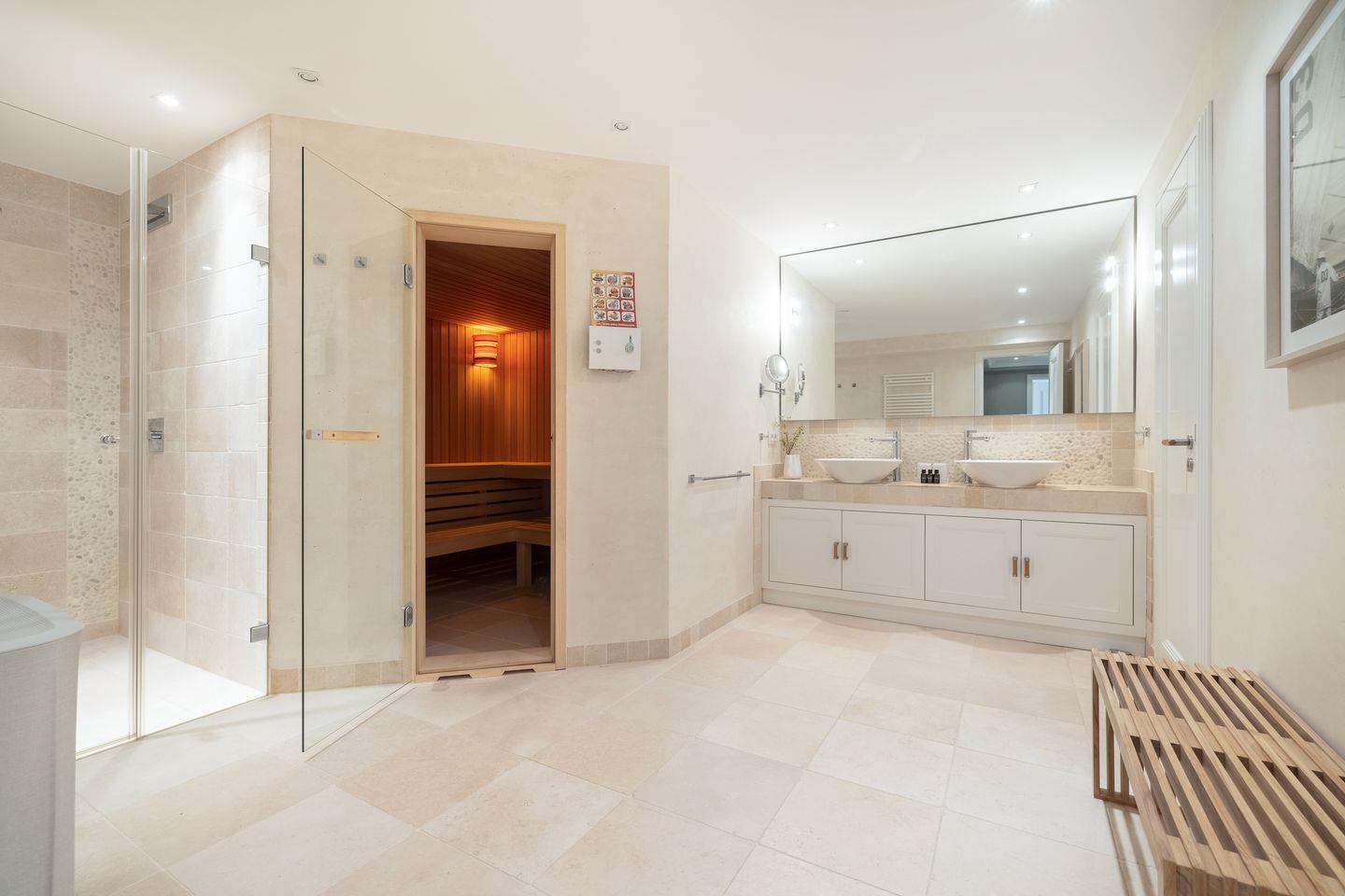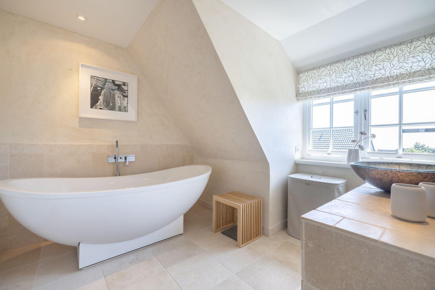 Die beiden stilvollen Badezimmer bieten höchsten Komfort: Ein großzügiges Vollbad im OG verfügt über eine Wanne sowie eine separate Regendusche und Tageslicht für ein besonders angenehmes Ambiente. Das Wellnessbad mit Sauna und geräumiger Regendusche befindet sich im UG und kann als zweites Bad genutzt werden. Das separate WC im UG verfügt über Tageslicht. Ein Gäste-WC im EG steht für zusätzlichen Komfort zur Verfügung. Highlight dieses Ferienhauses ist ein separater Fitnessraum mit Technogym Ausstattung und TV.