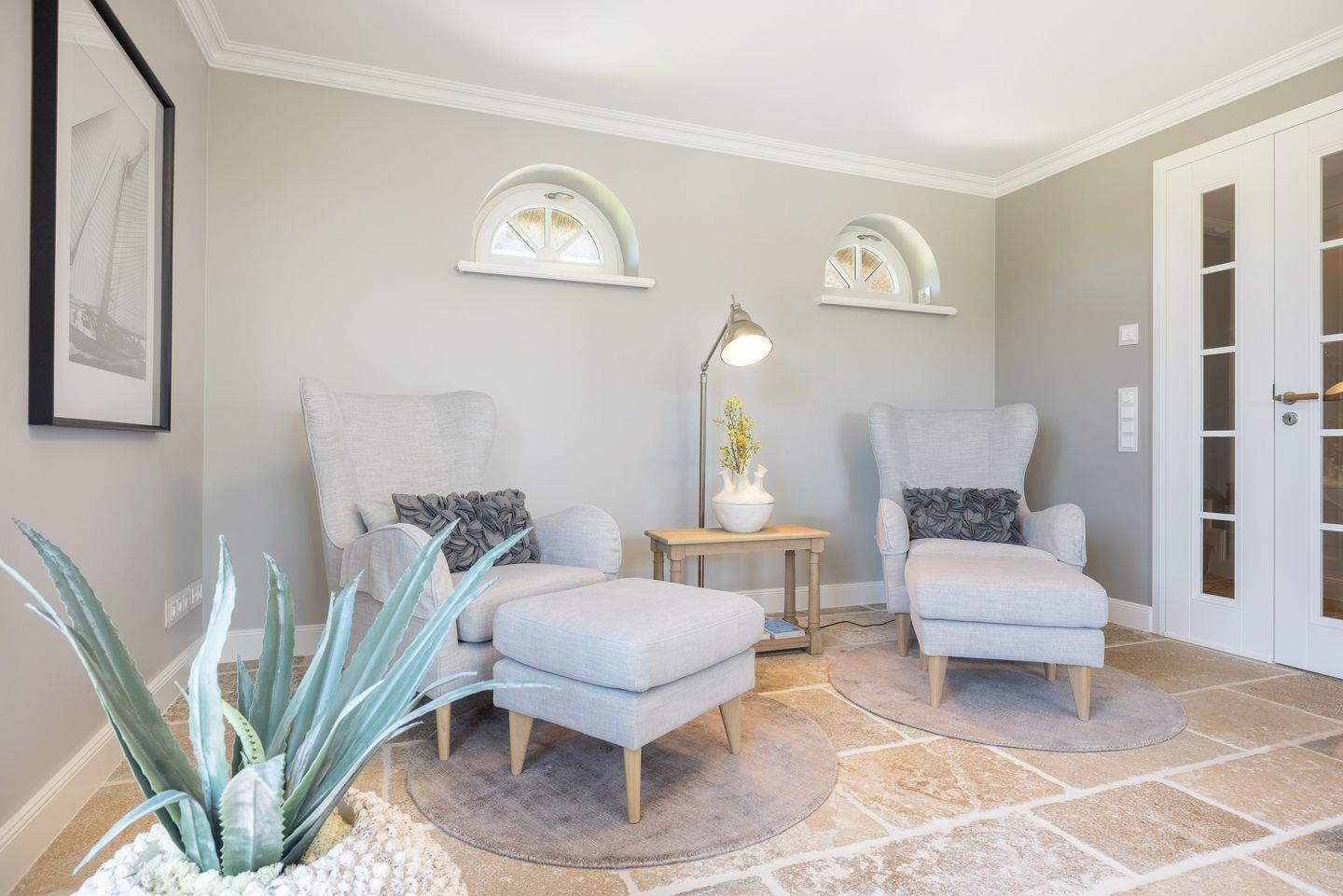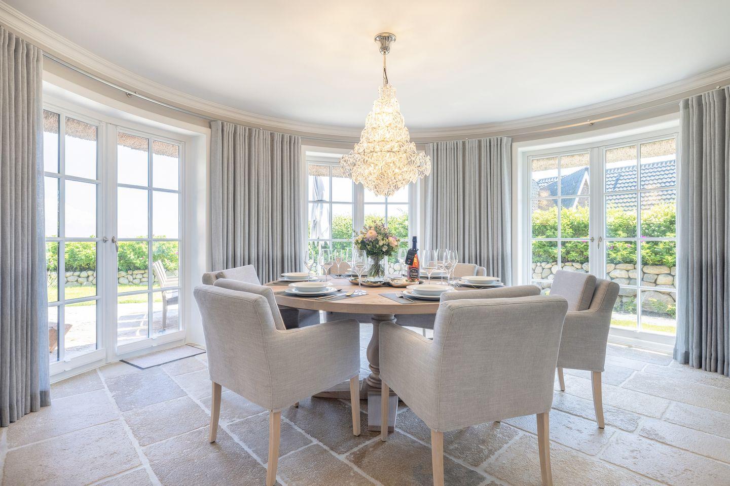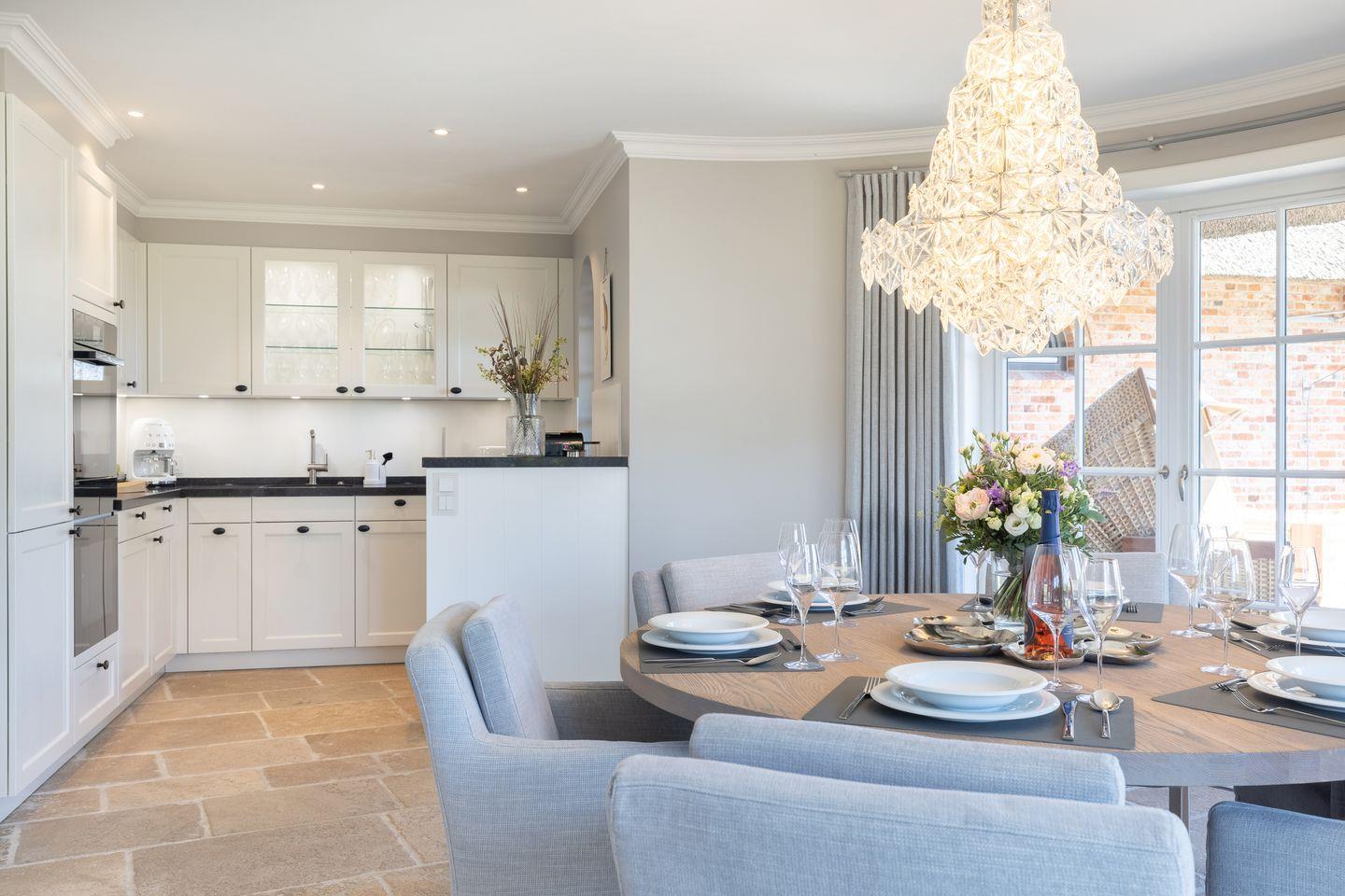 Die exklusive, offen gestaltete Küche mit Weinkühlschrank lädt dazu ein, köstliche Mahlzeiten zu zaubern, die Sie im großzügigen Essbereich genießen können. Von hier aus haben Sie direkten Zugang zur Ostterrasse, die einen atemberaubenden Blick über das Wattenmeer bietet. Der separate, gemütliche Wohnbereich mit Kamin und direktem Zugang zur Westterrasse ist der perfekte Ort, um die Abende zu verbringen und die Wärme des Feuers zu genießen.