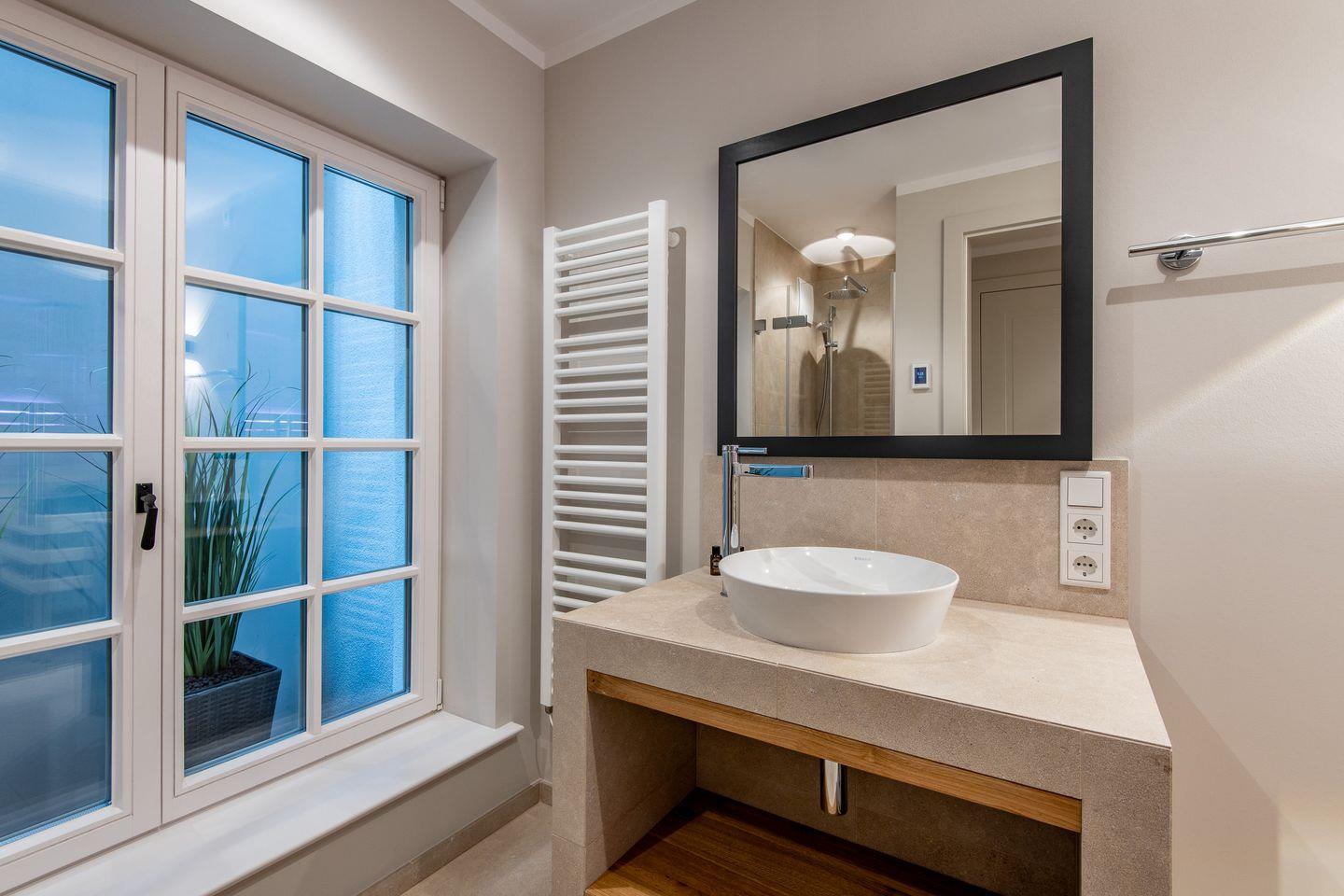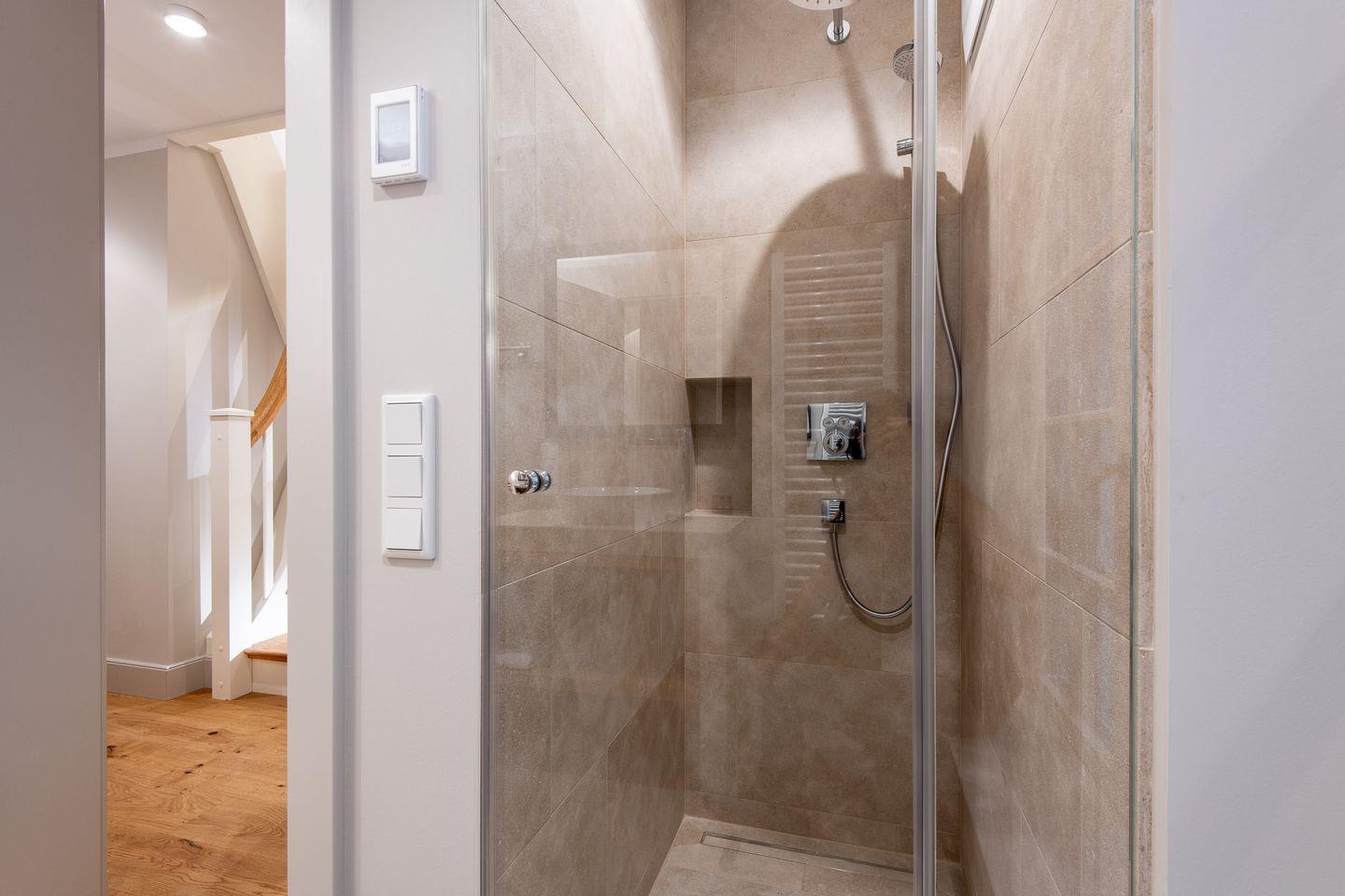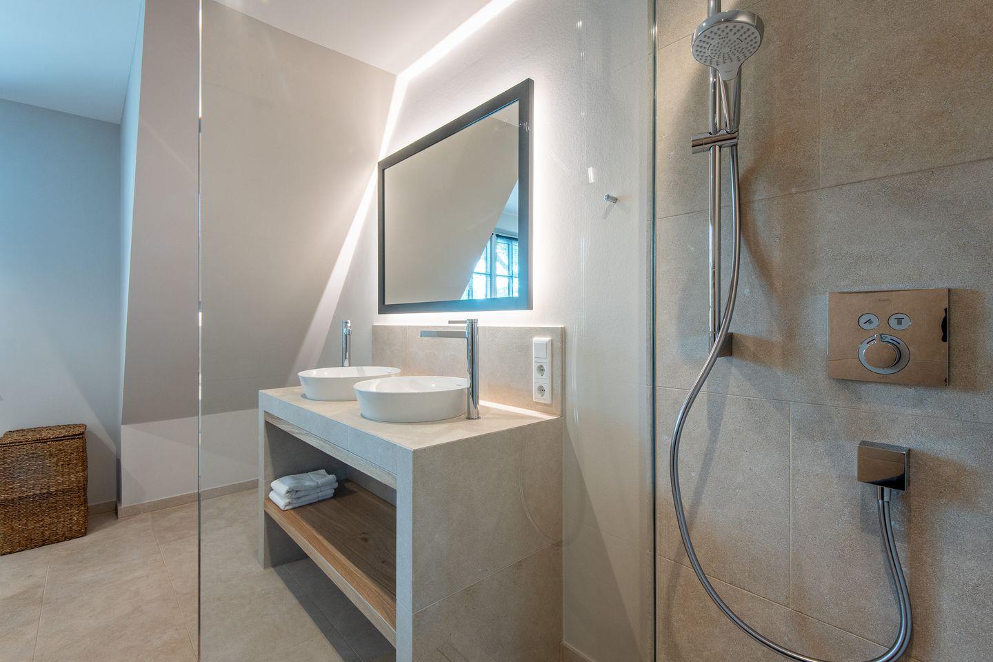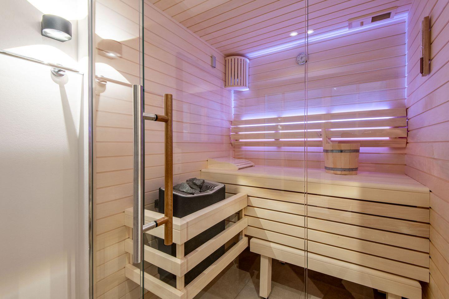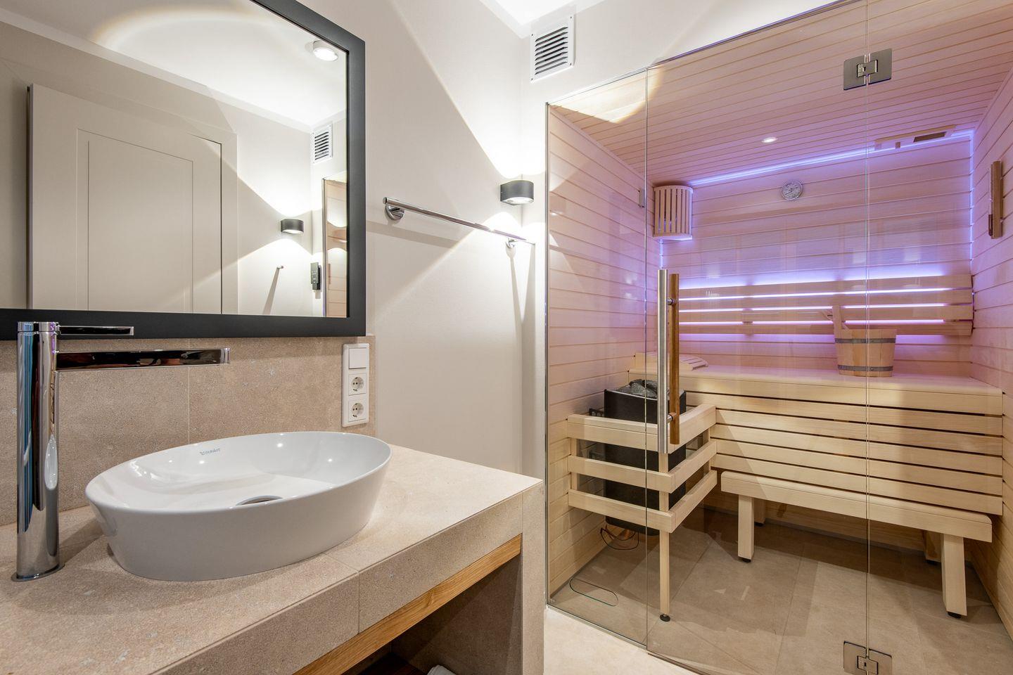 Die Wohnung verfügt über zwei moderne Badezimmer sowie ein zusätzliches Gäste-WC für höchsten Komfort. Das luxuriöse Wellnessbad mit eigener Sauna und bodengleicher Dusche bietet Entspannung pur, während das zweite Badezimmer mit Tageslicht, bodengleicher Dusche, Doppelwaschtisch, separatem WC und Handtuchwärmer ebenfalls hervorragend ausgestattet ist.
