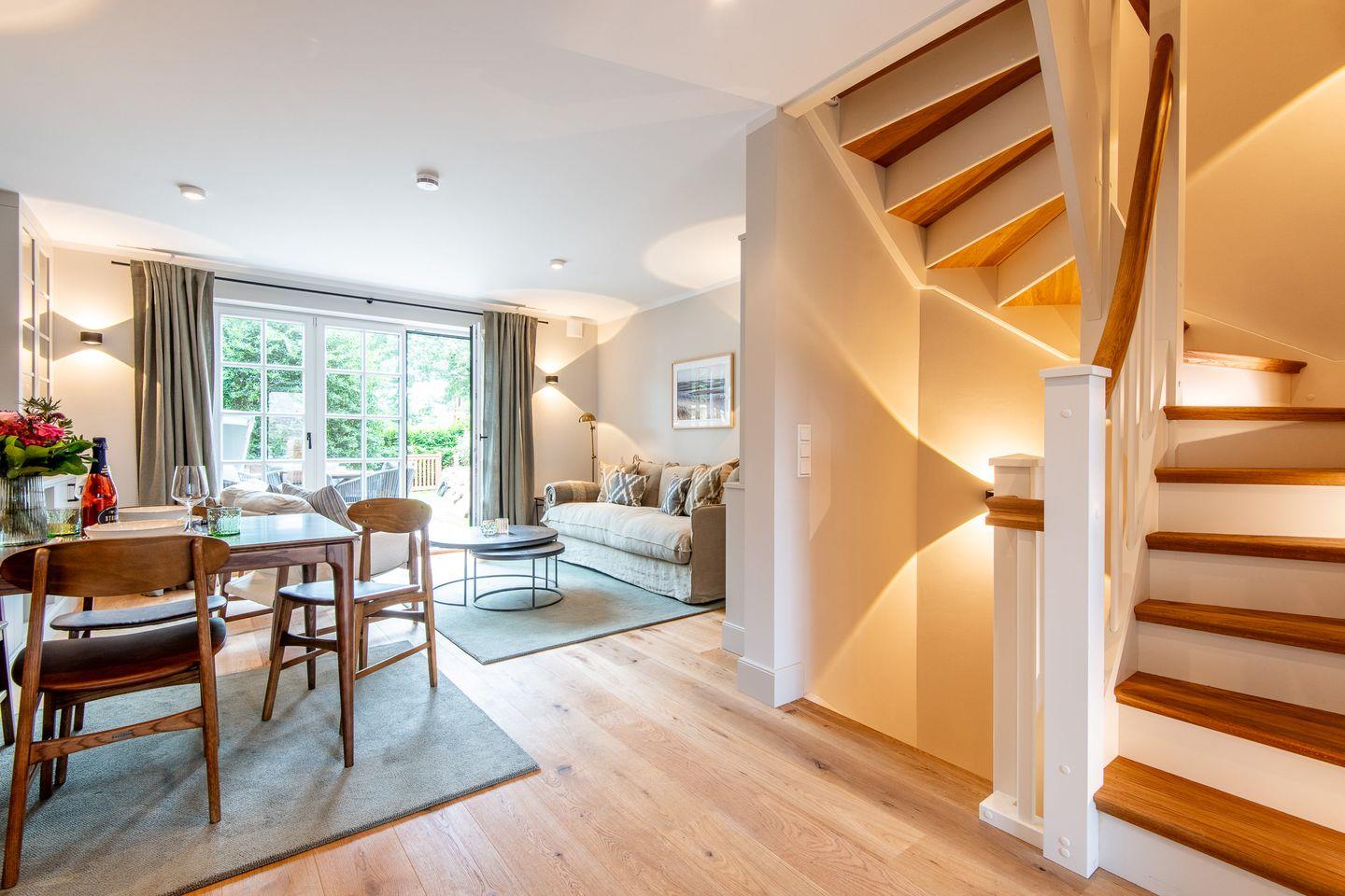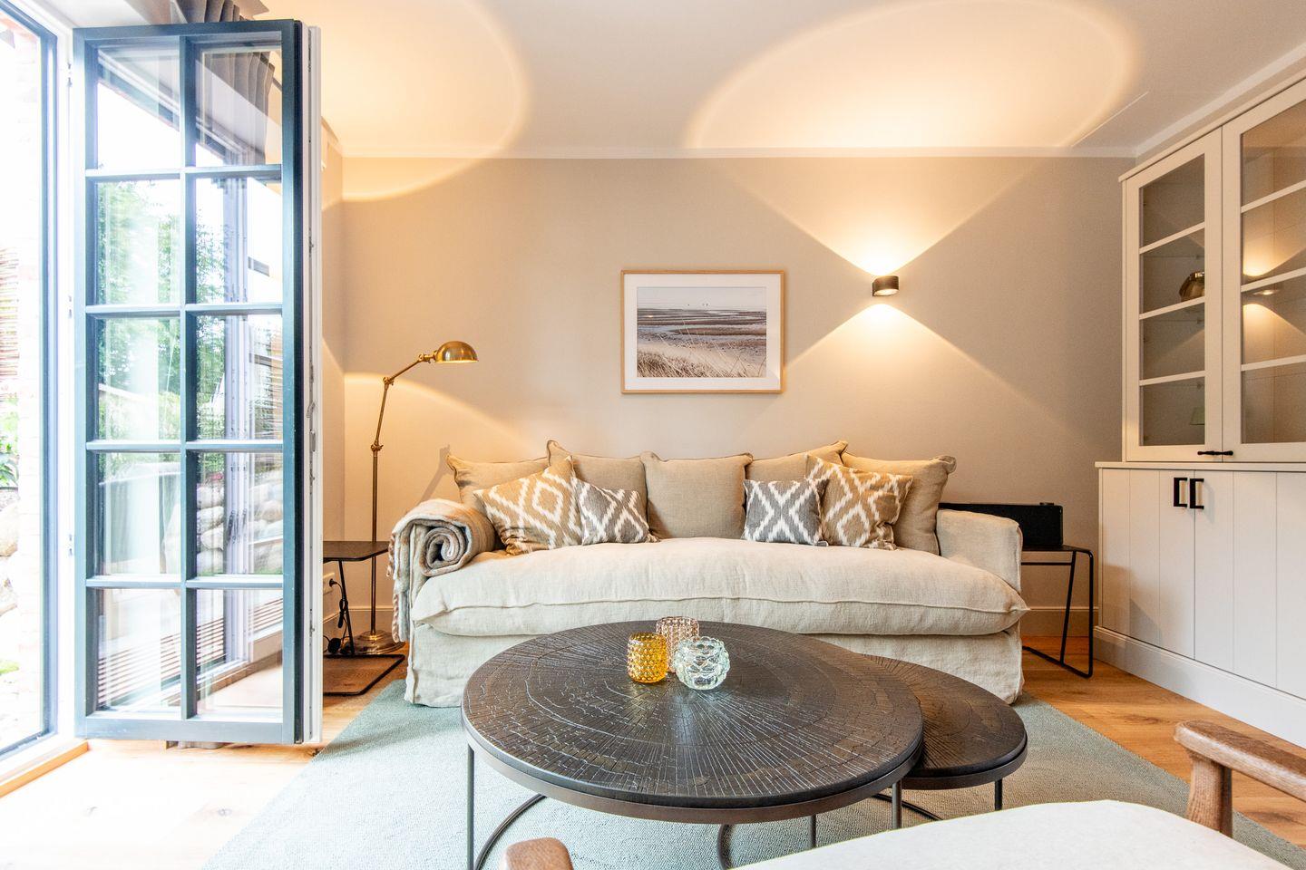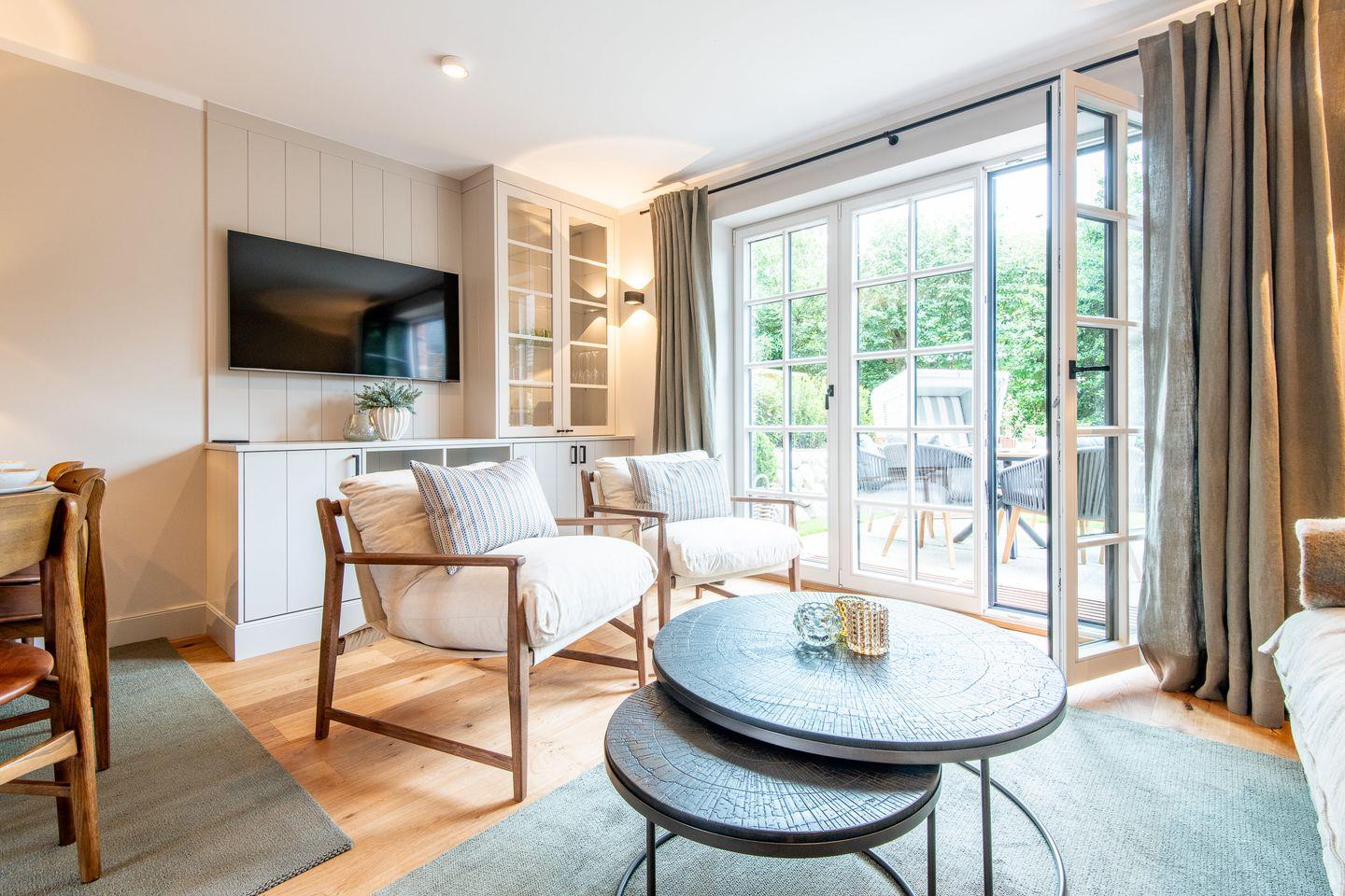 Das großzügige Wohn- und Esszimmer ist der perfekte Ort zum Entspannen und geselligen Beisammensein. Neben einem gemütlichen Sofa und einem Esstisch für 6 Personen erwartet Sie hier der Zugang zur nach Süden ausgerichteten Terrasse und einem idyllischen Garten mit traditionellem Friesenwall – ideal, um die Sonne und die frische Meeresluft zu genießen. Die moderne Ausstattung, gepaart mit stilvollen Details, macht das Wohnzimmer zu einem Ort der Erholung.