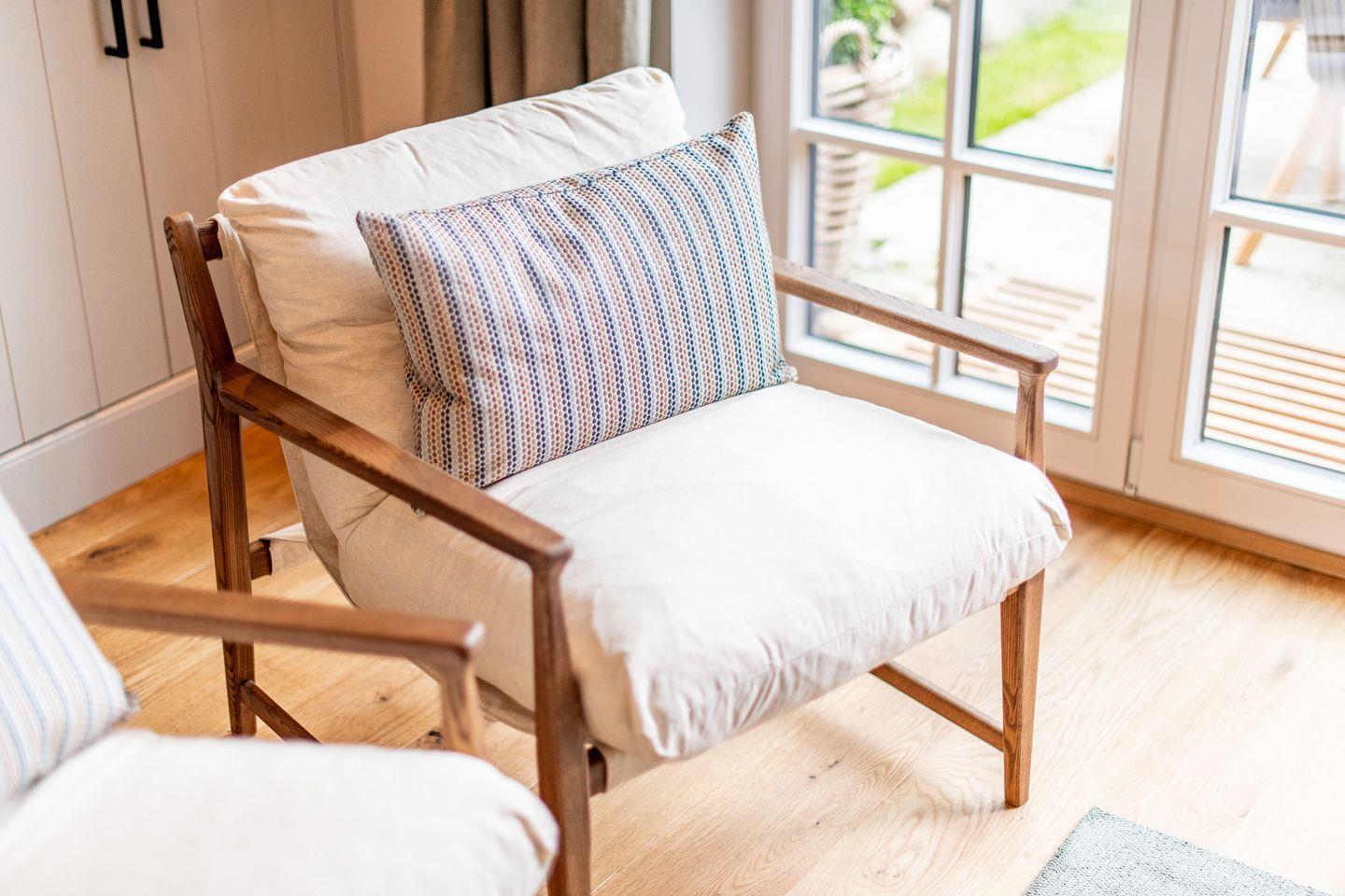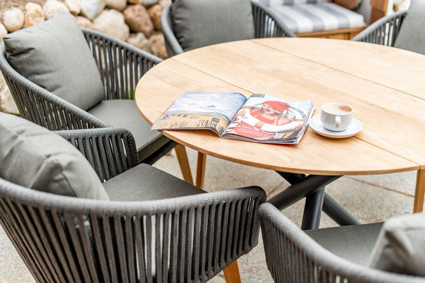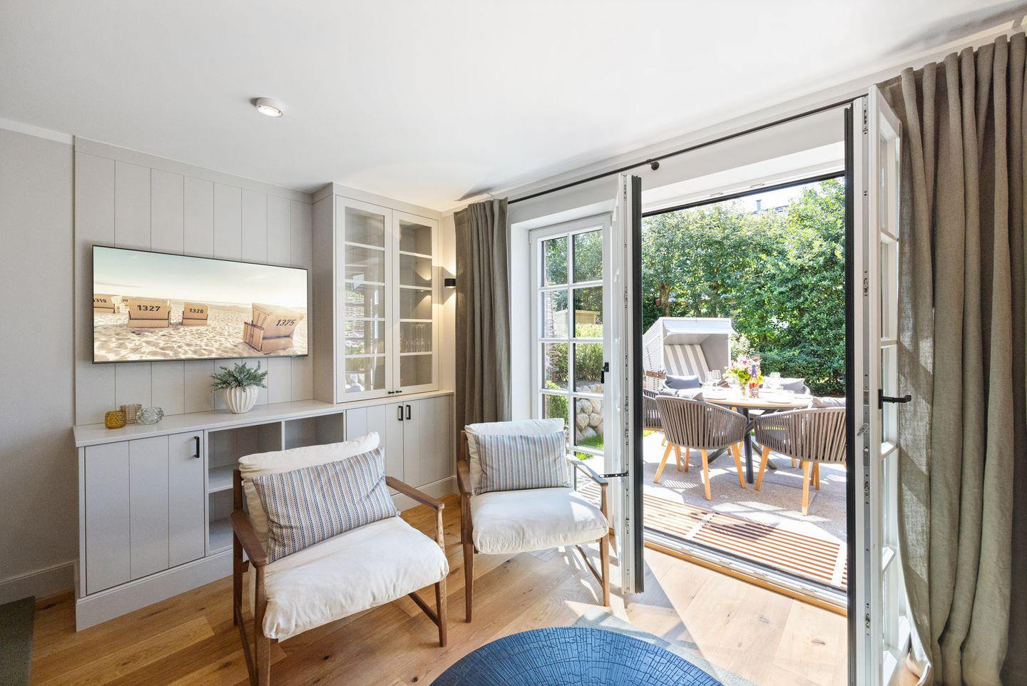 Das großzügige Wohn- und Esszimmer ist der perfekte Ort zum Entspannen und geselligen Beisammensein. Neben einem gemütlichen Sofa und einem Esstisch für 6 Personen erwartet Sie hier der Zugang zur nach Süden ausgerichteten Terrasse und einem idyllischen Garten mit traditionellem Friesenwall – ideal, um die Sonne und die frische Meeresluft zu genießen. Die moderne Ausstattung, gepaart mit stilvollen Details, macht das Wohnzimmer zu einem Ort der Erholung.
