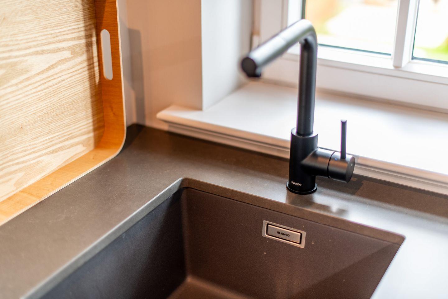 Die offene Küche ist ein Highlight des Hauses: Mit eleganten Nussbaumholzfronten, einer Natursteinarbeitsplatte und durchdachter Beleuchtung ist sie nicht nur funktional, sondern ein echter Hingucker. Ausgestattet mit modernen Geräten wie einem Induktionskochfeld mit Wrasenabzug, Einbaubackofen mit Dampffunktion und einer Kühl-/Gefrierkombination von Miele, bietet sie alles, was das Herz eines Hobbykochs begehrt.