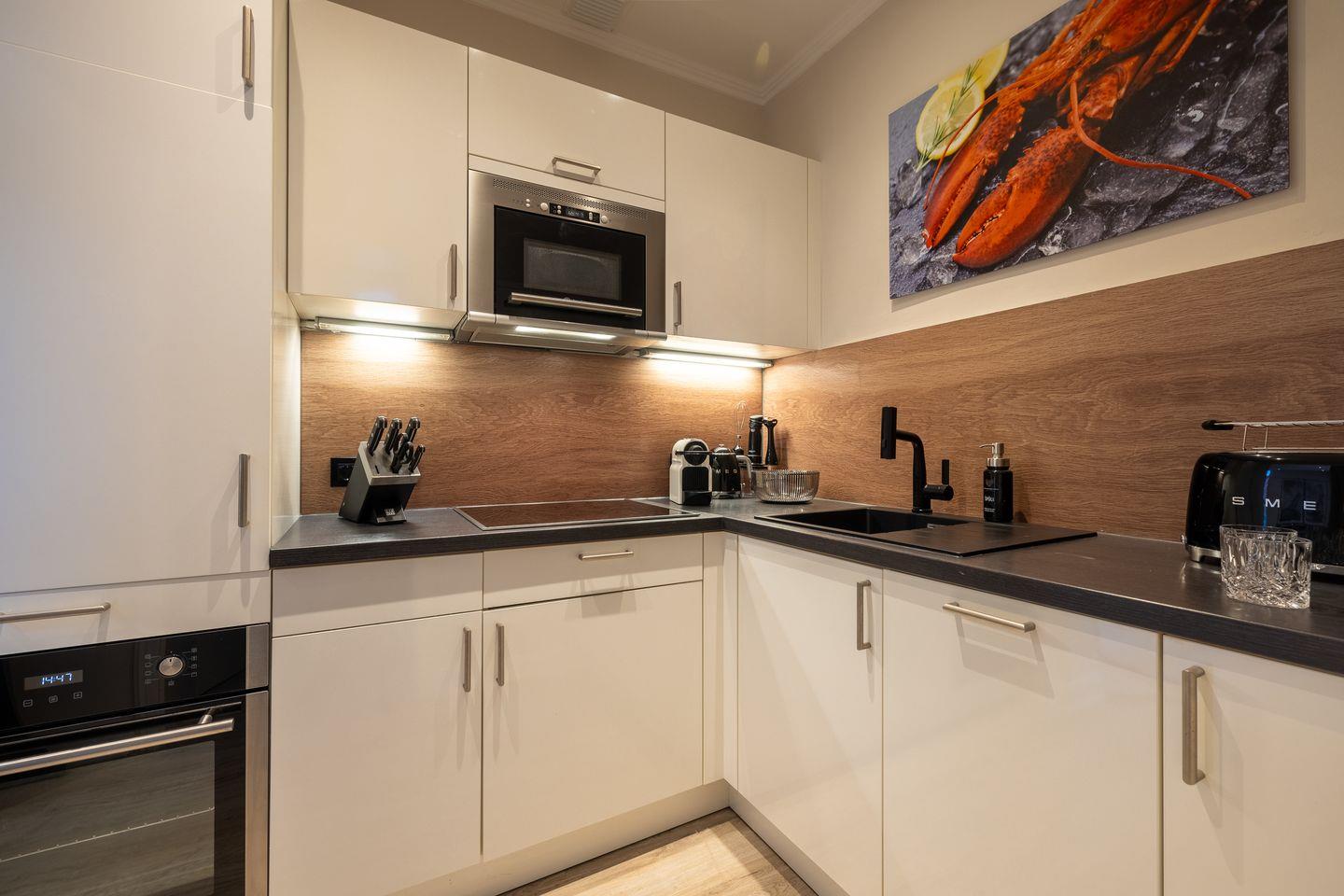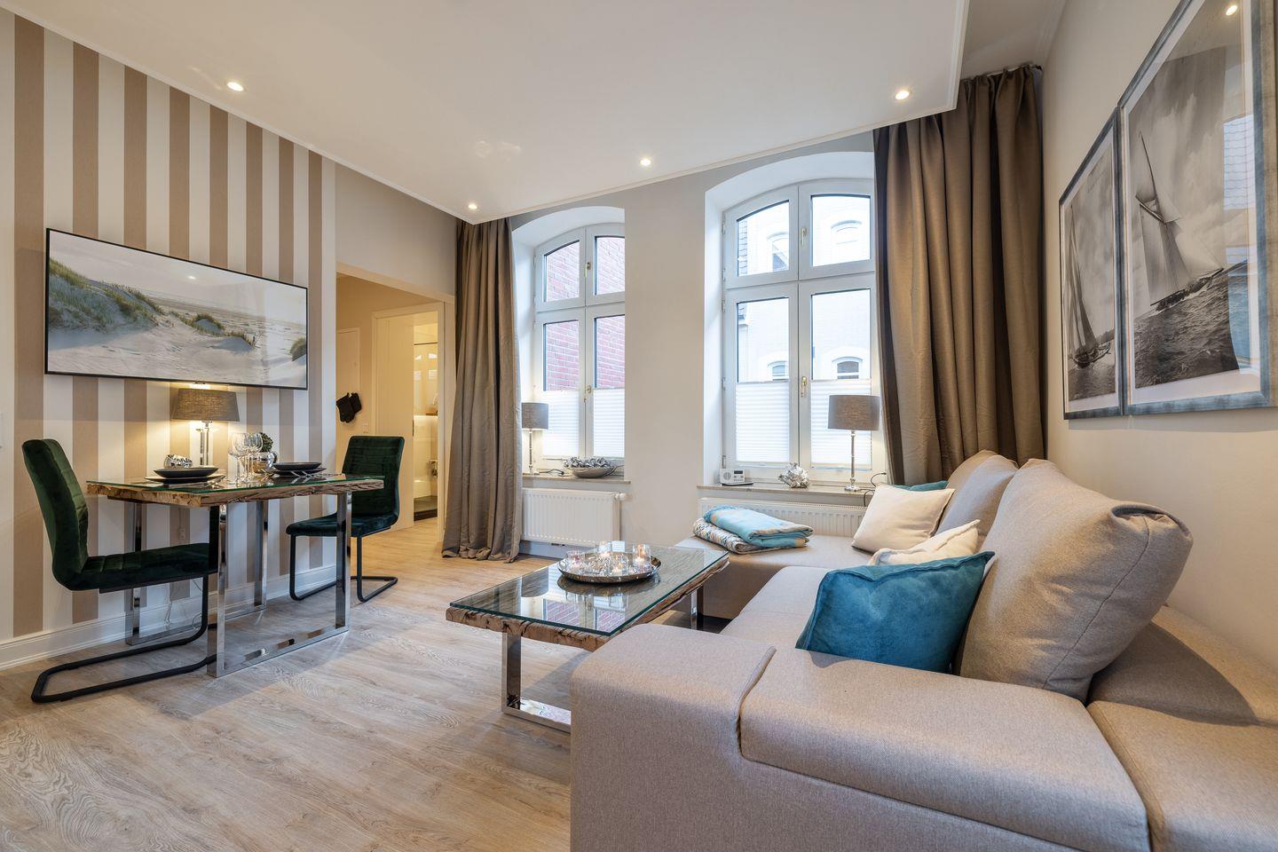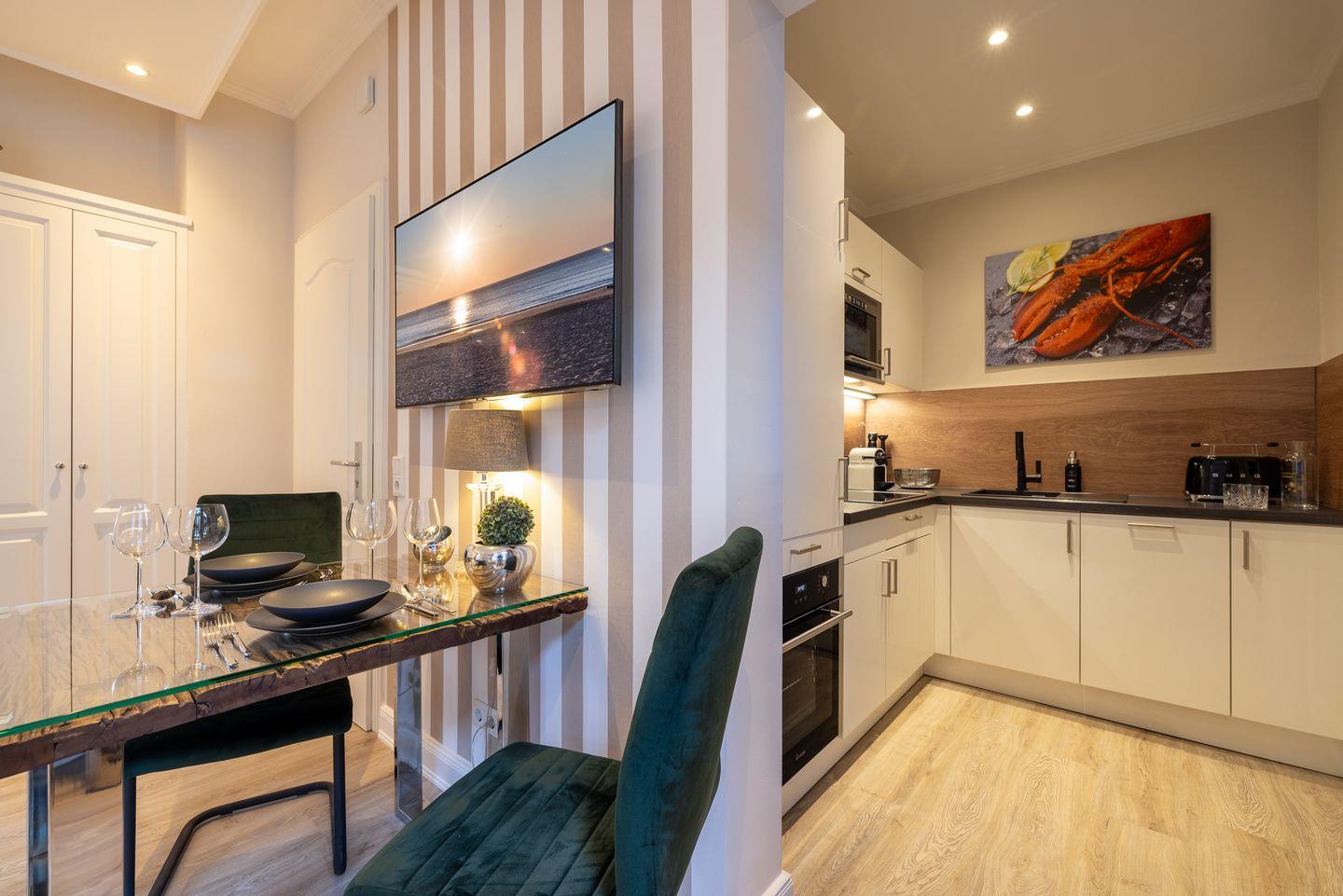 Gemütlicher Wohnbereich mit TV, JBL-Lautsprecher und Essplatz, offene Küche mit Mikrowelle, Induktionskochfeld, Umluft-Backofen, Geschirrspüler, hochwertigem Messerblock und Kaffeemaschine. Der großzügige Balkon ist mit Gartenmöbeln und einem Strandkorb (nutzbar von April bis Oktober) ausgestattet und lädt zum Entspannen ein. Das Schlafzimmer verfügt über ein Doppelbett (2x100x200cm), einen beleuchteten Kleiderschrank und einen zusätzlichen TV. Das modern ausgeleuchtete Badezimmer bietet eine Walk-In-Dusche, einen Anti-Fog-Spiegel und ein WC.