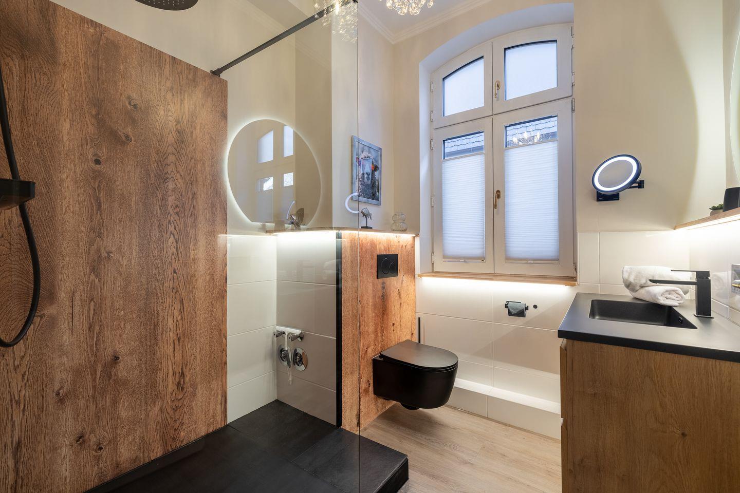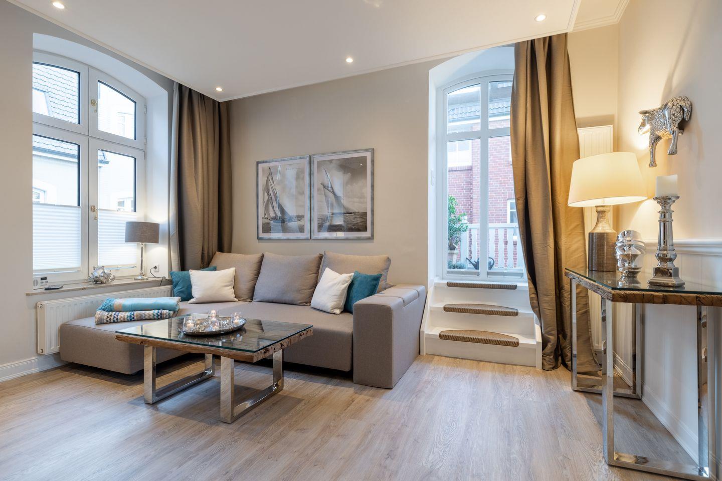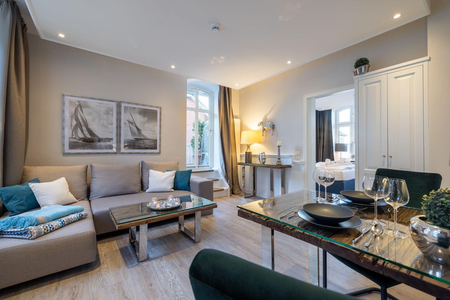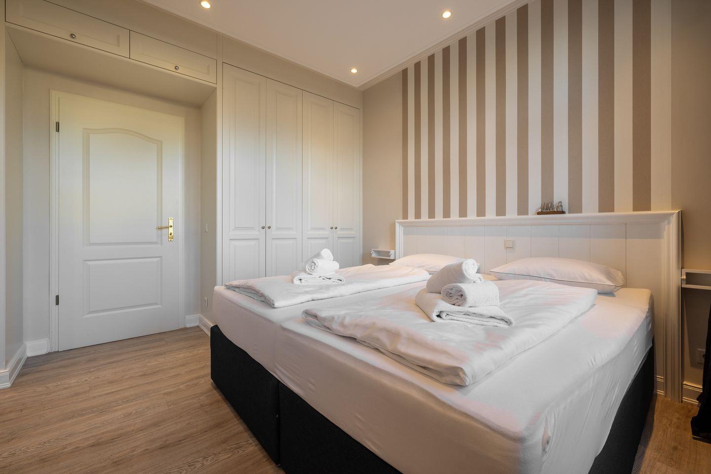 Gemütlicher Wohnbereich mit TV, JBL-Lautsprecher und Essplatz, offene Küche mit Mikrowelle, Induktionskochfeld, Umluft-Backofen, Geschirrspüler, hochwertigem Messerblock und Kaffeemaschine. Der großzügige Balkon ist mit Gartenmöbeln und einem Strandkorb (nutzbar von April bis Oktober) ausgestattet und lädt zum Entspannen ein. Das Schlafzimmer verfügt über ein Doppelbett (2x100x200cm), einen beleuchteten Kleiderschrank und einen zusätzlichen TV. Das modern ausgeleuchtete Badezimmer bietet eine Walk-In-Dusche, einen Anti-Fog-Spiegel und ein WC.