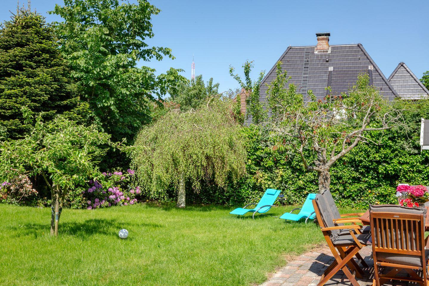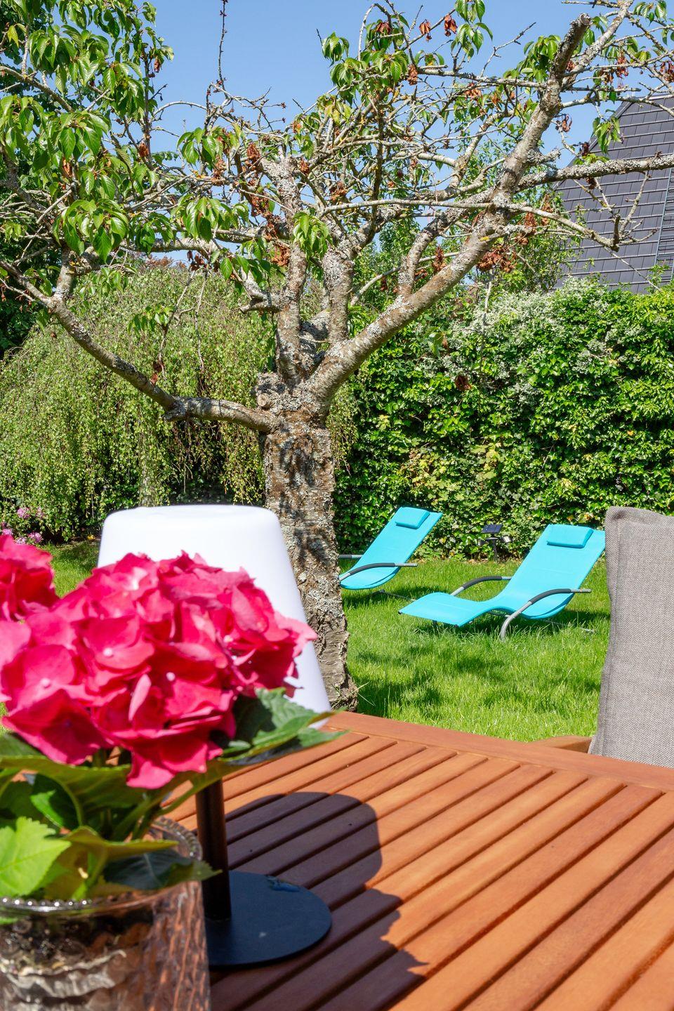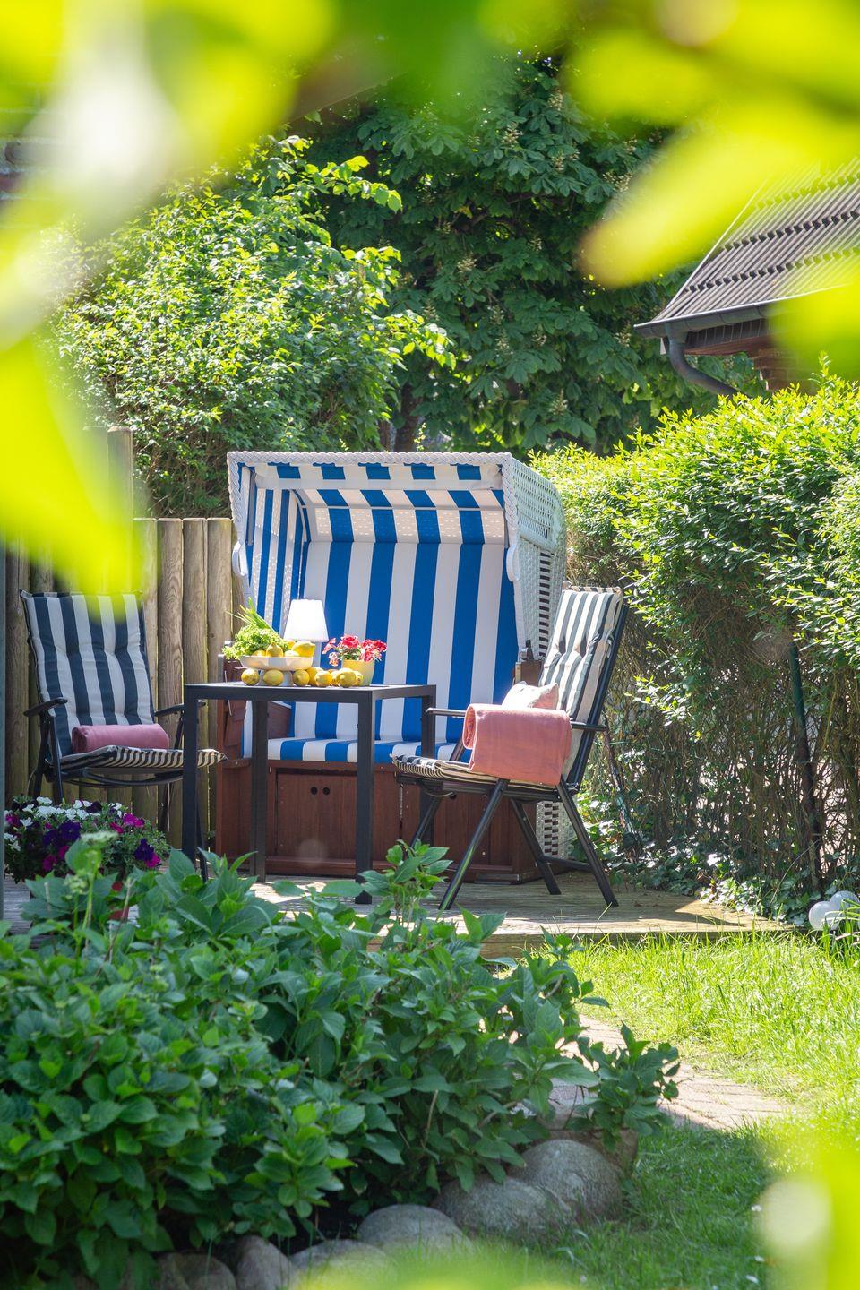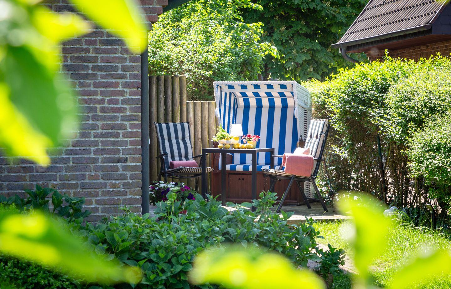 Entspannen Sie sich im Wohnbereich vor dem Smart-TV oder nutzen Sie die gemütliche Terrasse im großen blickdicht eingewachsenen Garten, der mit einem Strandkorb, Gartenmöbeln und Sonnenliegen ausgestattet ist.