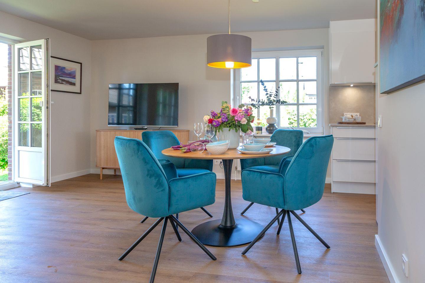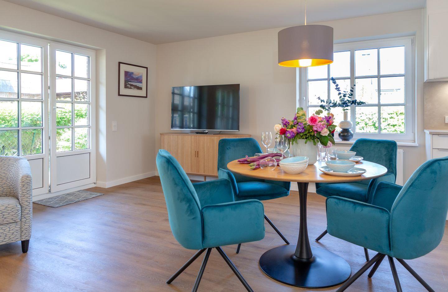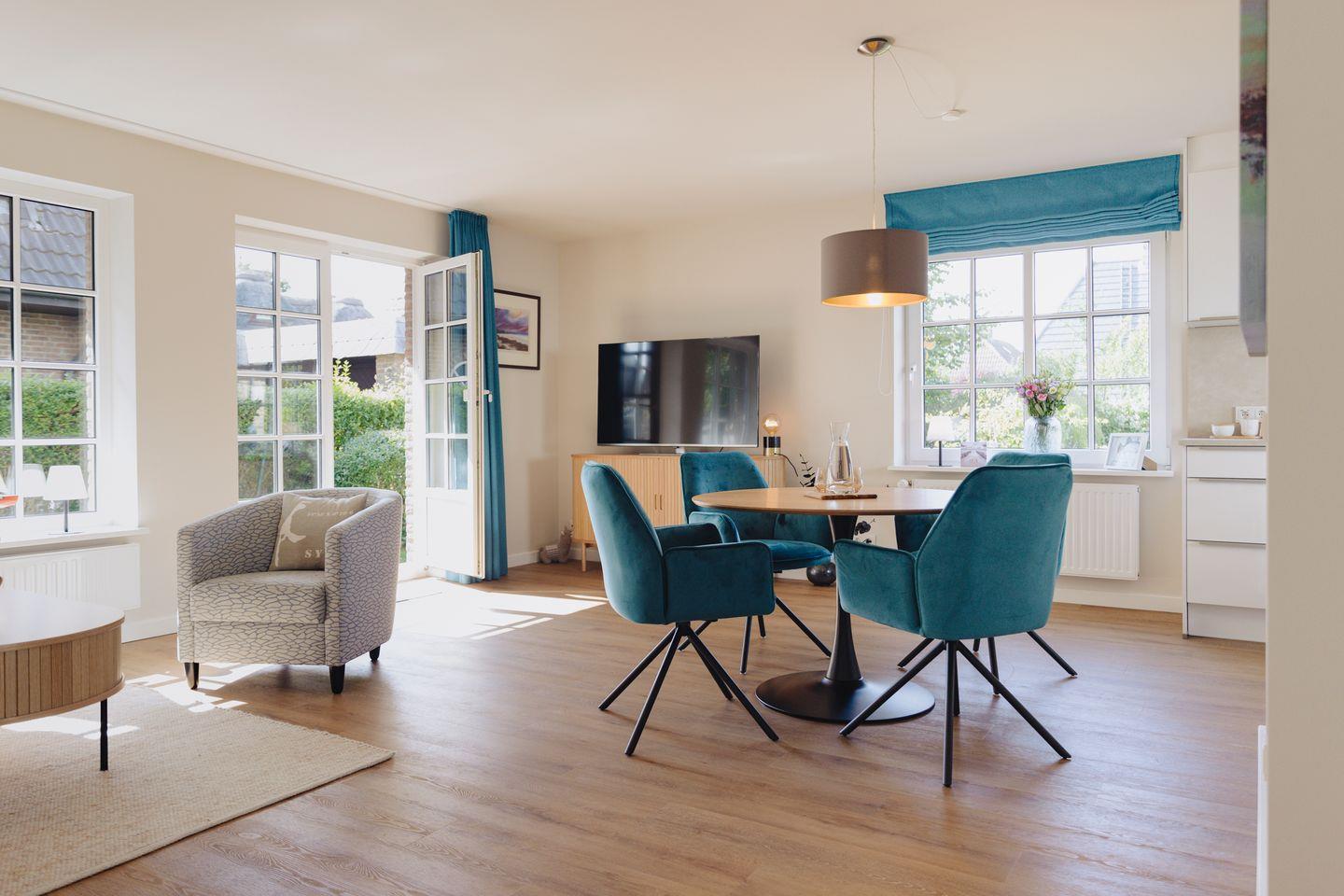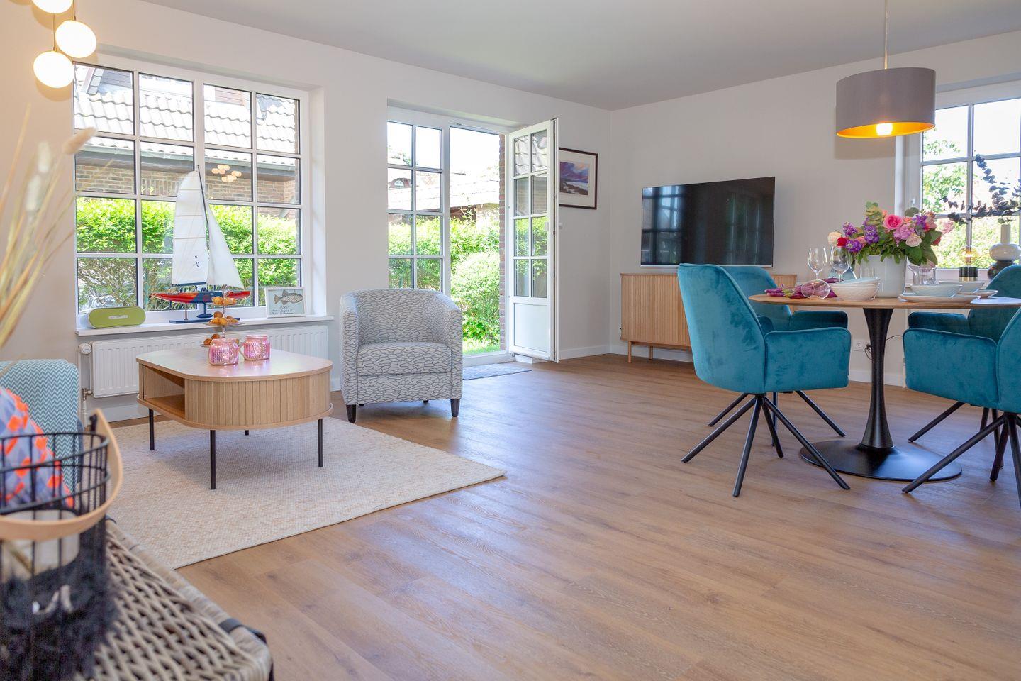 Entspannen Sie sich im Wohnbereich vor dem Smart-TV oder nutzen Sie die gemütliche Terrasse im großen blickdicht eingewachsenen Garten, der mit einem Strandkorb, Gartenmöbeln und Sonnenliegen ausgestattet ist.
