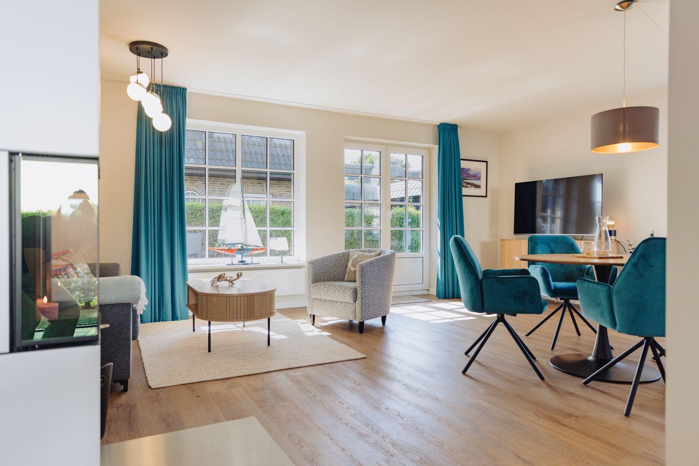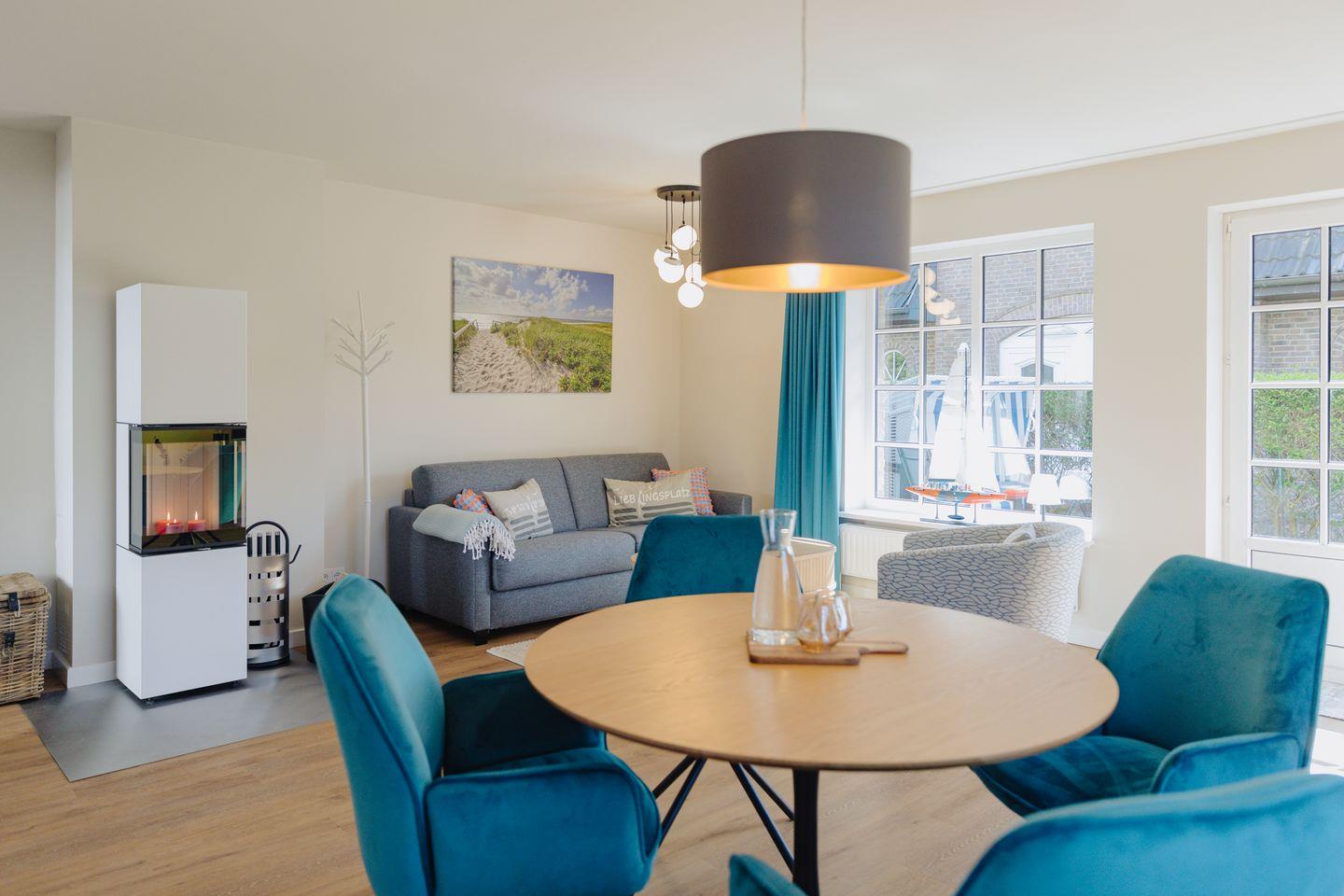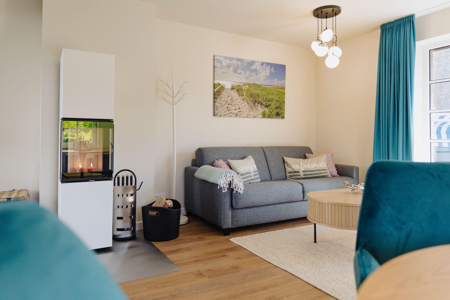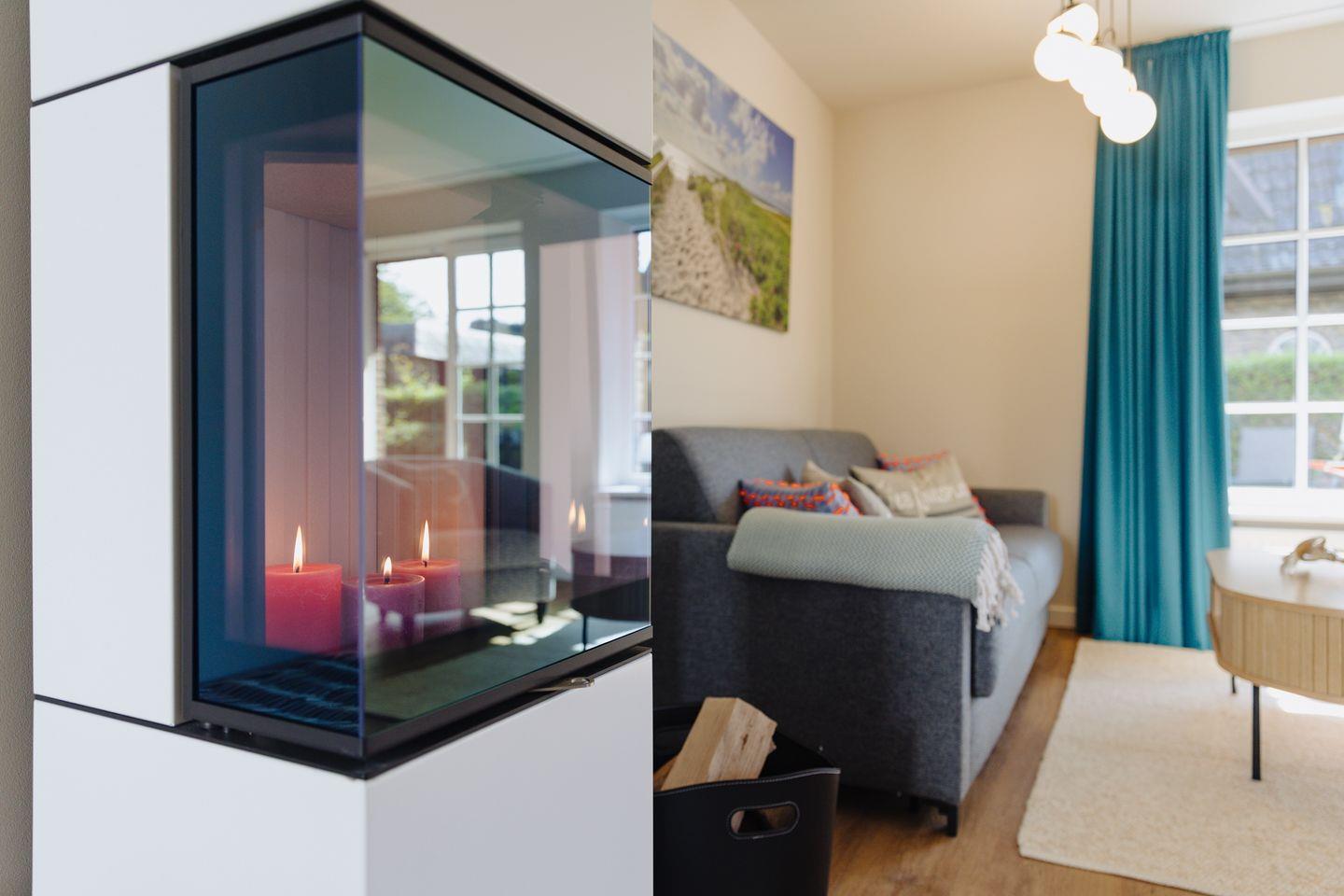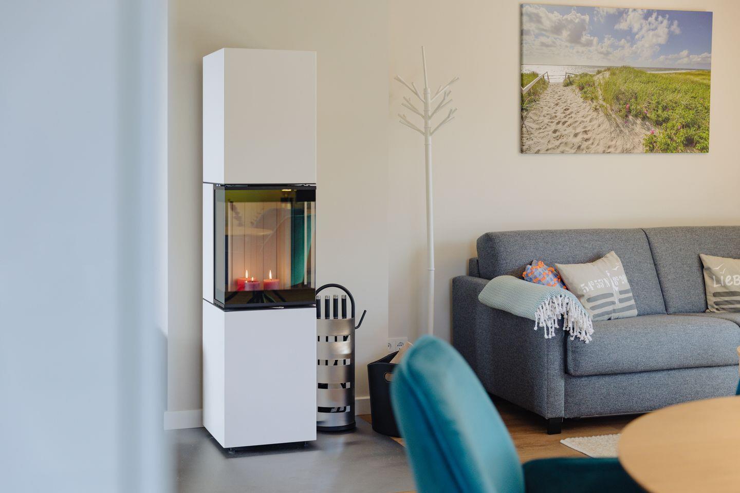 Für ein gemütliches und entspanntes Wohlfühl-Ambiente sorgt ein neu eingebauter Kamin, der sich im Wohnbereich der Wohnung befindet.