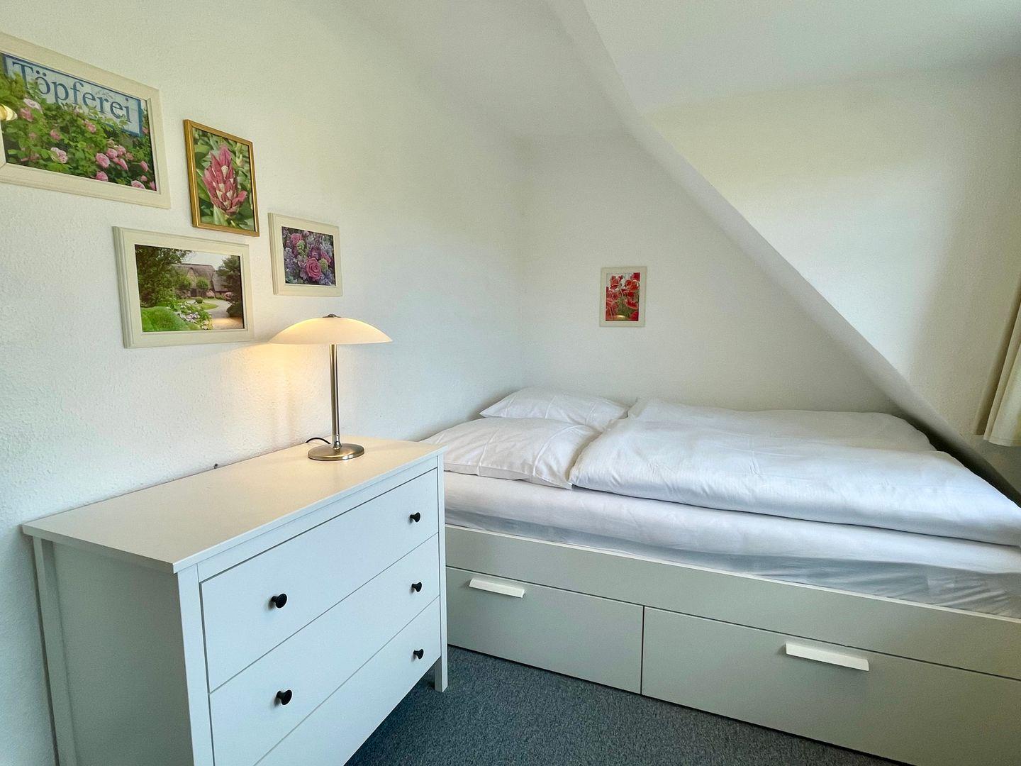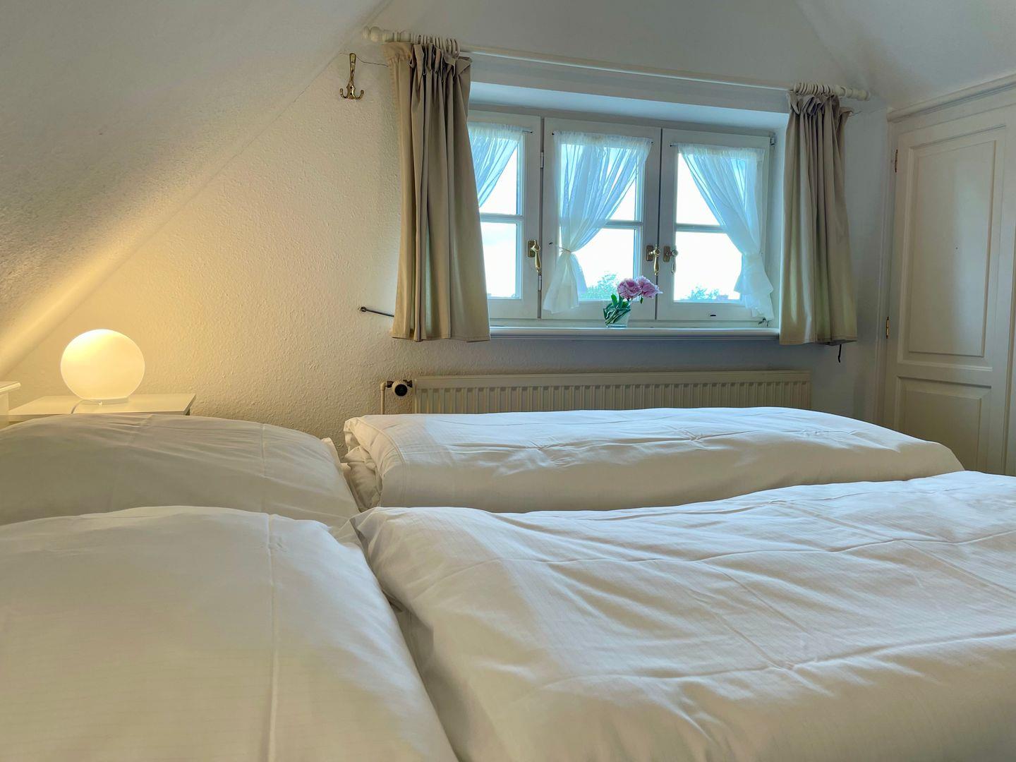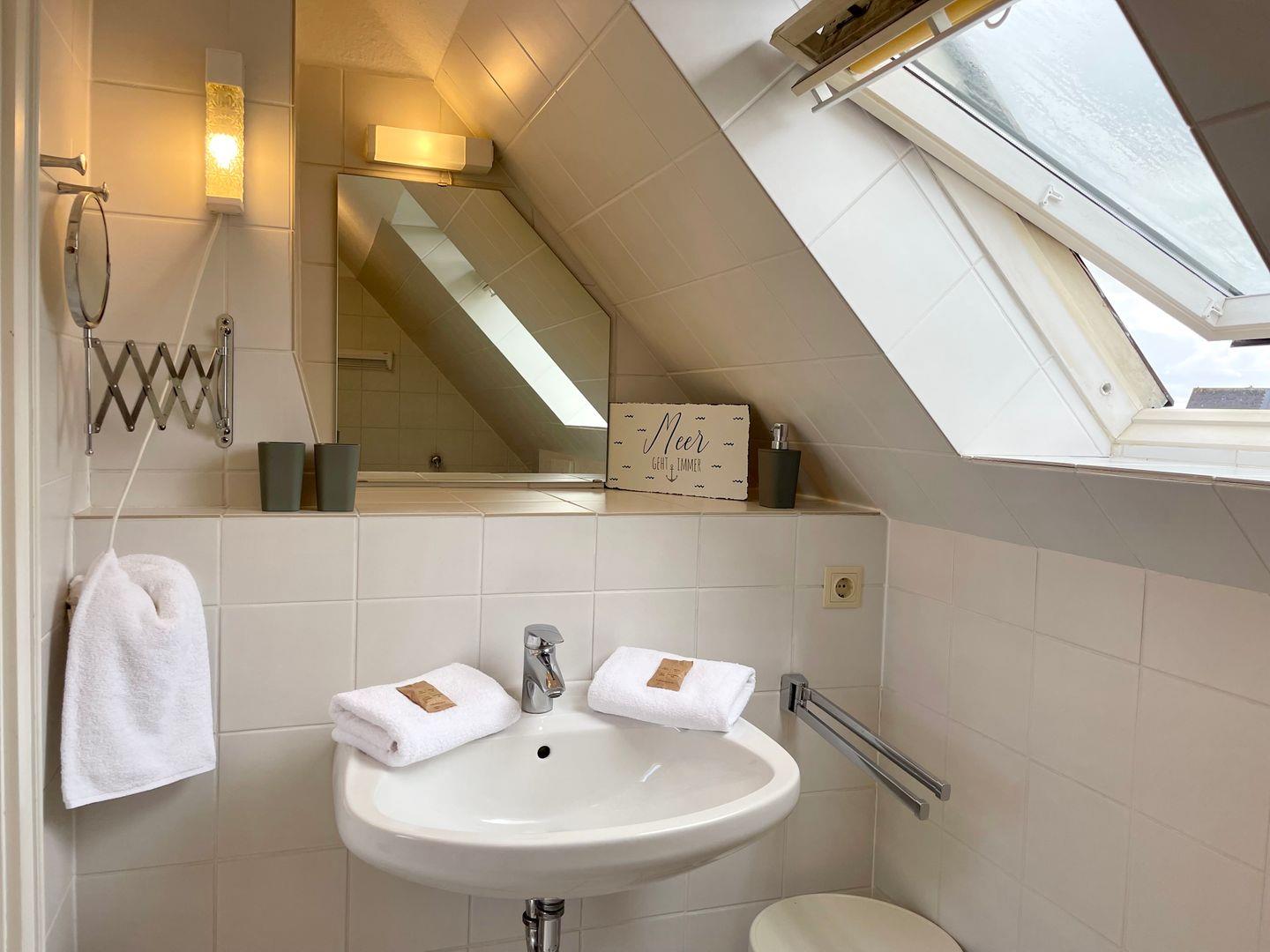 Die geräumige und modern eingerichtete Ferienwohnung verfügt über zwei gemütliche Schlafzimmer mit jeweils einem komfortablen Doppelbett und zwei Badezimmern, die den Aufenthalt für bis zu 4 Personen besonders angenehm machen. Die separate Küche ist voll ausgestattet mit Elektroherd, Mikrowelle, Geschirrspüler, Backofen, Kühlschrank, Kaffeemaschine, Toaster und Wasserkocher. Im Wohnbereich finden sich ein gemütlicher Essbereich, eine HiFi-Anlage, DVD-/Blu Ray-Player und TV. Die Wohnung ist allergikergeeignet und verfügt über kostenloses Internet mit WLAN. Außerdem steht den Gästen ein privater Parkplatz zur Verfügung. Zudem sind eine Waschmaschine, Wäschetrockner, Haartrockner, Staubsauger und Wäscheständer vorhanden. Beide Badezimmer haben Fenster, im OG befindet sich das Duschbad, im Bad des DG eine Badewanne. Wer auf der Suche nach einer komfortablen und hochwertig ausgestatteten Unterkunft ist, ist hier genau richtig.