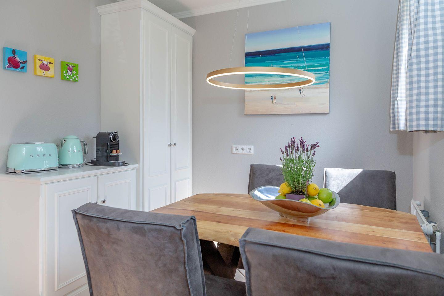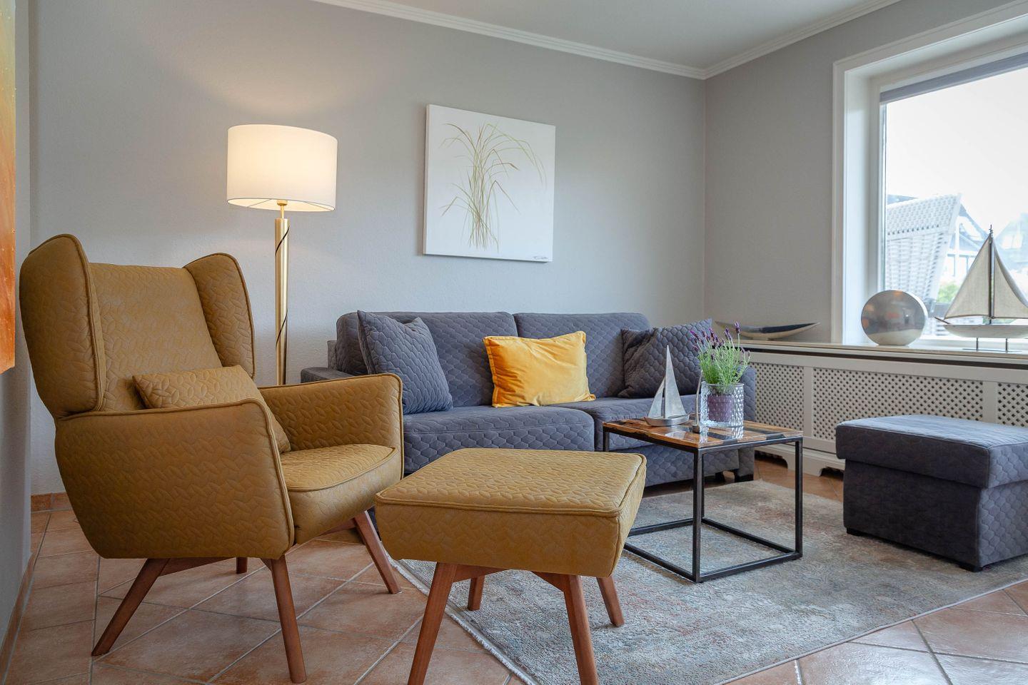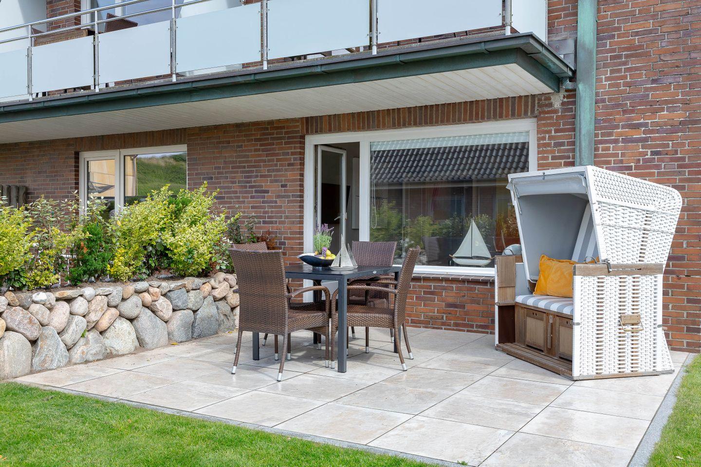 Die helle Erdgeschosswohnung ist ideal für 2-3 Personen und bietet eine separate Küche mit einer Esstischgruppe für 4 Personen, einem Cerankochfeld, Geschirrspüler sowie einem Mikrowellenbackofen. Vom Flur aus gelangt man ins Duschbad, in den Souterrain zum Schlafzimmer mit Flat TV und Einbauschränken. Im Wohnzimmer befindet sich eine bequeme Schlafcouch, Flat TV, Stereoanlage und DVD Player. Vom Wohnzimmer aus haben Sie Zugang zur sonnigen Terrasse, auf dem ein Strandkorb sowie Tisch und Stühle für Sie bereit stehen.