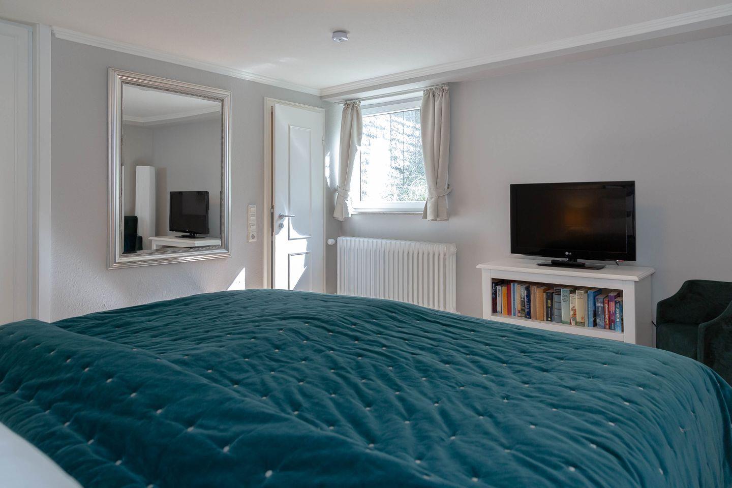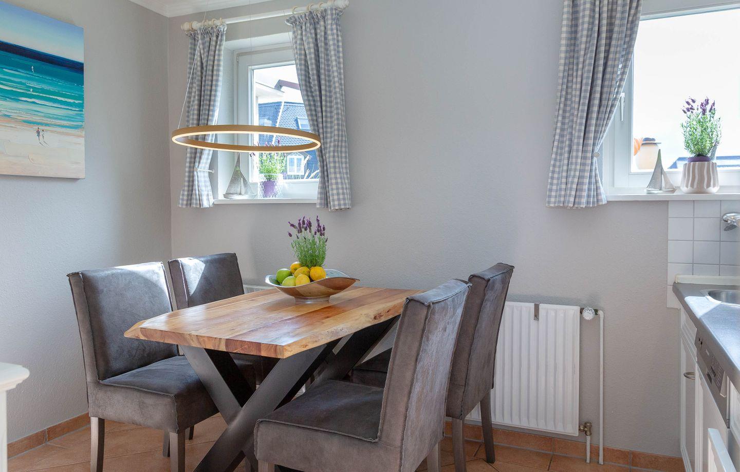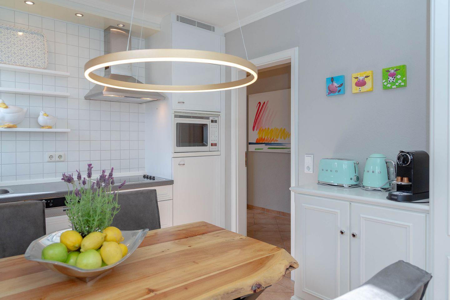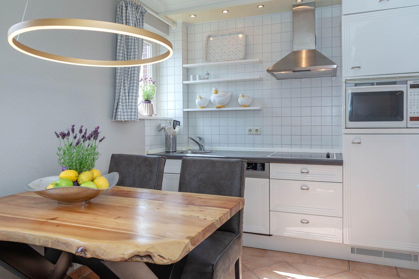Die helle Erdgeschosswohnung ist ideal für 2-3 Personen und bietet eine separate Küche mit einer Esstischgruppe für 4 Personen, einem Cerankochfeld, Geschirrspüler sowie einem Mikrowellenbackofen. Vom Flur aus gelangt man ins Duschbad, in den Souterrain zum Schlafzimmer mit Flat TV und Einbauschränken. Im Wohnzimmer befindet sich eine bequeme Schlafcouch, Flat TV, Stereoanlage und DVD Player. Vom Wohnzimmer aus haben Sie Zugang zur sonnigen Terrasse, auf dem ein Strandkorb sowie Tisch und Stühle für Sie bereit stehen.