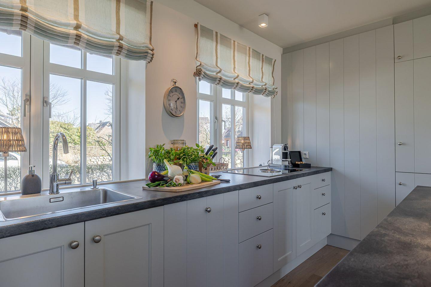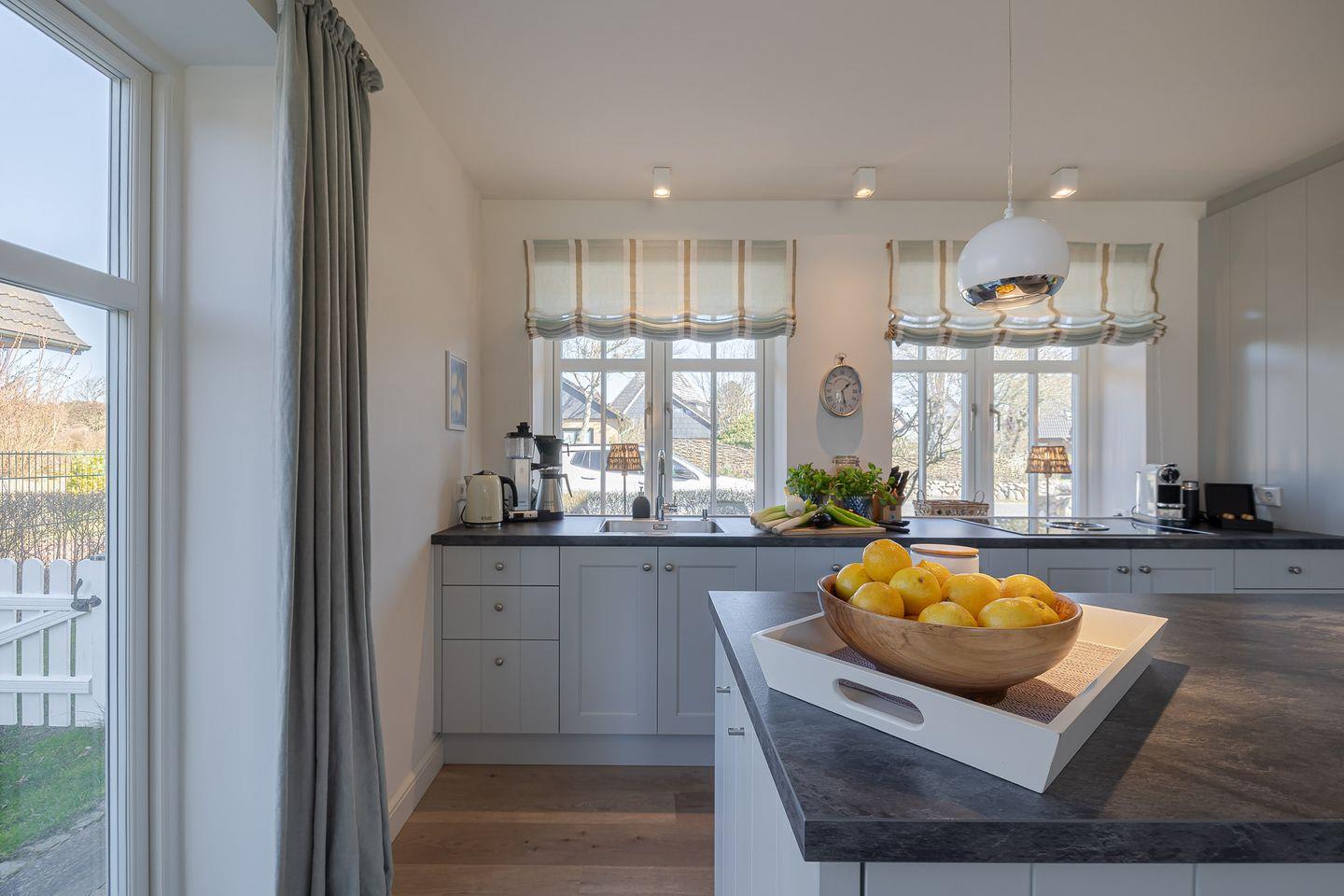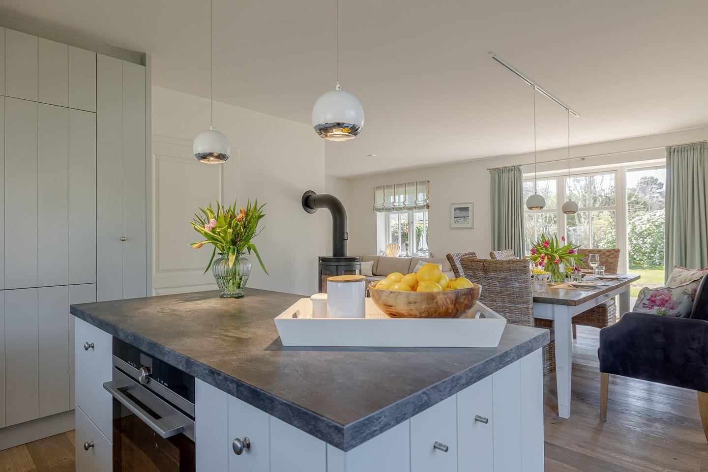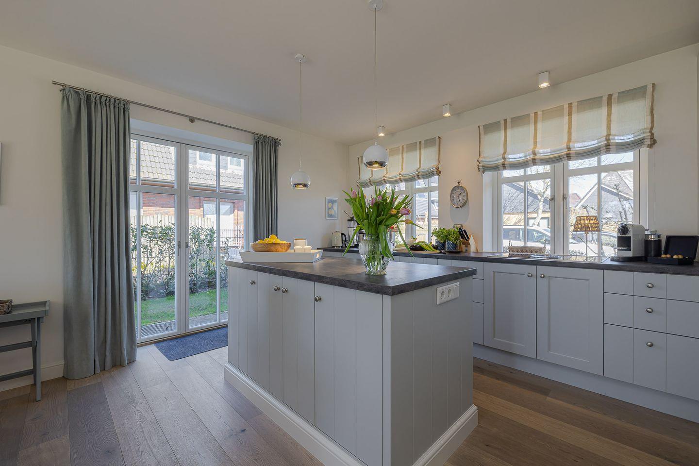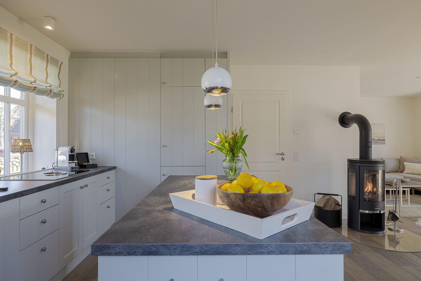Direkt angeschlossen an den Wohnbereich ist die moderne, voll ausgestattete Küche, die mit einer großzügigen Kochinsel und einem hochwertigen BORA-Kochfeld begeistert. Sie lädt zu gemeinsamen Kochabenden ein, bei denen das Zubereiten von Speisen zum Vergnügen wird. Die durchdachte und geschmackvolle Einrichtung der Küche lässt keine Wünsche offen und bietet die perfekte Grundlage für kulinarische Highlights.