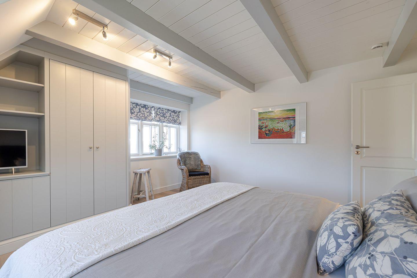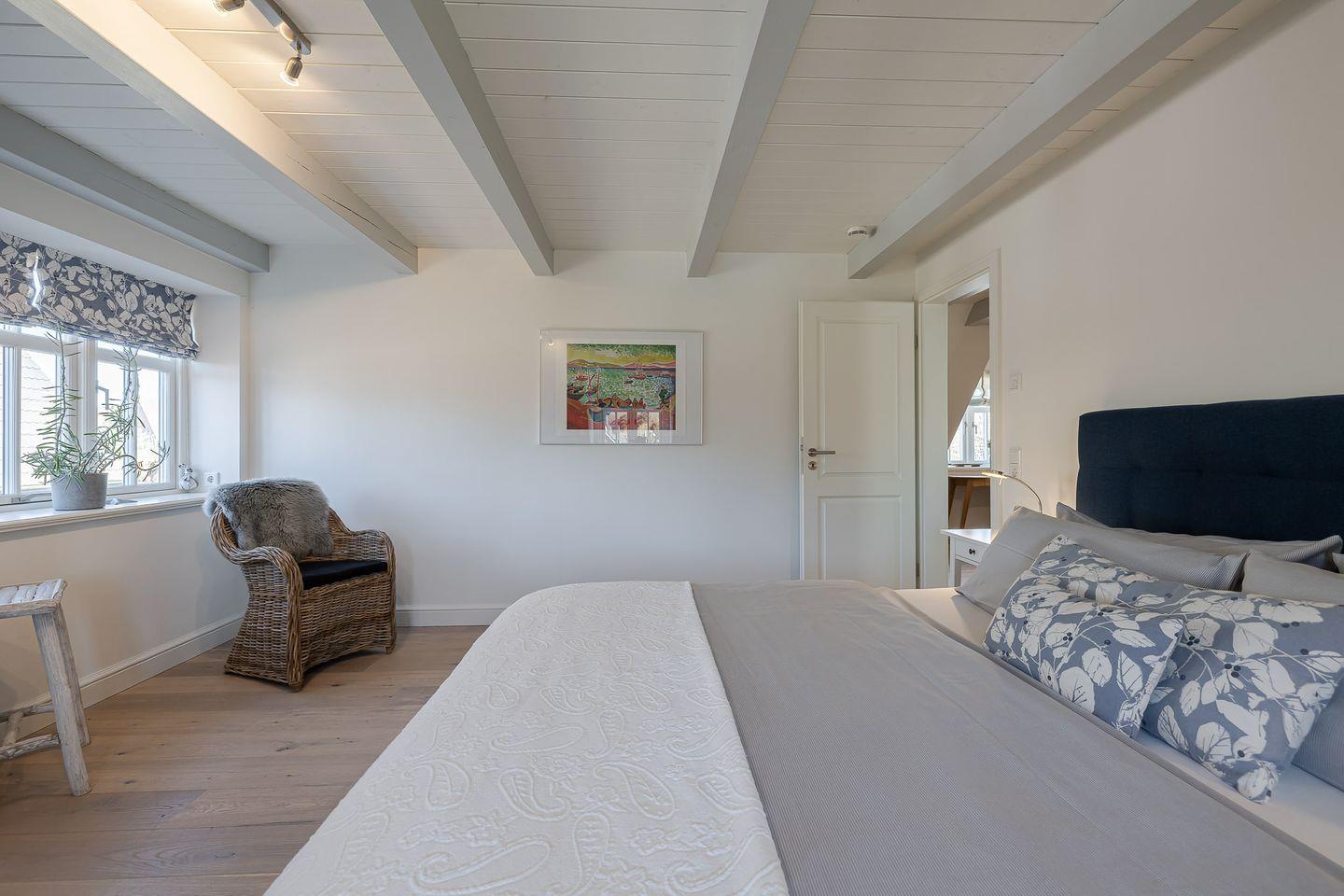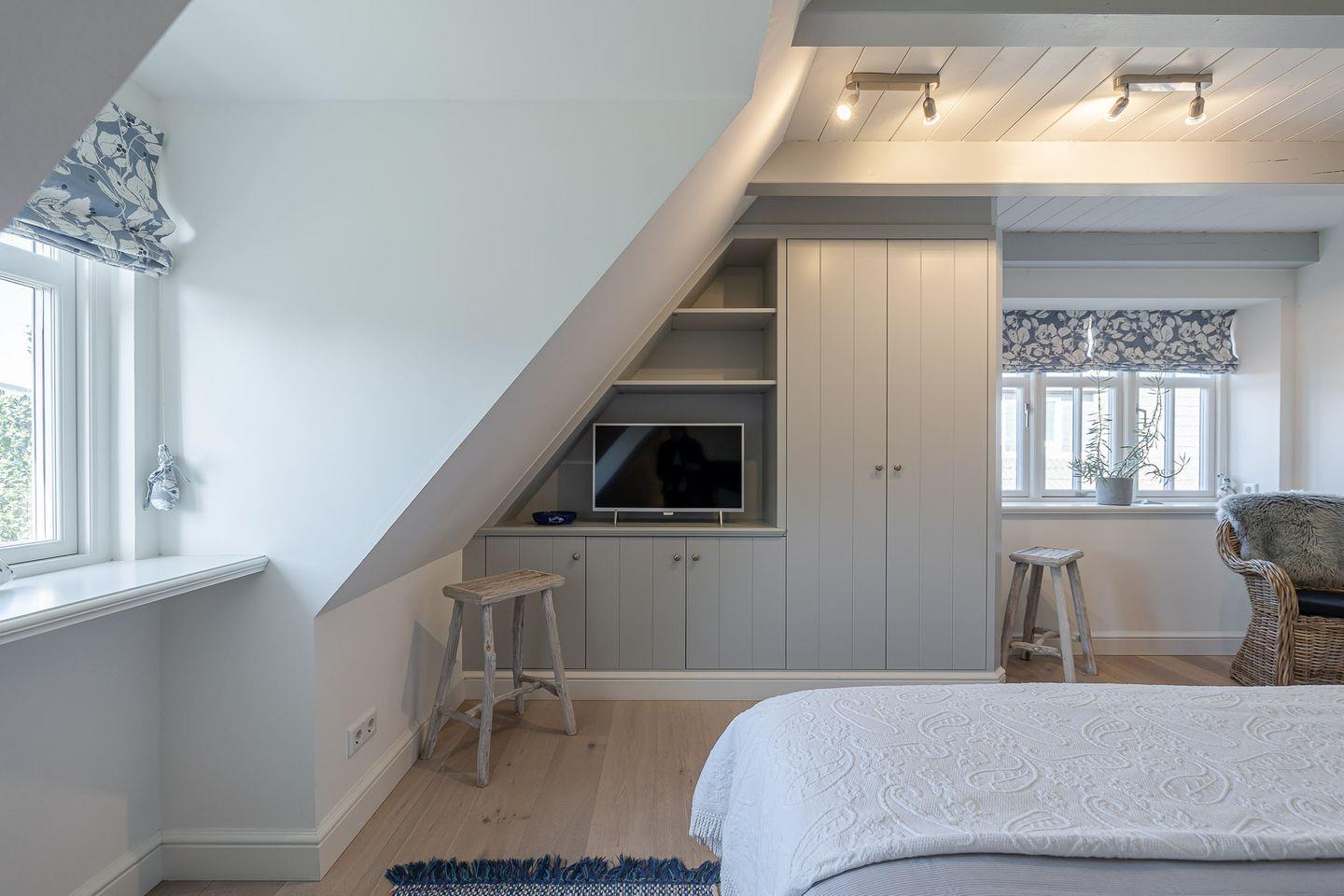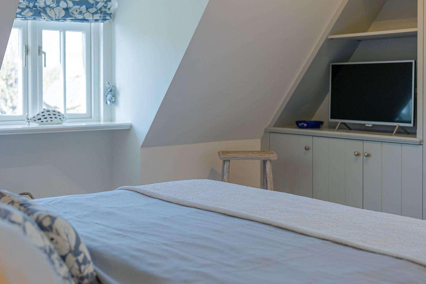 Das Highlight ist das Master-Schlafzimmer, das mit seinen charmanten Holzbalken eine warme, einladende Stimmung vermittelt. Jedes Schlafzimmer ist zudem mit einem eigenen Fernseher ausgestattet, sodass Sie den Tag entspannt und individuell ausklingen lassen können – ob mit einem Film, einer Serie oder einfach in Ruhe.