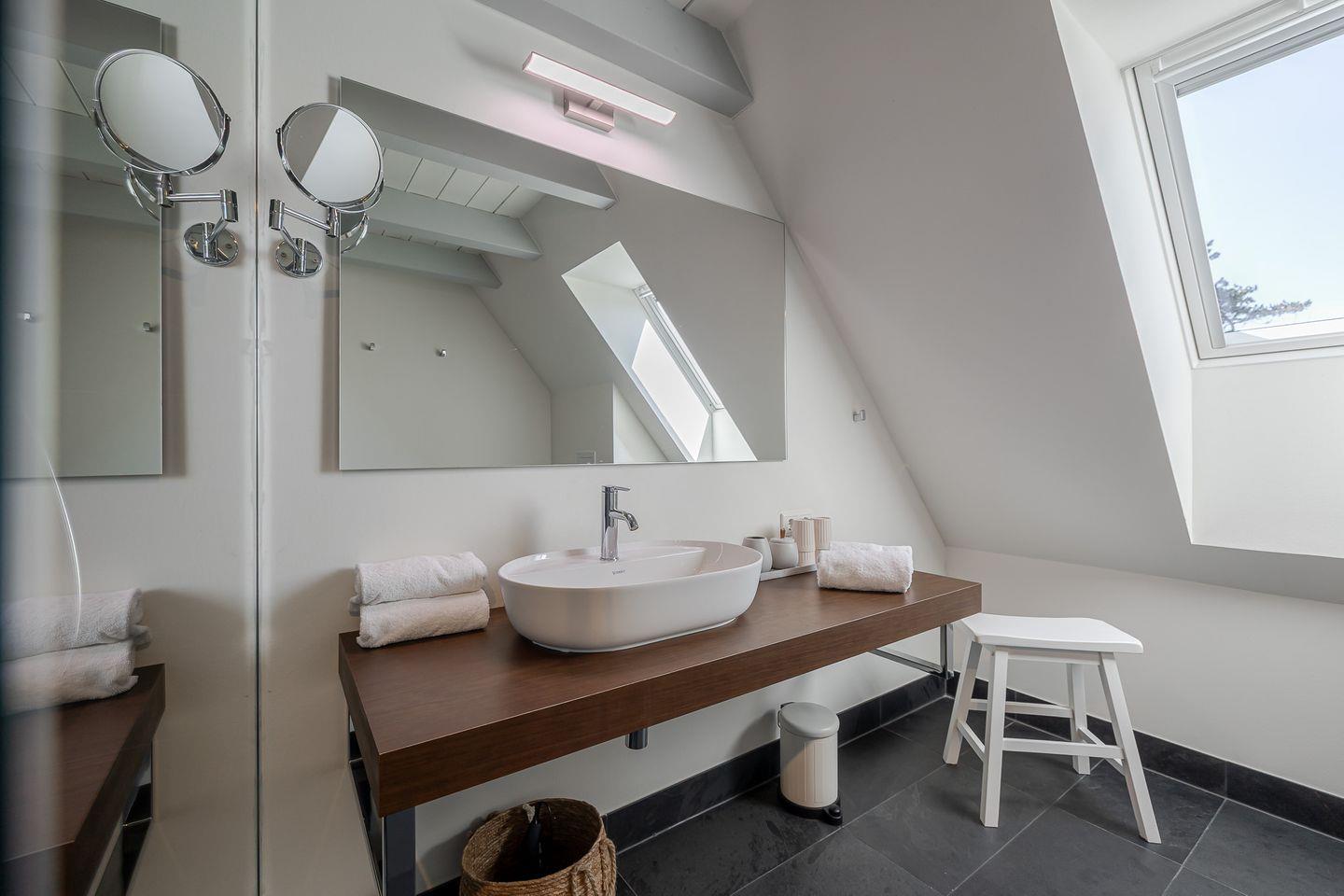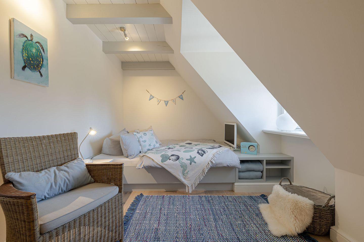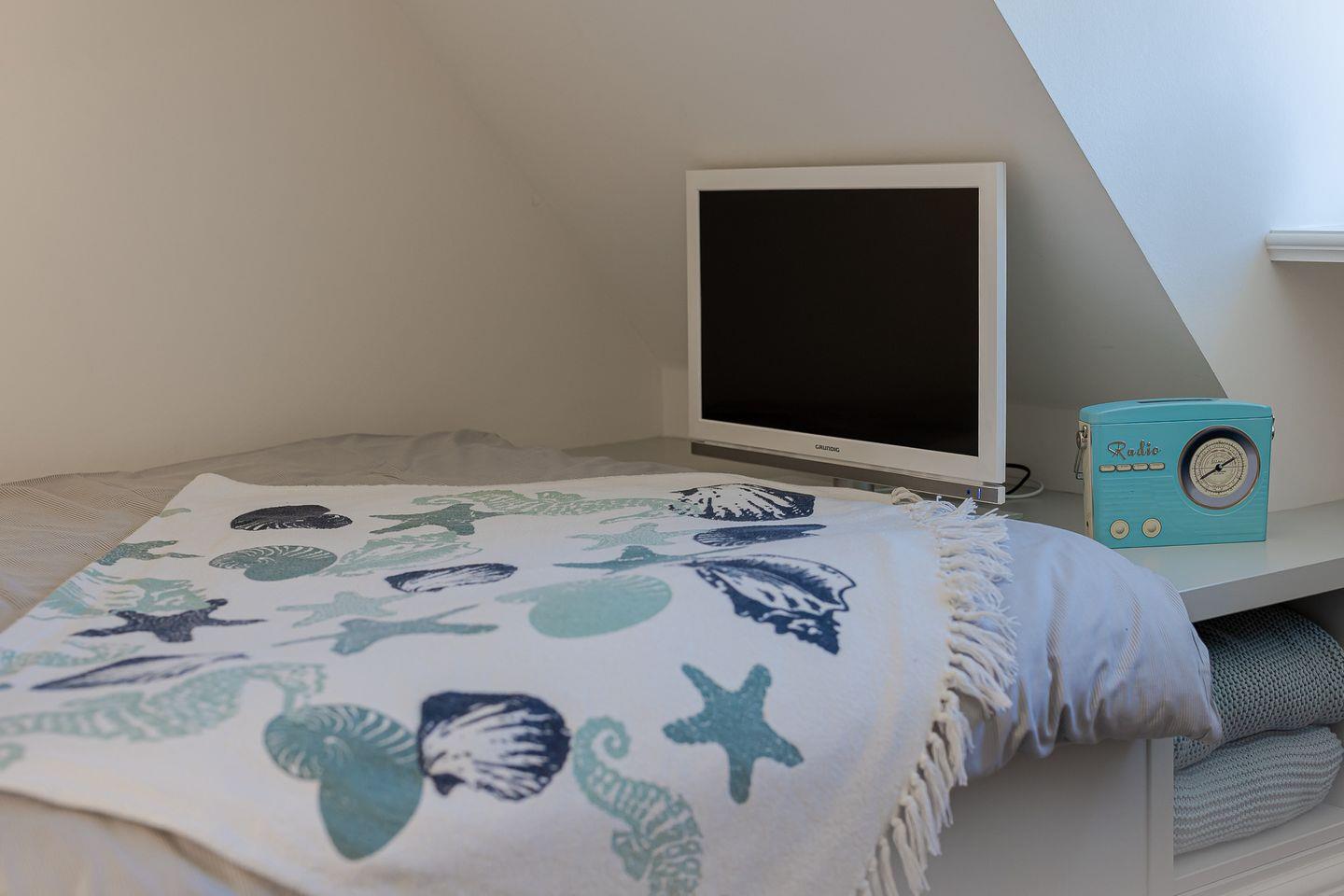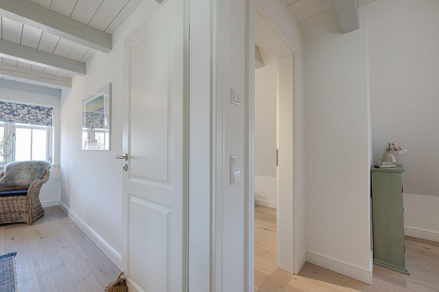Das Highlight ist das Master-Schlafzimmer, das mit seinen charmanten Holzbalken eine warme, einladende Stimmung vermittelt. Jedes Schlafzimmer ist zudem mit einem eigenen Fernseher ausgestattet, sodass Sie den Tag entspannt und individuell ausklingen lassen können – ob mit einem Film, einer Serie oder einfach in Ruhe.