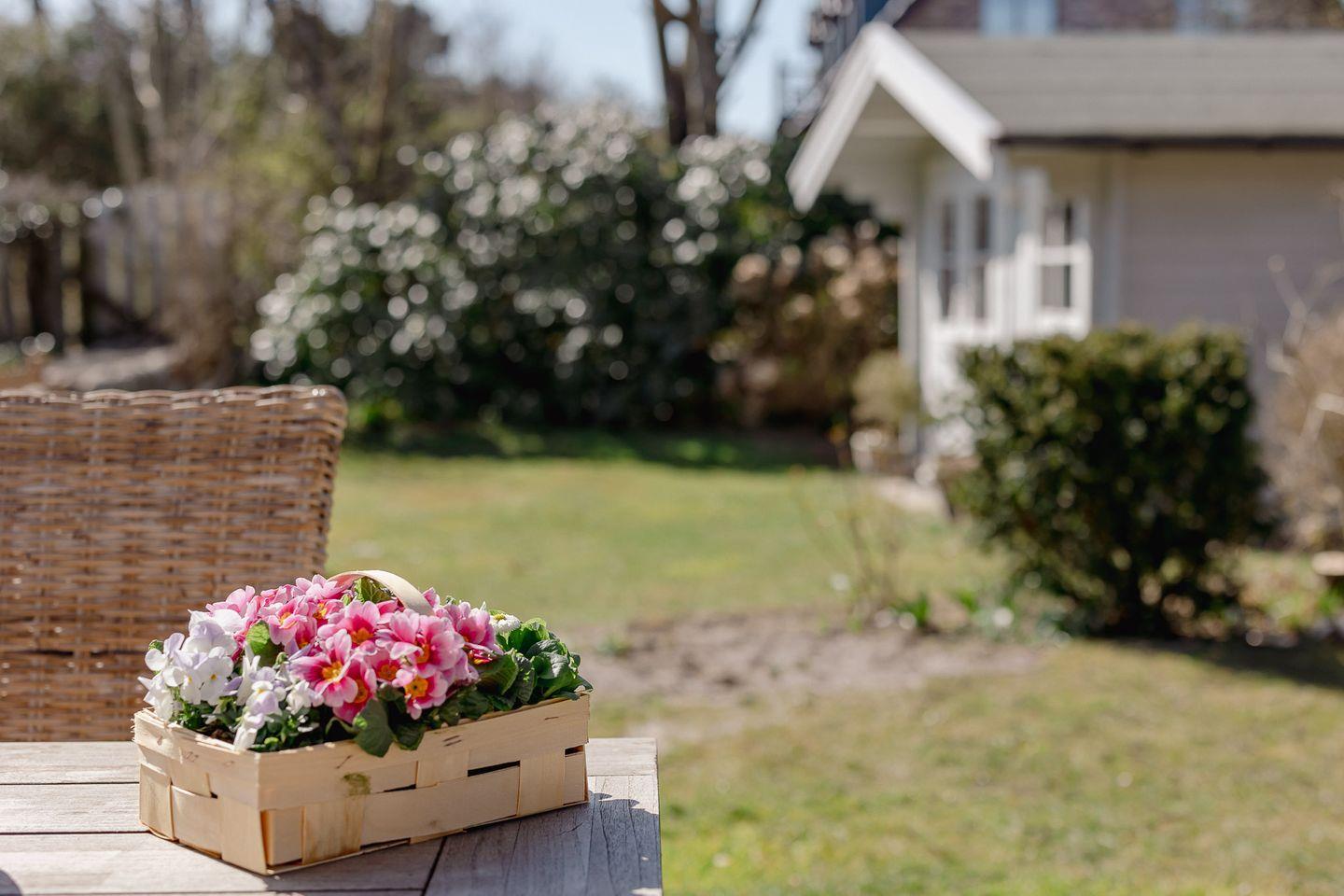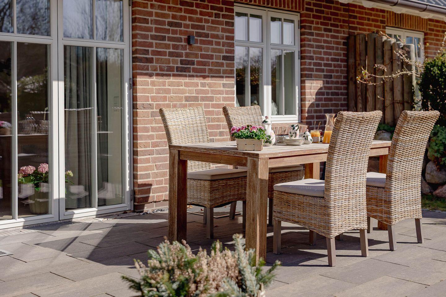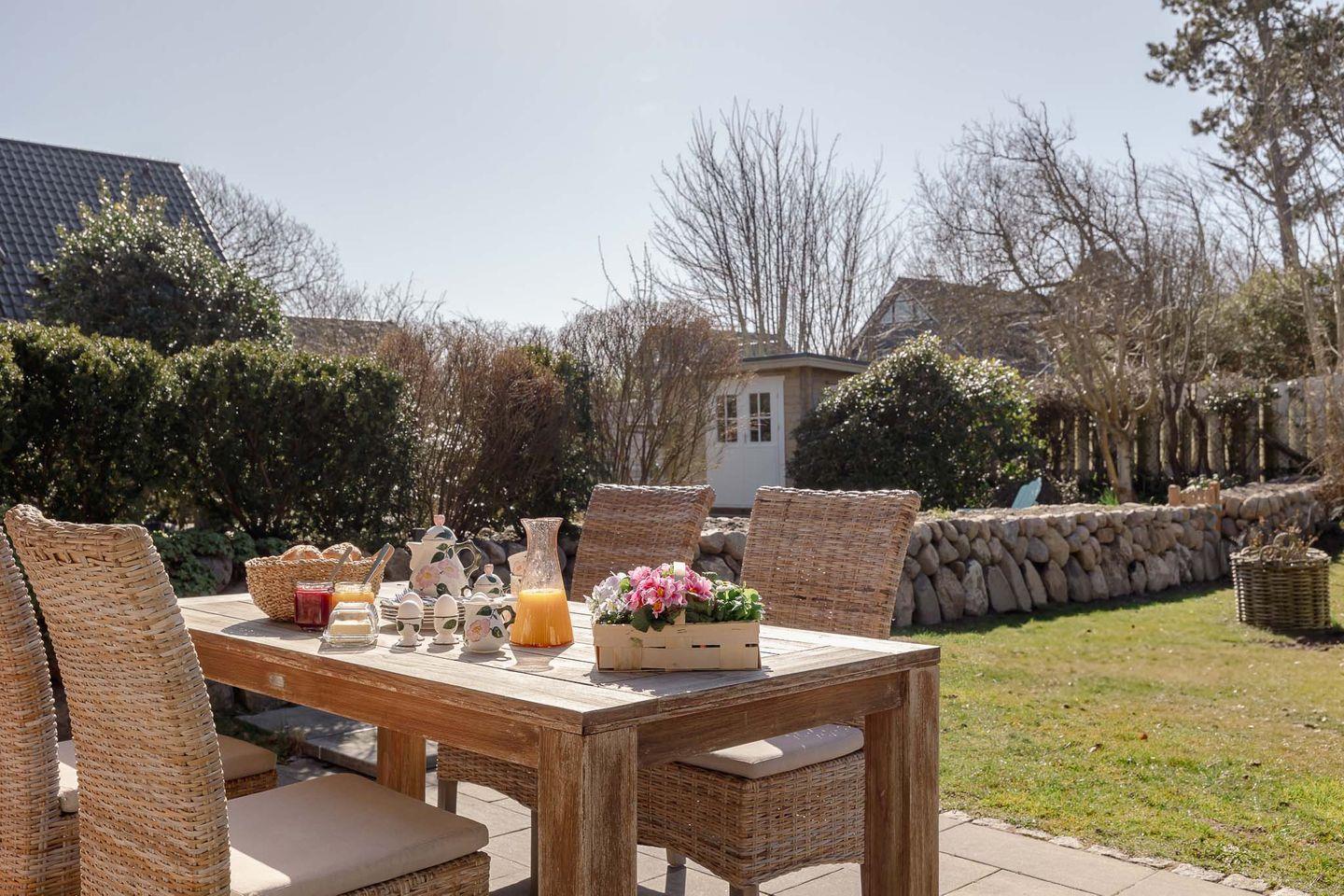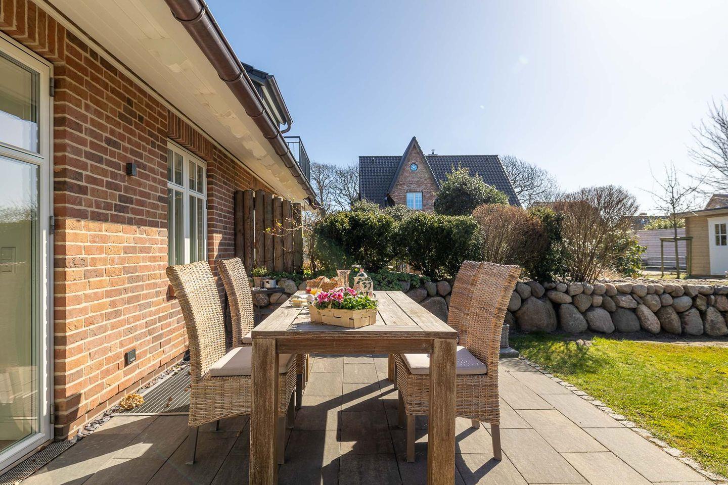 Das Hygge Hus überzeugt nicht nur im Inneren, sondern auch mit einem traumhaften Außenbereich. Der komplett umzäunte Garten mit einer großzügigen Terrasse und einem Strandkorb ist der perfekte Ort, um die Sonne zu genießen, gemütlich zu frühstücken oder einfach die frische Sylter Luft zu atmen. Ihre Hunde sind hier ebenfalls herzlich willkommen und können sich unbeschwert im Garten bewegen.