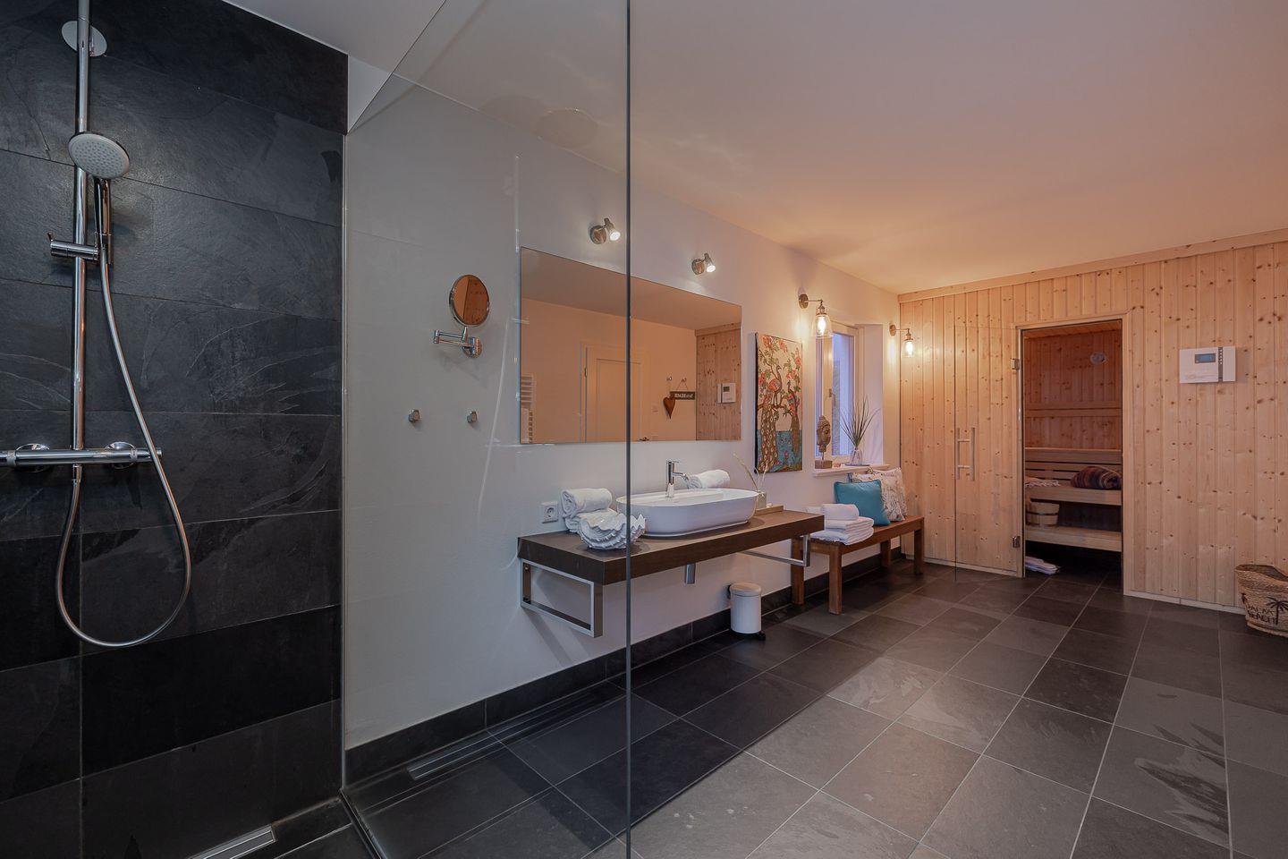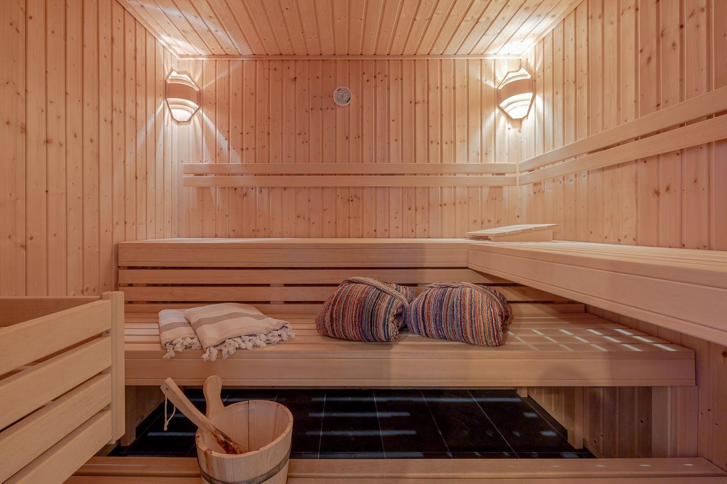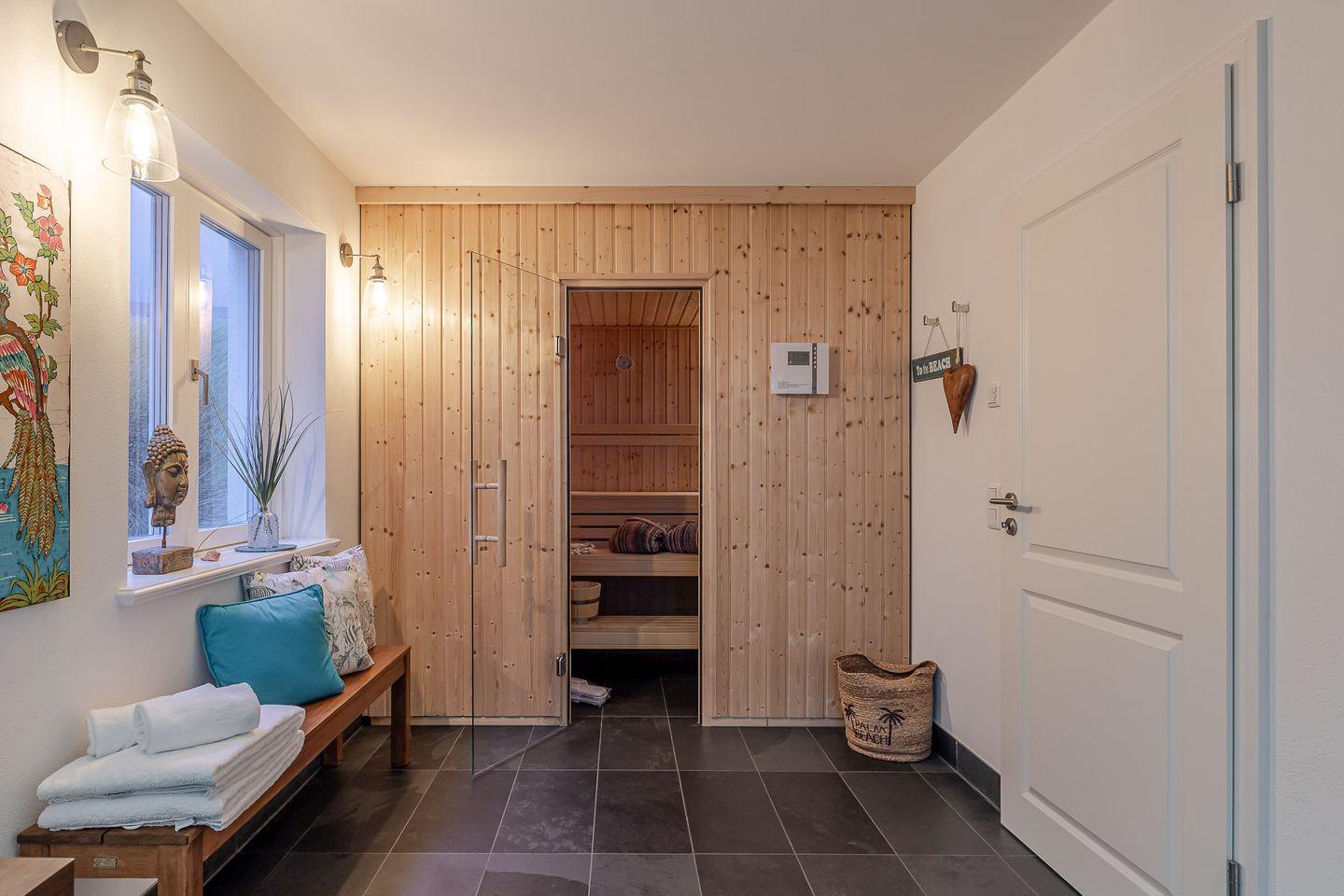 Der private Wellnessbereich mit Sauna lädt dazu ein, sich nach einem langen Spaziergang am Strand zu entspannen und neue Energie zu tanken. Ein praktischer und privater Hauswirtschaftsraum mit Waschmaschine und Trockner steht ebenfalls zur Verfügung, damit Sie sich während Ihres Aufenthalts um nichts sorgen müssen.