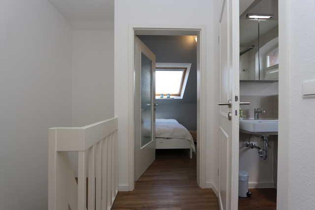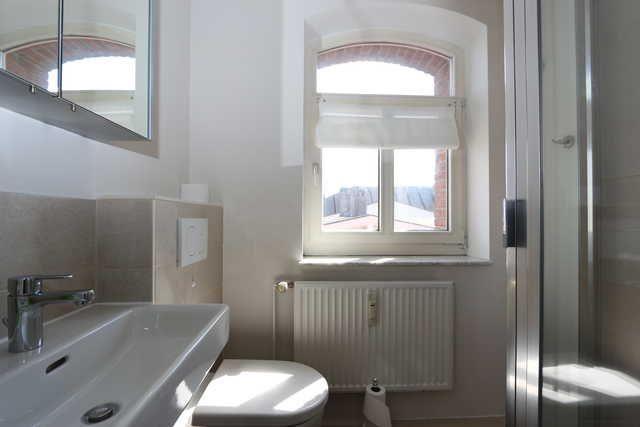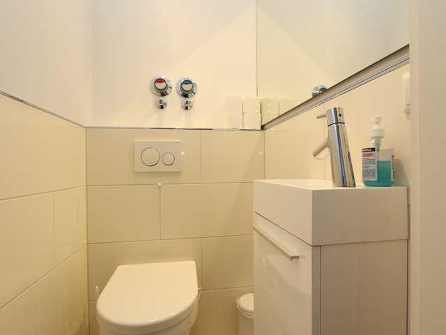 Das Badezimmer ist modern gestaltet und bietet neben einer Dusche auch ein separates Gäste-WC, was für zusätzlichen Komfort sorgt.