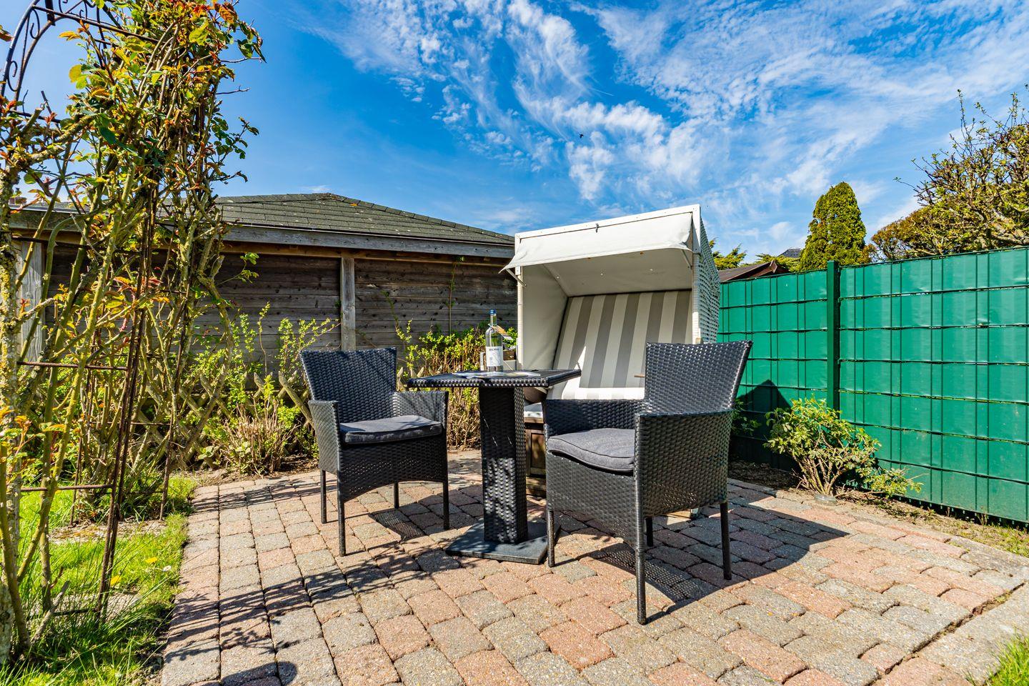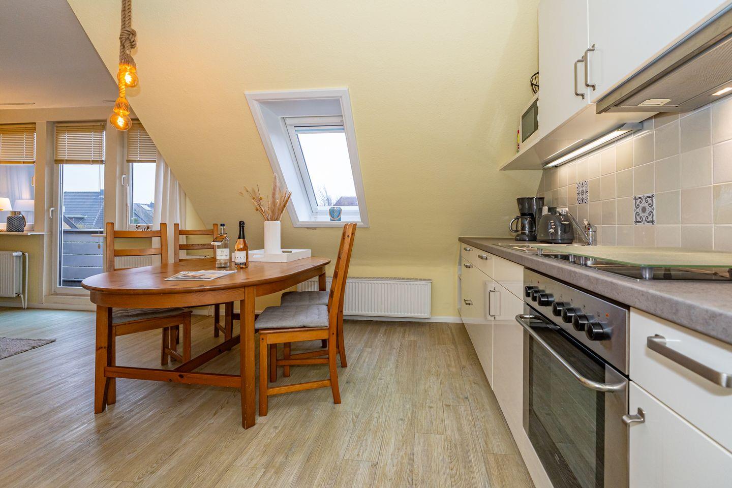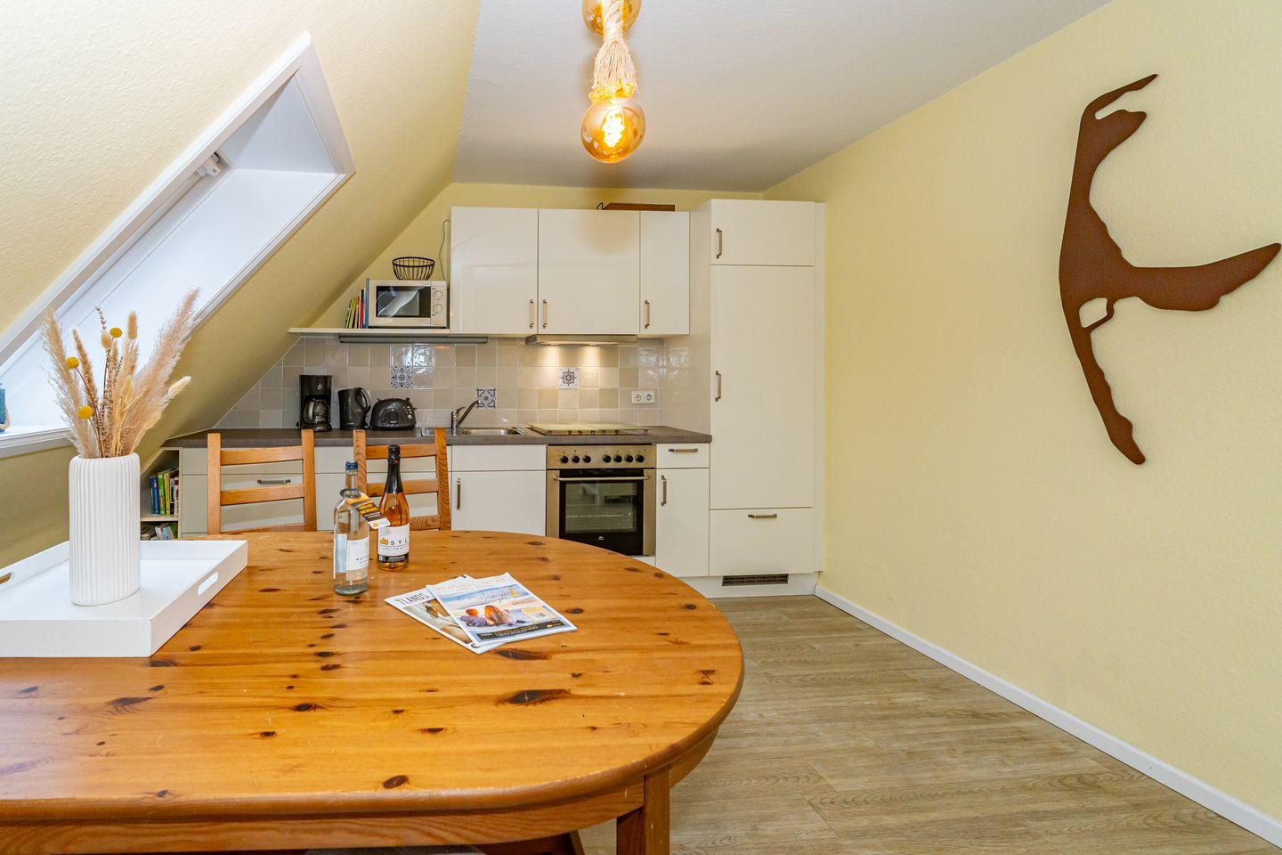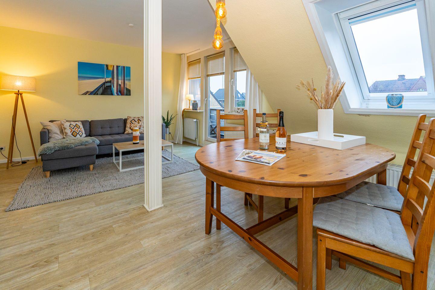 Willkommen in unserer charmanten Ferienwohnung "Tom" im Süden von Westerland auf der wunderbaren Insel Sylt! Die Ferienwohnung erstreckt sich über 58 m² und befindet sich im 1 OG. Sie betreten die Ferienwohnung durch einen Flur und werden von einem einladenden Wohnzimmer empfangen, das mit einem komfortablen Sofa und einem Esstisch ausgestattet ist. Hier können Sie entspannen, gesellige Abende verbringen oder beim Fernsehen die neuesten Filme genießen. Die offene Küche ist perfekt ausgestattet und lässt keine Wünsche offen: Ein Cerankochfeld, Backofen, Mikrowelle, Kühlschrank mit Gefrierfach, Spülmaschine sowie Kaffeemaschine und Toaster stehen für Ihre kulinarischen Abenteuer bereit. Genießen Sie die kleine Terrasse, die mit Gartenmöbeln und einem Strandkorb ausgestattet ist. Hier können Sie die Sonne genießen, die frische Seeluft schnuppern oder einfach nur entspannen und den Blick auf die Umgebung schweifen lassen. Die Ferienwohnung verfügt über zwei gemütliche Schlafzimmer, die für erholsame Nächte sorgen. Das Badezimmer ist mit einer Dusche, WC und Waschmaschine ausgestattet. Ein PKW Stellplatz steht Ihnen am Haus zur Verfügung.