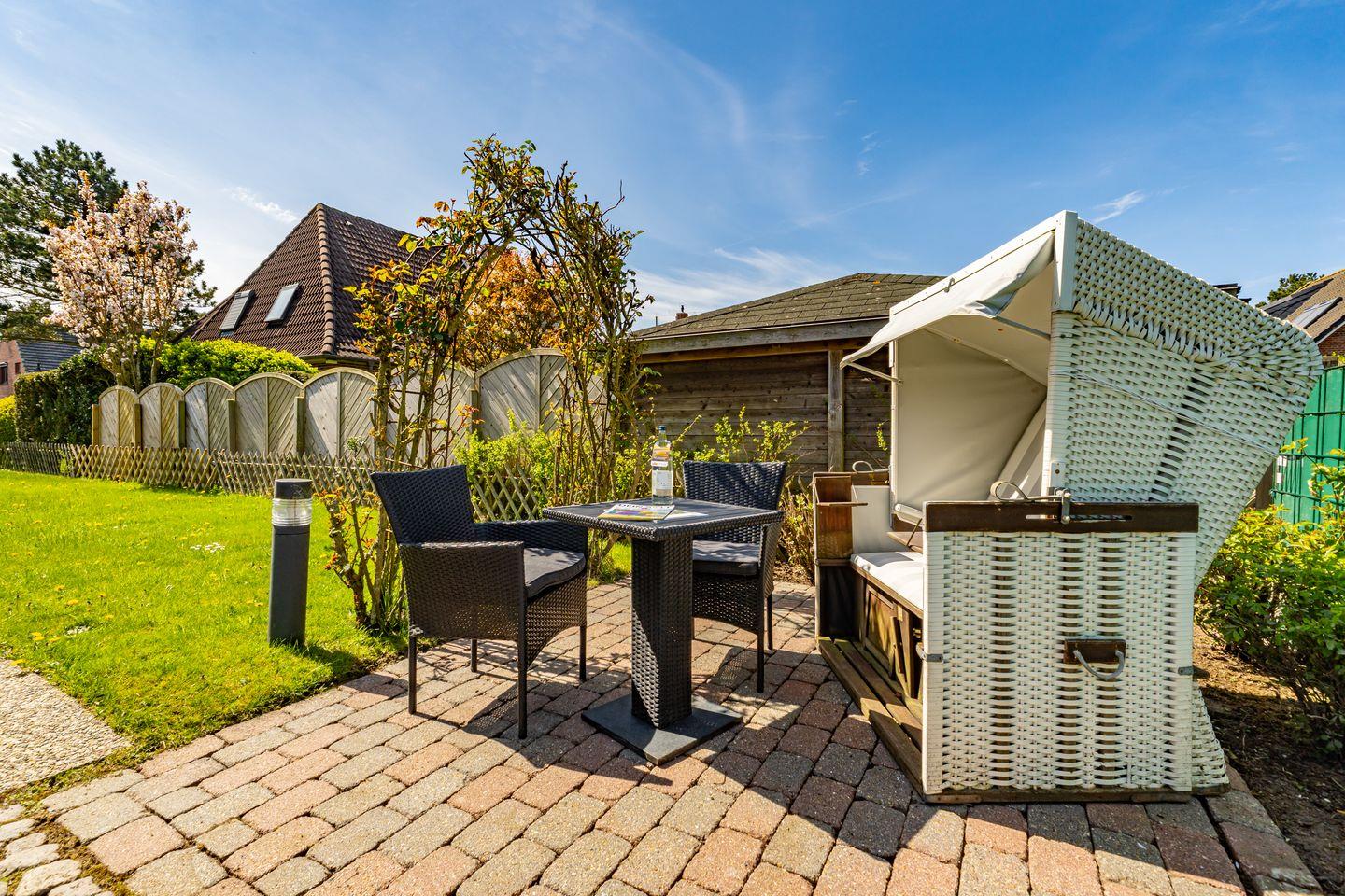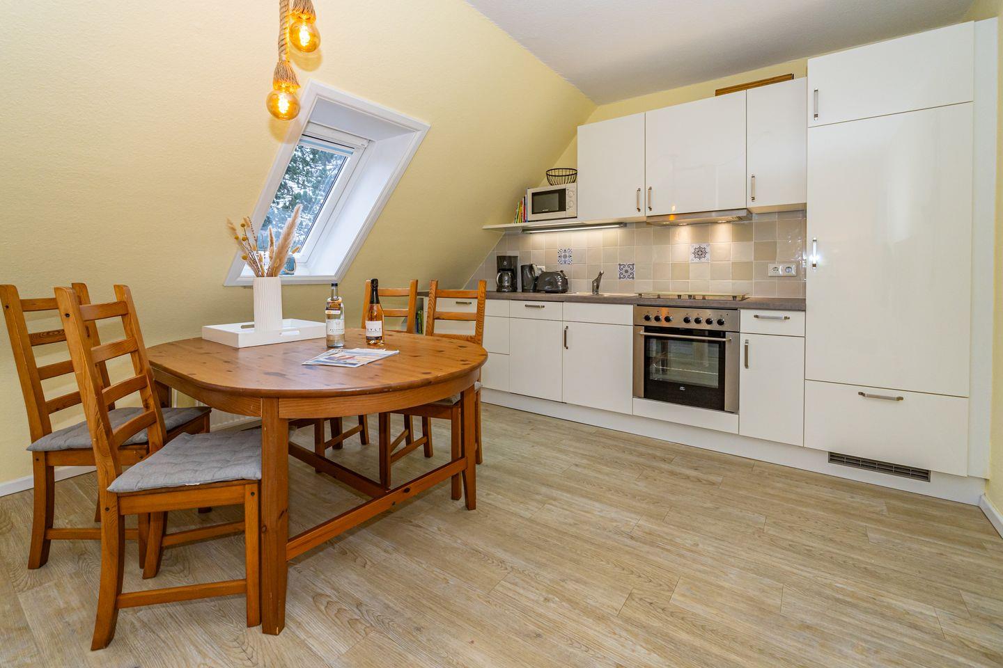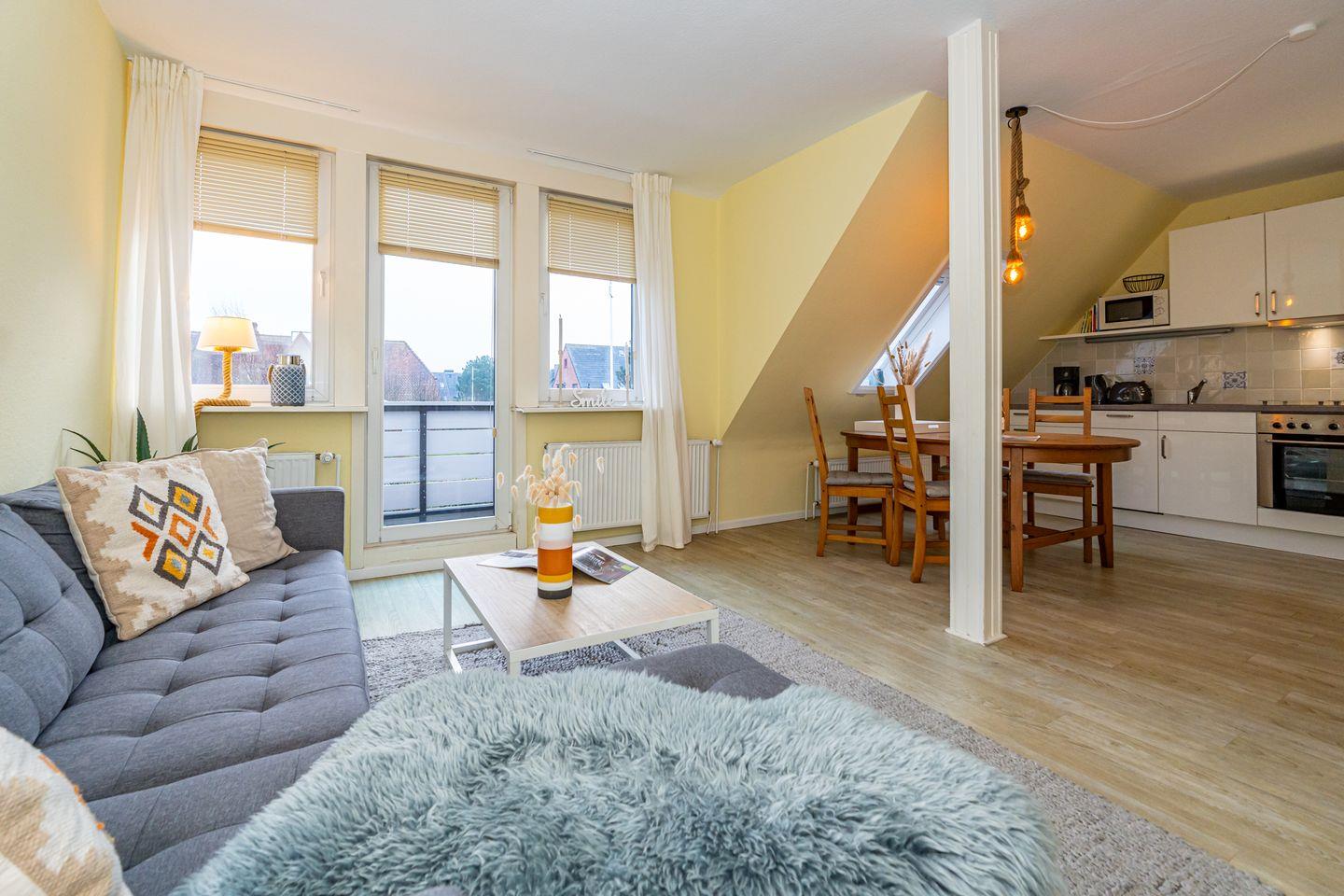 Willkommen in unserer charmanten Ferienwohnung "Tom" im Süden von Westerland auf der wunderbaren Insel Sylt! Die Ferienwohnung erstreckt sich über 58 m² und befindet sich im 1 OG. Sie betreten die Ferienwohnung durch einen Flur und werden von einem einladenden Wohnzimmer empfangen, das mit einem komfortablen Sofa und einem Esstisch ausgestattet ist. Hier können Sie entspannen, gesellige Abende verbringen oder beim Fernsehen die neuesten Filme genießen. Die offene Küche ist perfekt ausgestattet und lässt keine Wünsche offen: Ein Cerankochfeld, Backofen, Mikrowelle, Kühlschrank mit Gefrierfach, Spülmaschine sowie Kaffeemaschine und Toaster stehen für Ihre kulinarischen Abenteuer bereit. Genießen Sie die kleine Terrasse, die mit Gartenmöbeln und einem Strandkorb ausgestattet ist. Hier können Sie die Sonne genießen, die frische Seeluft schnuppern oder einfach nur entspannen und den Blick auf die Umgebung schweifen lassen. Die Ferienwohnung verfügt über zwei gemütliche Schlafzimmer, die für erholsame Nächte sorgen. Das Badezimmer ist mit einer Dusche, WC und Waschmaschine ausgestattet. Ein PKW Stellplatz steht Ihnen am Haus zur Verfügung.