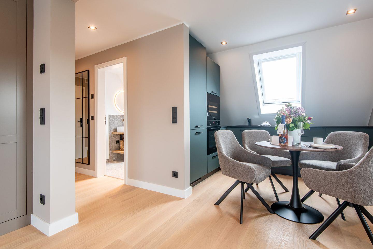 Der offene Wohn- und Essbereich ist das Herzstück der Wohnung. Hier finden Sie eine gemütliche Sitzecke mit einem komfortablen Boxspring-Schlafsofa, das auch als Schlafmöglichkeit für Kinder dient. Ein großzügiger Esstisch lädt zu gemeinsamen Mahlzeiten und entspannten Abenden ein.