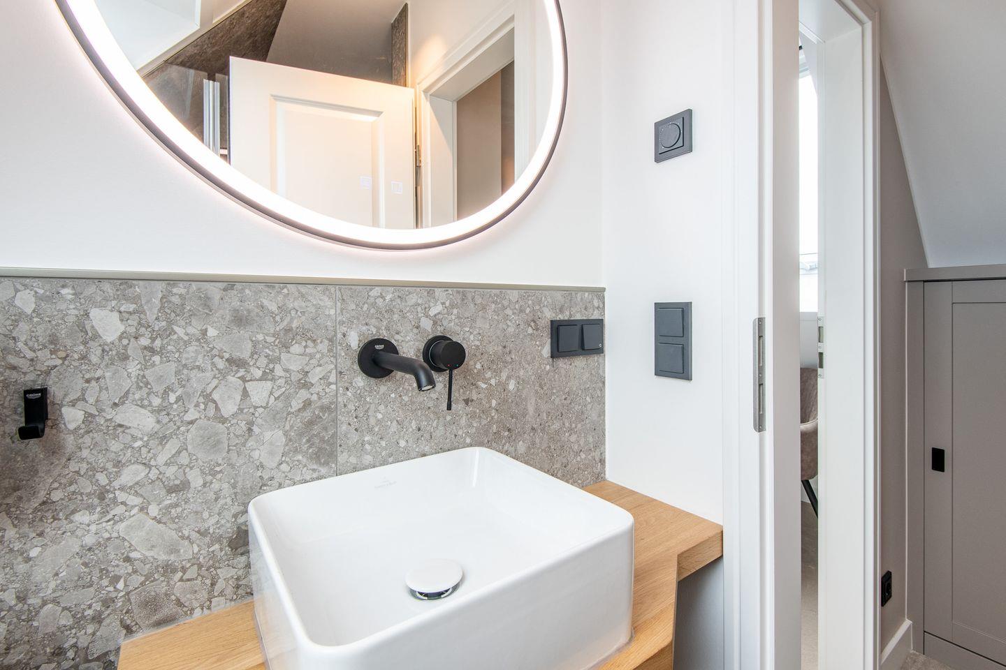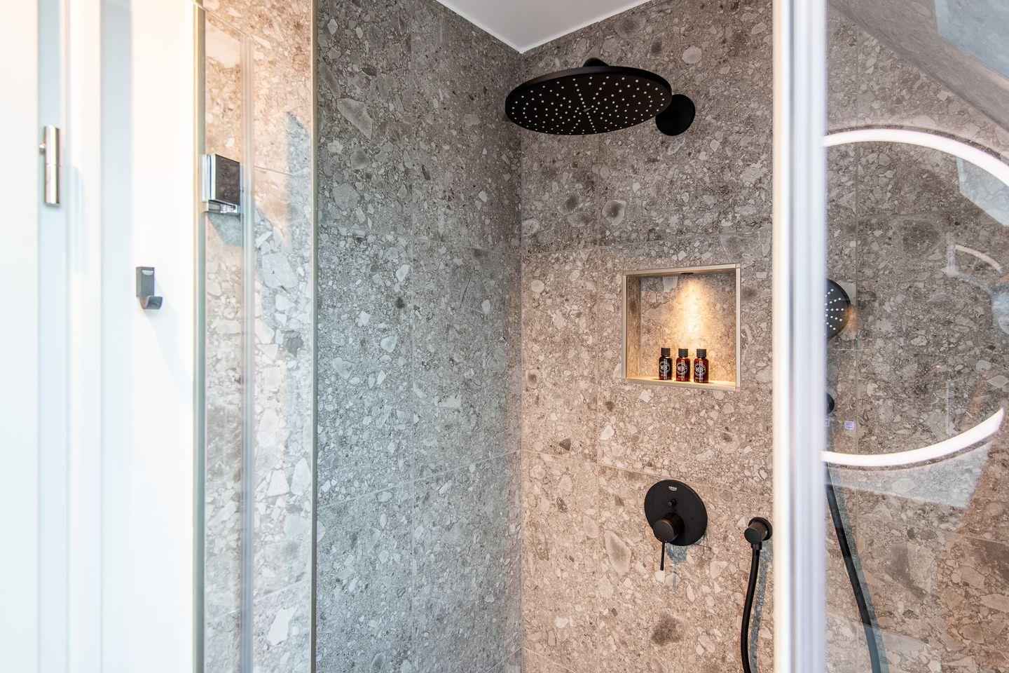 Die Ferienwohnung bietet Ihnen Zugang zu einem gemeinschaftlichen Wellness- und Fitnessbereich. Entspannen Sie in der Sauna, nutzen Sie den Fitnessraum oder die gemeinschaftliche Waschmaschine und den Trockner – alles wurde mit Ihrem Komfort im Blick gestaltet. Das Badezimmer mit moderner Dusche und ein separates Gäste-WC sorgen für zusätzliche Annehmlichkeiten.