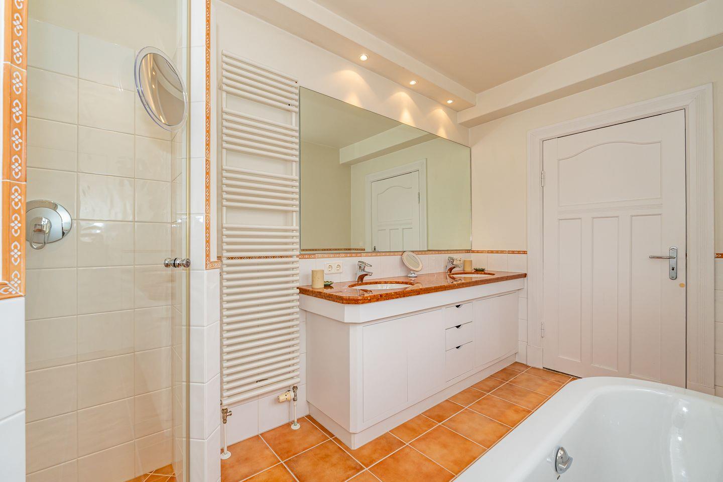 1 großer Schlafraum mit angrenzendem Suite Duschbad und Doppelwaschbecken, TV