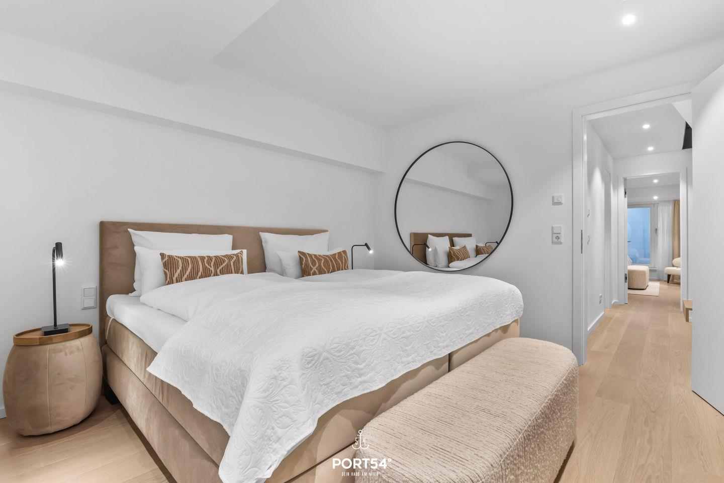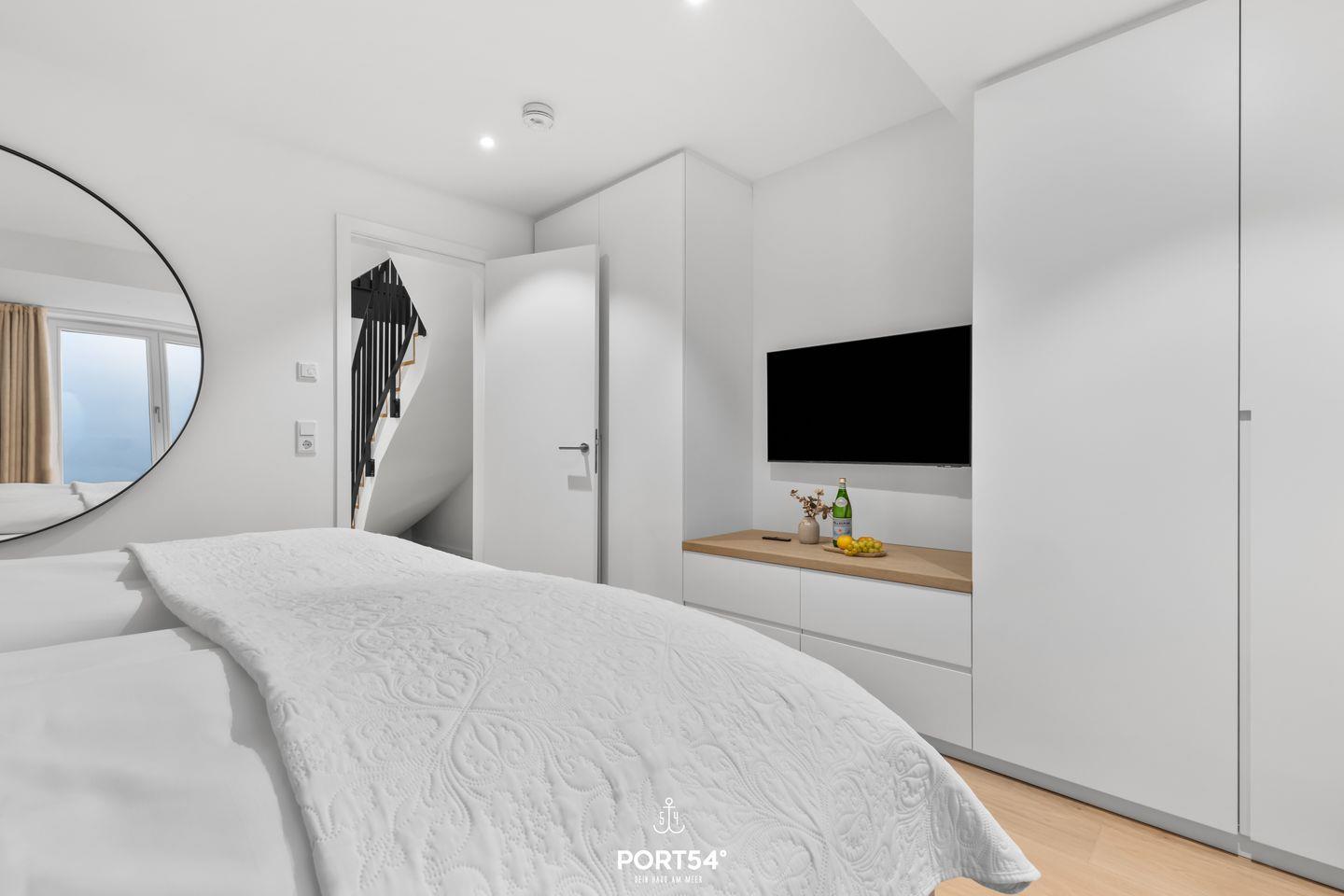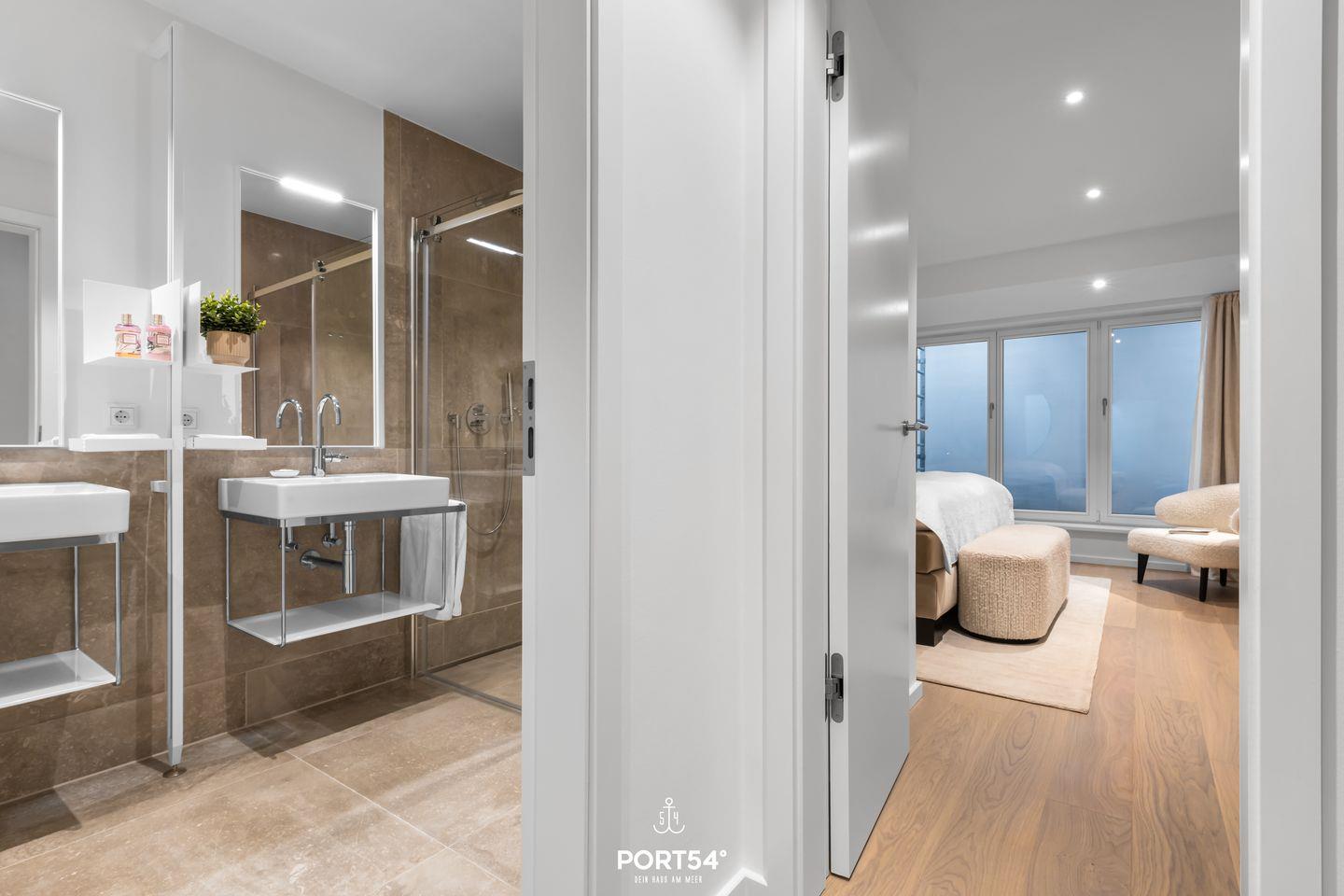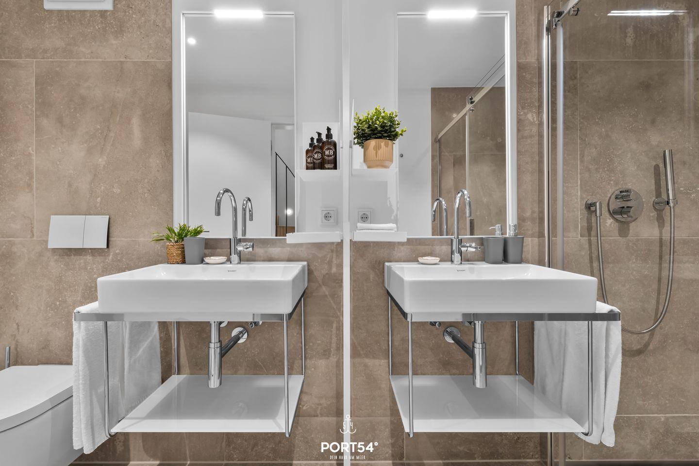 Das Luxus Maisonette-Apartment bietet Platz für bis zu vier Personen im Erdgeschoss und Souterrain. Im Erdgeschoss erwartet dich der offene Wohnbereich mit einem gemütlichen Sofa und großem Flachbild-TV, sowie die voll ausgestattete Küche und ein Gäste-WC. Im Souterrain befinden sich die zwei Schlafzimmer, die jeweils mit einem großen Doppelboxspringbett (200x200 cm), einem Flachbild-TV und Verdunkelungsmöglichkeiten ausgestattet sind – perfekt für deine Nachtruhe. Dort findest du auch das exklusive Master-Bad mit großer Regendusche, zwei Waschbecken, Föhn und WC.