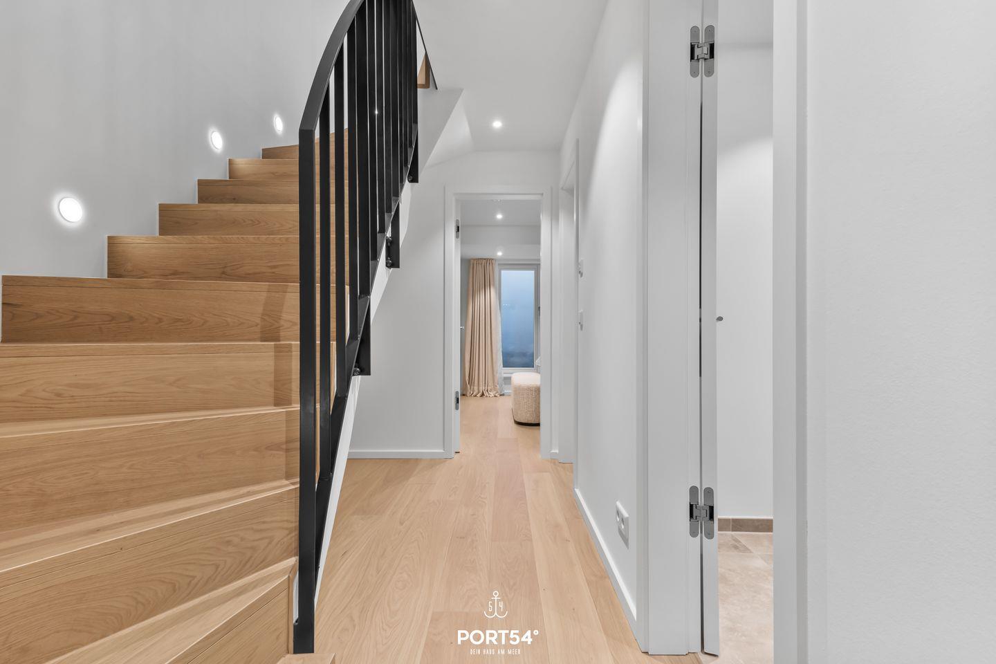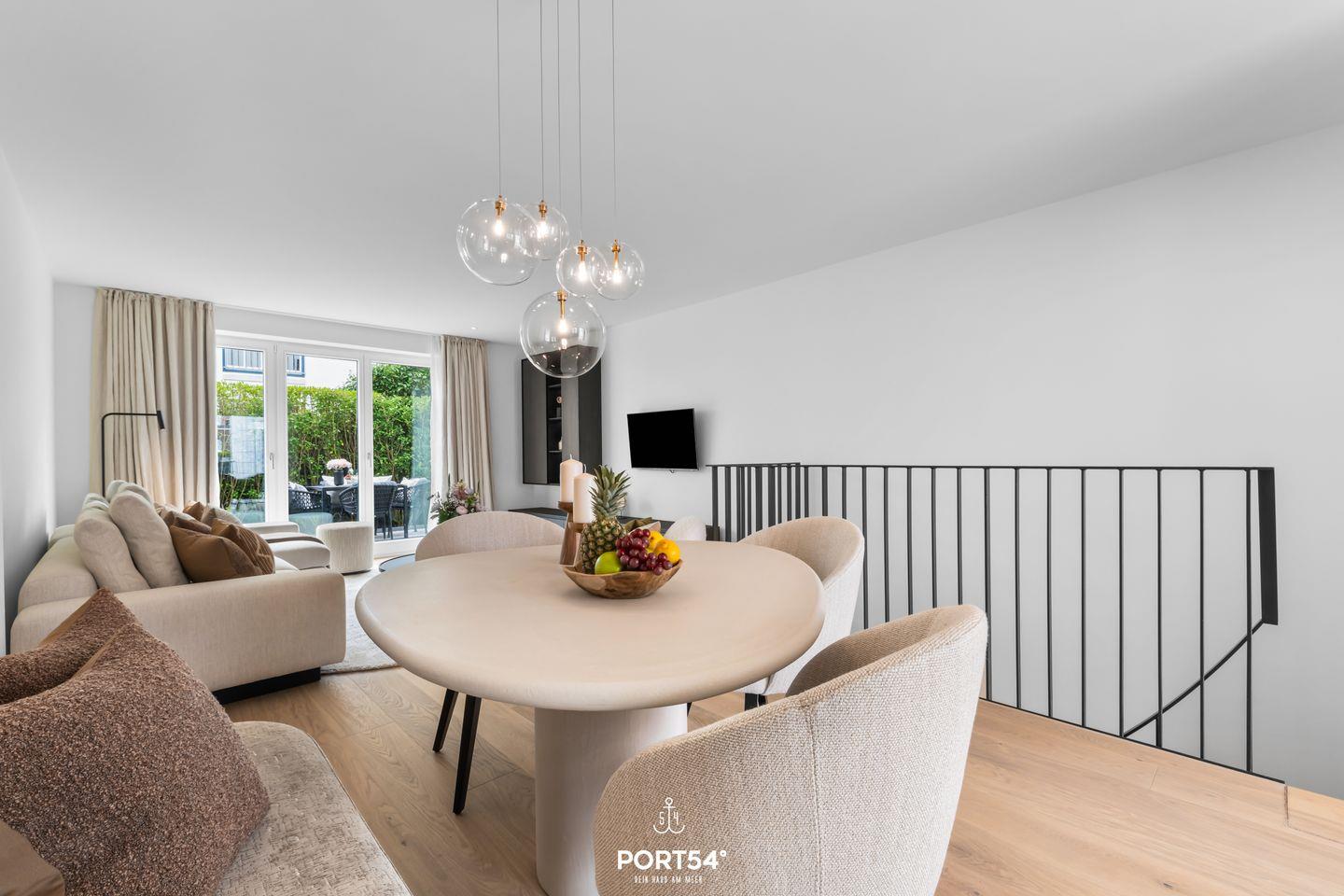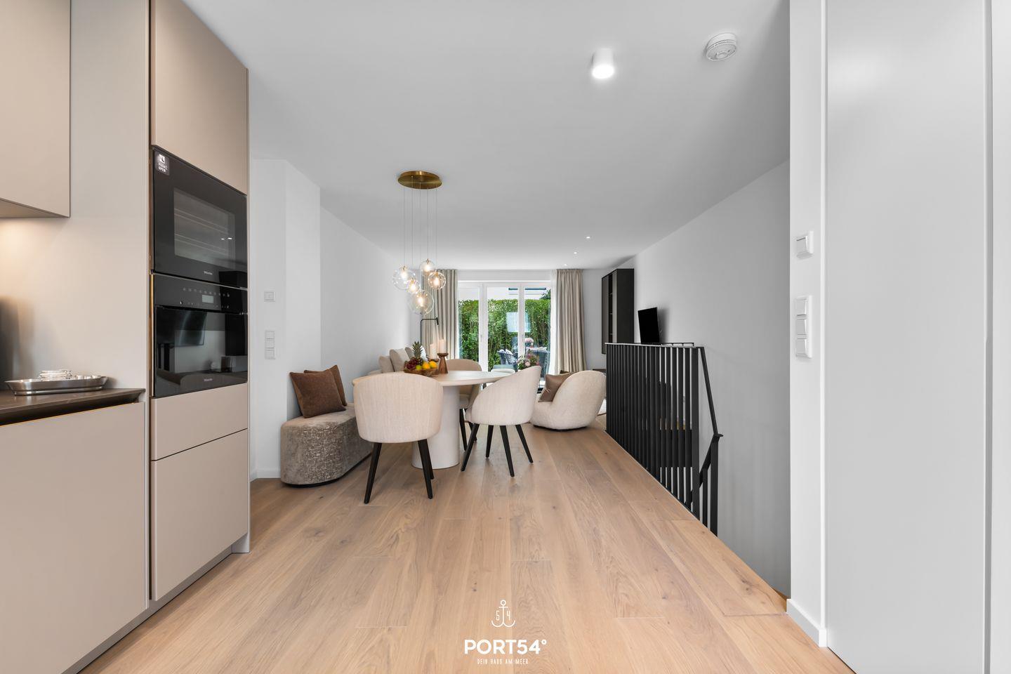Großer Wohn- und Essbereich mit Sofa und Sessel sowie Esstisch mit vier Stühlen. Hochwertig eingerichtete, offene Küche mit Kühlschrank, Backofen und Herd. Zwei Schlafzimmer im Souterrain jeweils mit Doppelbett (200 x 200cm) und großem Schrank. Exklusives Master-Bad im Souterrain mit zwei Waschbecken, großer Regendusche und WC. Luxuriöse Holzterrasse mit Gartenmöbeln. Gäste-WC im Erdgeschoss.