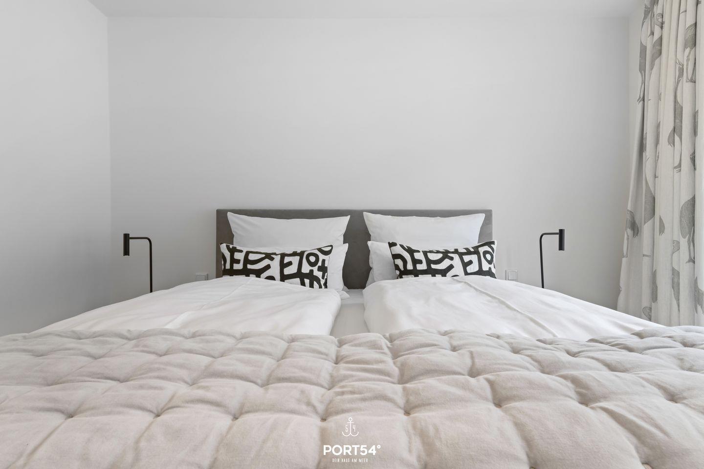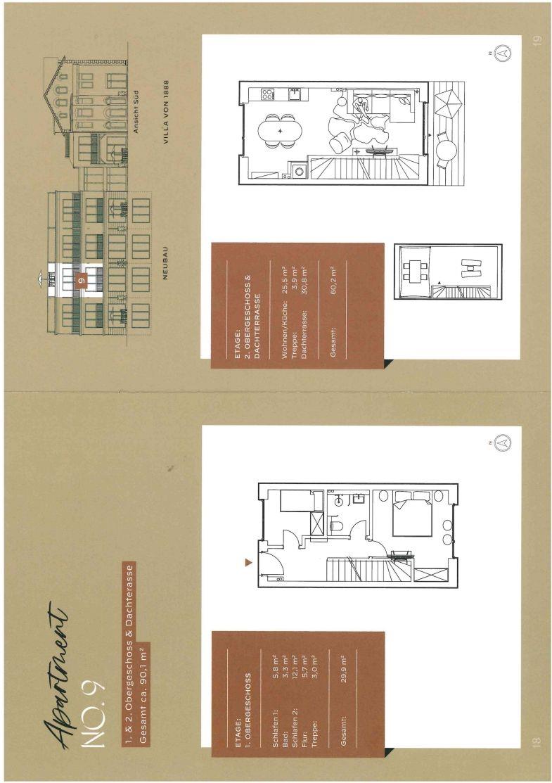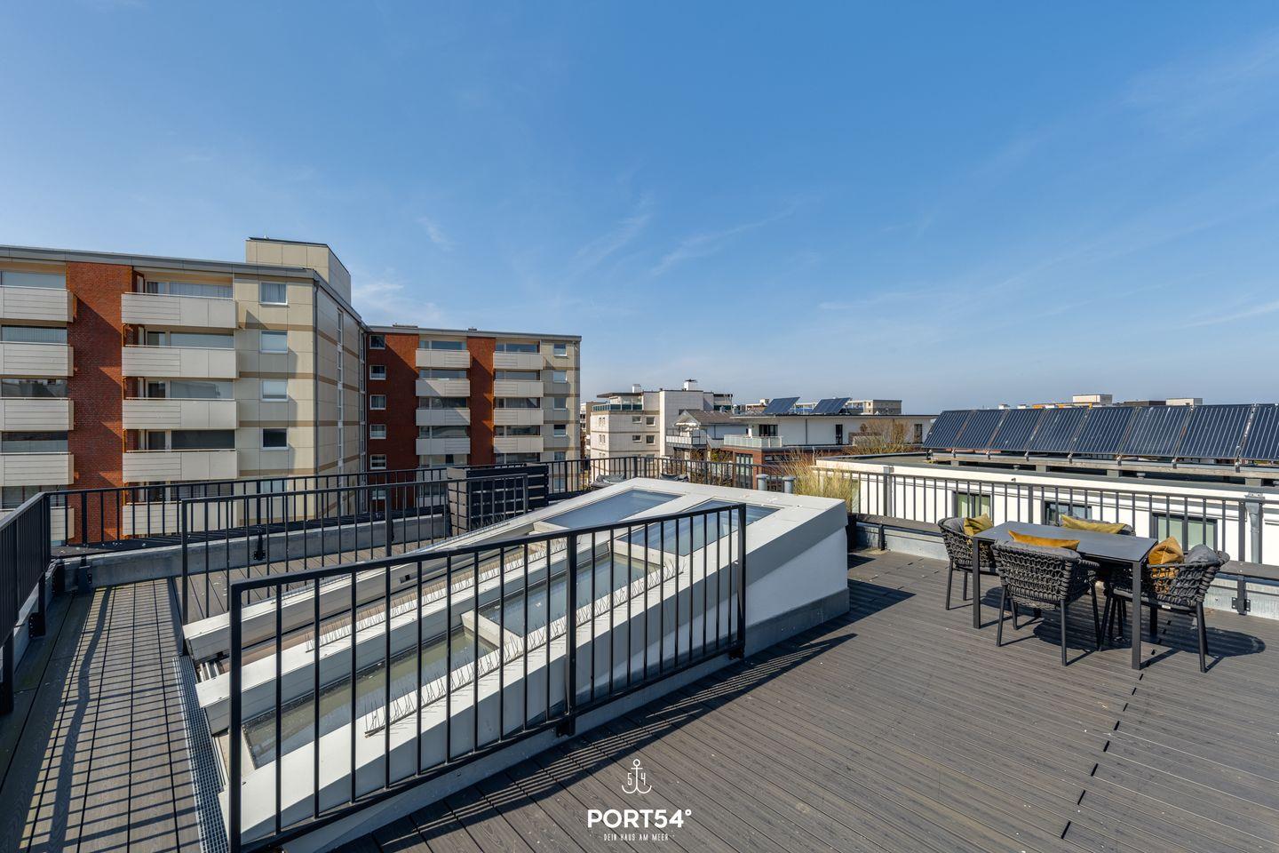 Das Luxus Maisonette Apartment bietet im 1. und 2. Obergeschoss Platz für bis zu drei Personen. Auf der ersten Etage erwarten Sie die beiden Schlafzimmer eins mit einem Doppelbett (180x 200 cm) und eins mit Einzelbett (100 x 200 cm), Flachbild-TV und Verdunkelungsmöglichkeiten, perfekt für Ihre Nachtruhe. Außerdem finden Sie auf der Etage das Master-Bad mit Doppelwaschbecken, Regendusche, Föhn und WC. Im zweiten Obergeschoss befindet sich der offene Wohn- und Essbereich mit vollausgestatteter Küche, Balkon und Zugang zur großen Dachterrasse. Hier haben Sie genug Platz um die frische Nordseeluft auf dem Dach zu genießen.