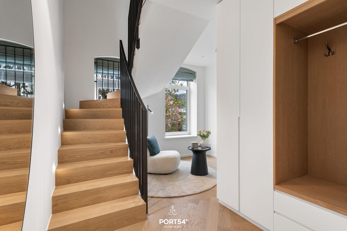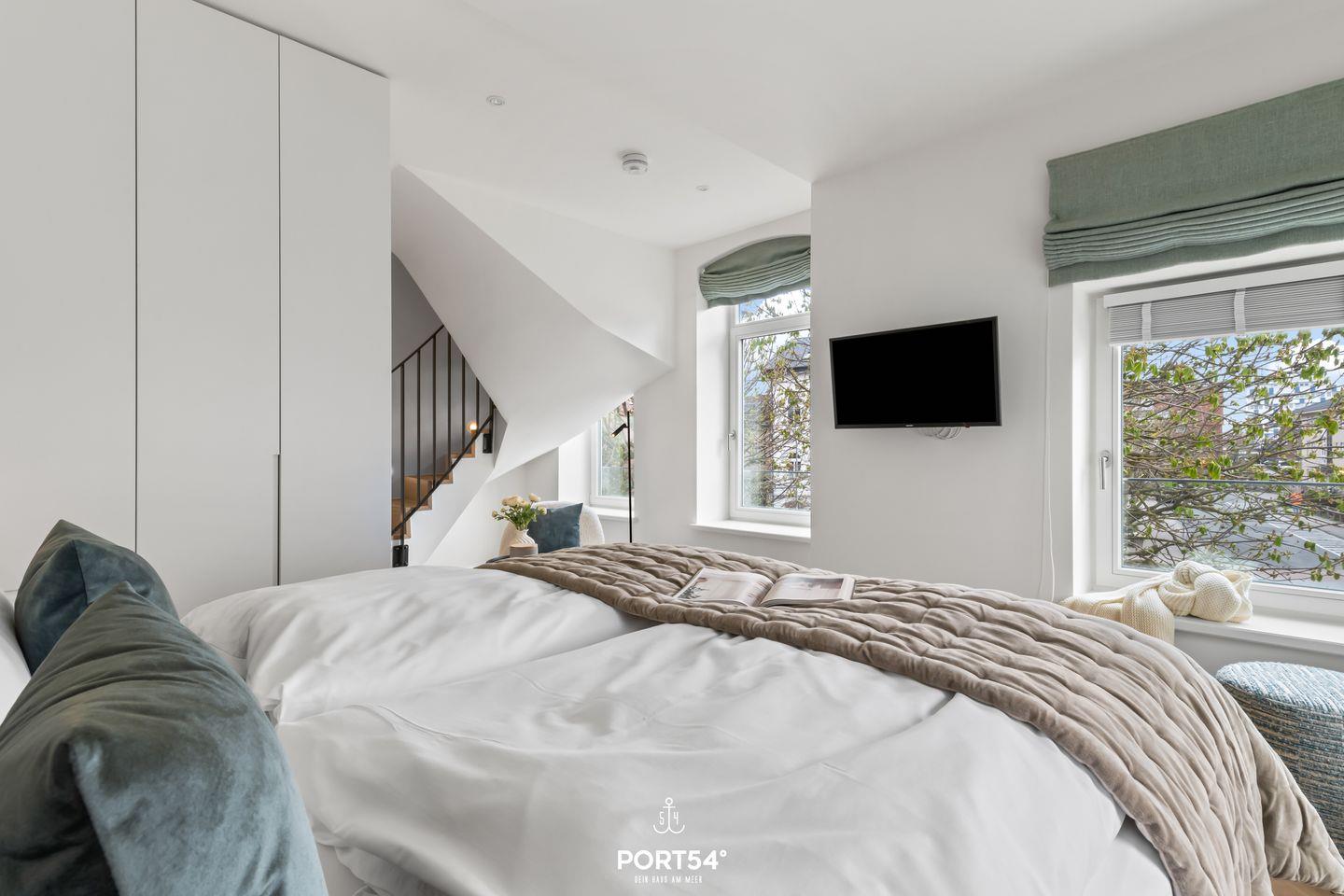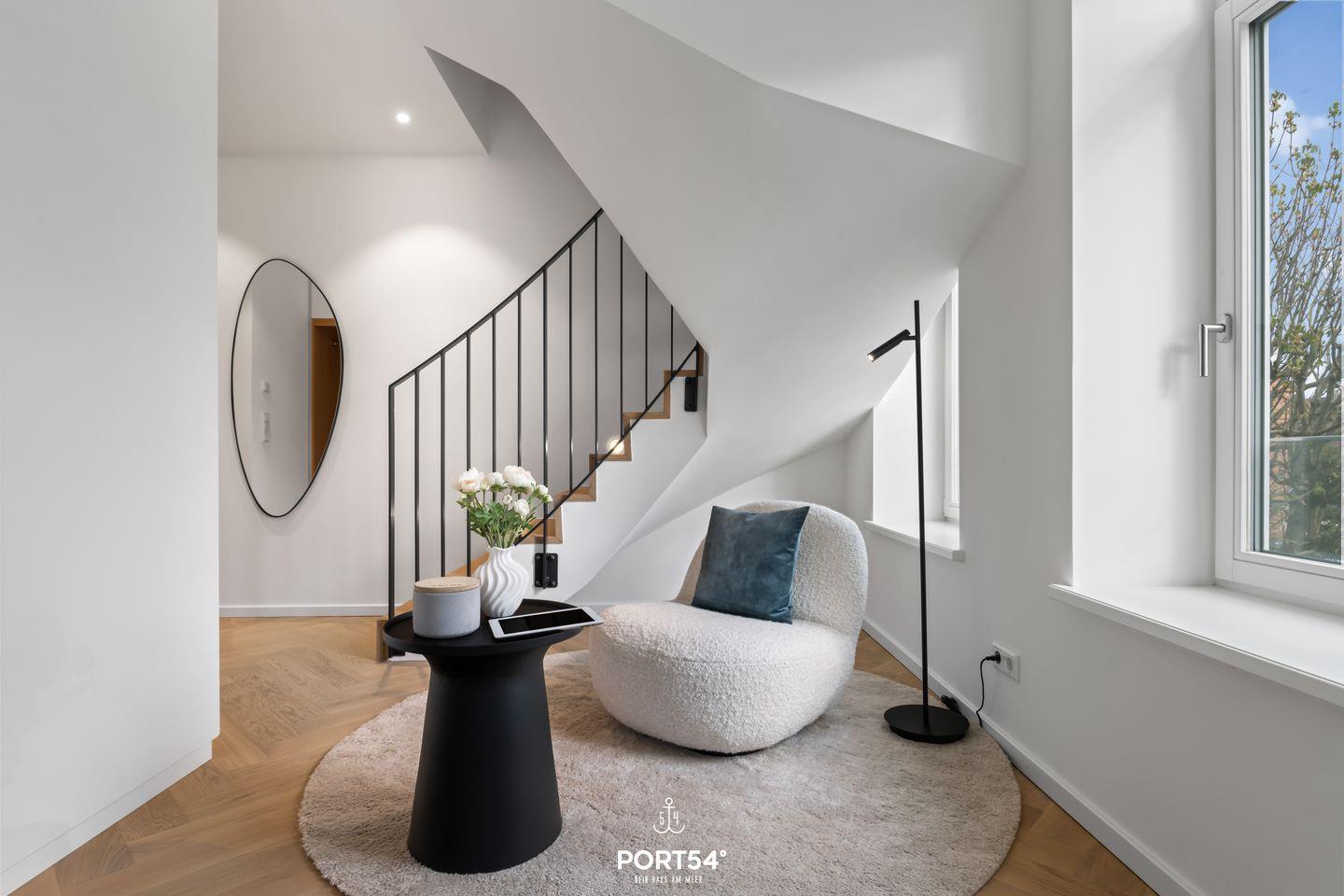 Im ersten OG über zwei Etagen mit Wohnbereich, ausgestattet mit Sofa, Sessel sowie Esstisch mit zwei Stühlen, Schlafzimmer mit Doppelbett und großem Schrank. Hochwertig eingerichtete, offene Küche mit Kühlschrank, Backofen und Herd. Exklusives Badezimmer mit einem Waschbecken, großer Regendusche und WC. Kleiner, luxuriöser Balkon mit Gartenmöbeln.