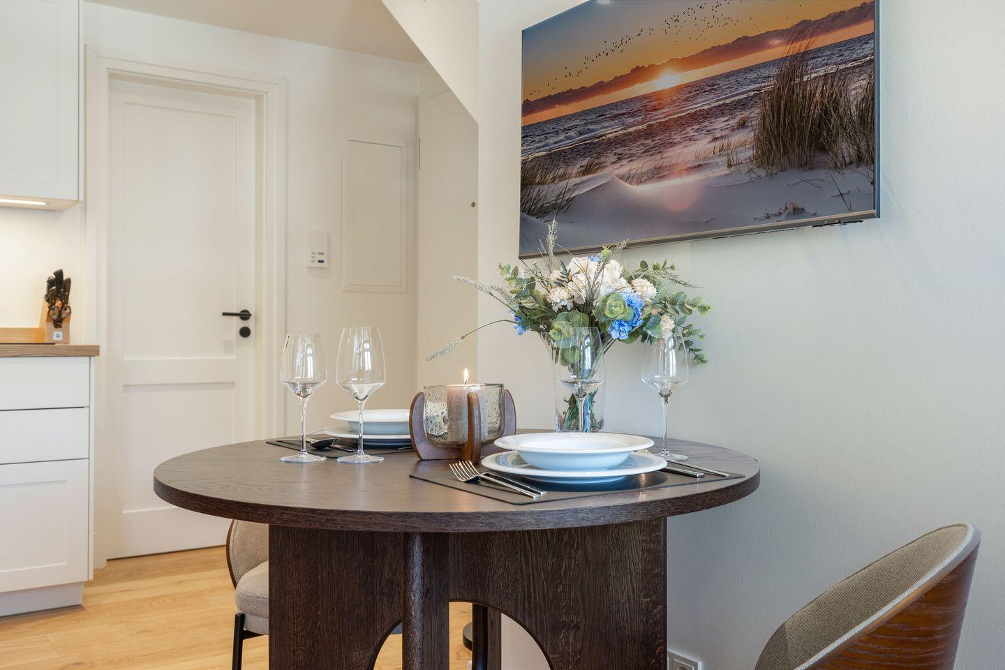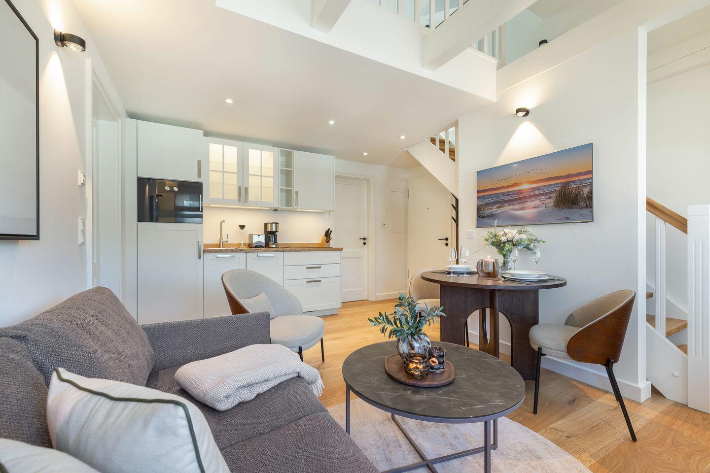 Entdecke die Ferienwohnung Watt'n Traum in Westerland auf Sylt. Diese moderne 5-Sterne-Unterkunft bietet auf 54 m² Platz für 2 Personen über 2 Etagen. Nur 700 m zum Strand und in der Nähe von Restaurants und Einkaufsmöglichkeiten. Die Wohnung verfügt über ein Schlafzimmer, eine offene Küche mit Induktionsherd und Spülmaschine sowie einen gemütlichen Wohnbereich mit Fernseher. Kinder sind willkommen, kostenloses WLAN ist vorhanden.