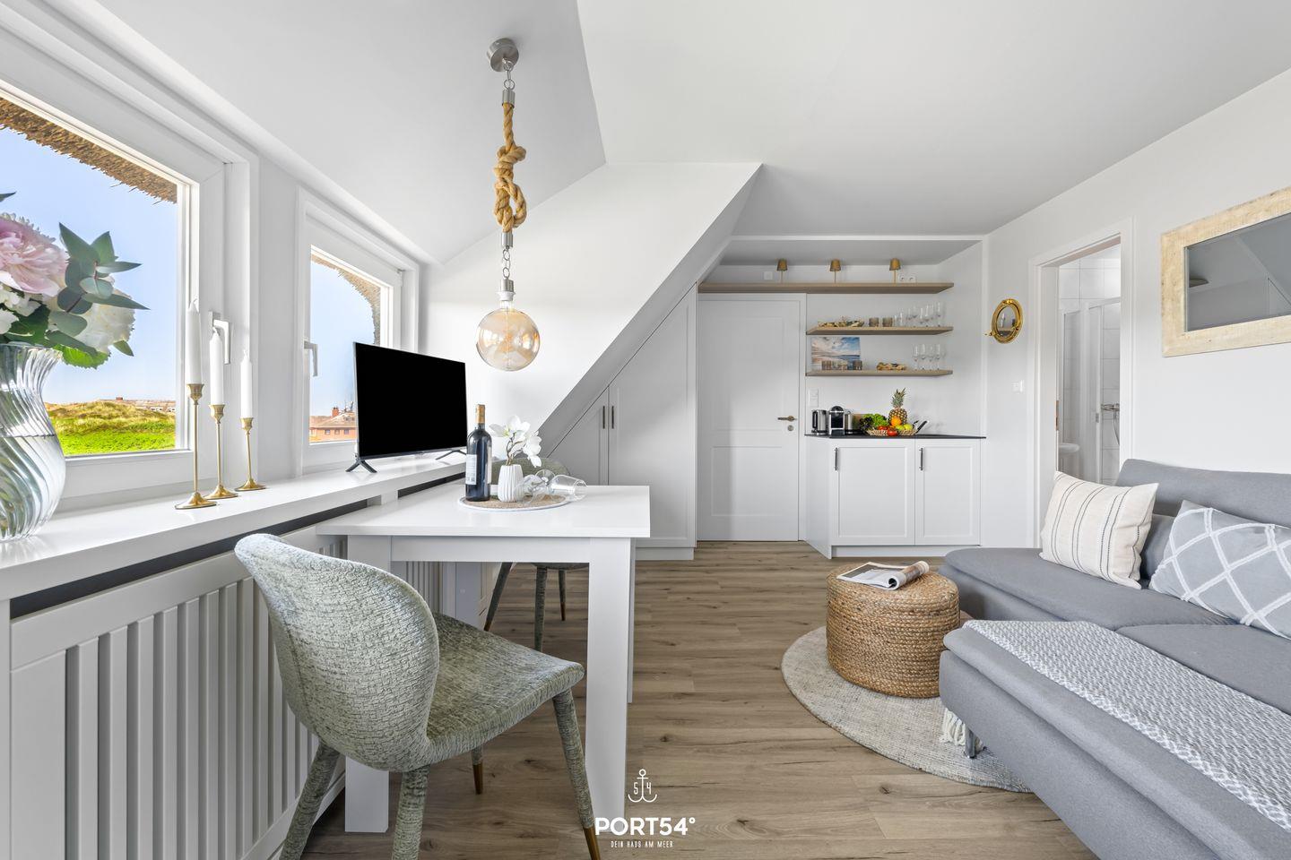Die Ferienwohnung Dünennest Rantum auf Sylt ist ein renoviertes, gemütliches 23 m² Apartment im 1. Stock für 2 Personen. Mit offenem Wohnbereich, Küche (2-Platten-Herd), Nespresso-Maschine und WLAN bietet sie alles für entspannte Tage. Bad mit Dusche in der Wanne, Garten mit Strandkorb. Sandstrand und Meer ca. 500 m, Restaurant 100 m. 2 Privatparkplätze, Haustiere bis 2, Nichtraucher. Waschmaschine/Trockner gemeinschaftlich.