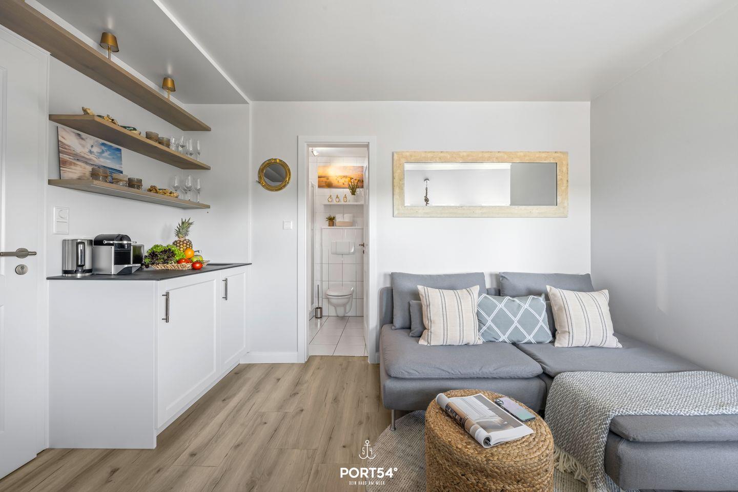 Der Wohnbereich ist als gemütliches Wohnzimmer mit Sofaecke gestaltet und geht fließend in die offene Küche über. Diese ist funktional ausgestattet mit einem 2-Platten-Herd, Kühlschrank mit Gefrierfach, Wasserkocher, Toaster sowie einer Nespresso-Espressomaschine. Küchenutensilien, Geschirr und Besteck sind vollständig vorhanden. Ein Esstisch mit separatem Essbereich ergänzt das Wohnkonzept. Für Unterhaltung und Konnektivität stehen WLAN/Internet sowie ein TV mit digitalem Anschluss zur Verfügung. Eine Garderobe ist ebenfalls vorhanden.