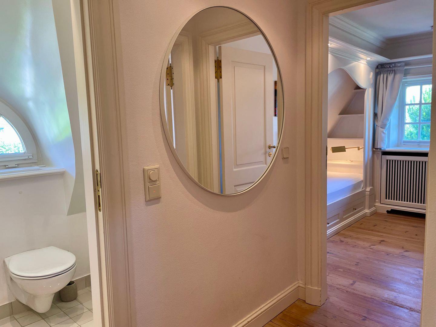 Das Obergeschoss bietet Ihnen ein Schlafzimmer mit einem 180cm breiten Doppelbett, sowie ein weiteres Schlafzimmer mit einem Einzelbett (Kojen Bett), ein geräumiges Bad mit Badewanne und ein weiteres Duschbad. Das Schlafzimmer verfügt über einen Safe für Ihre Wertsachen.