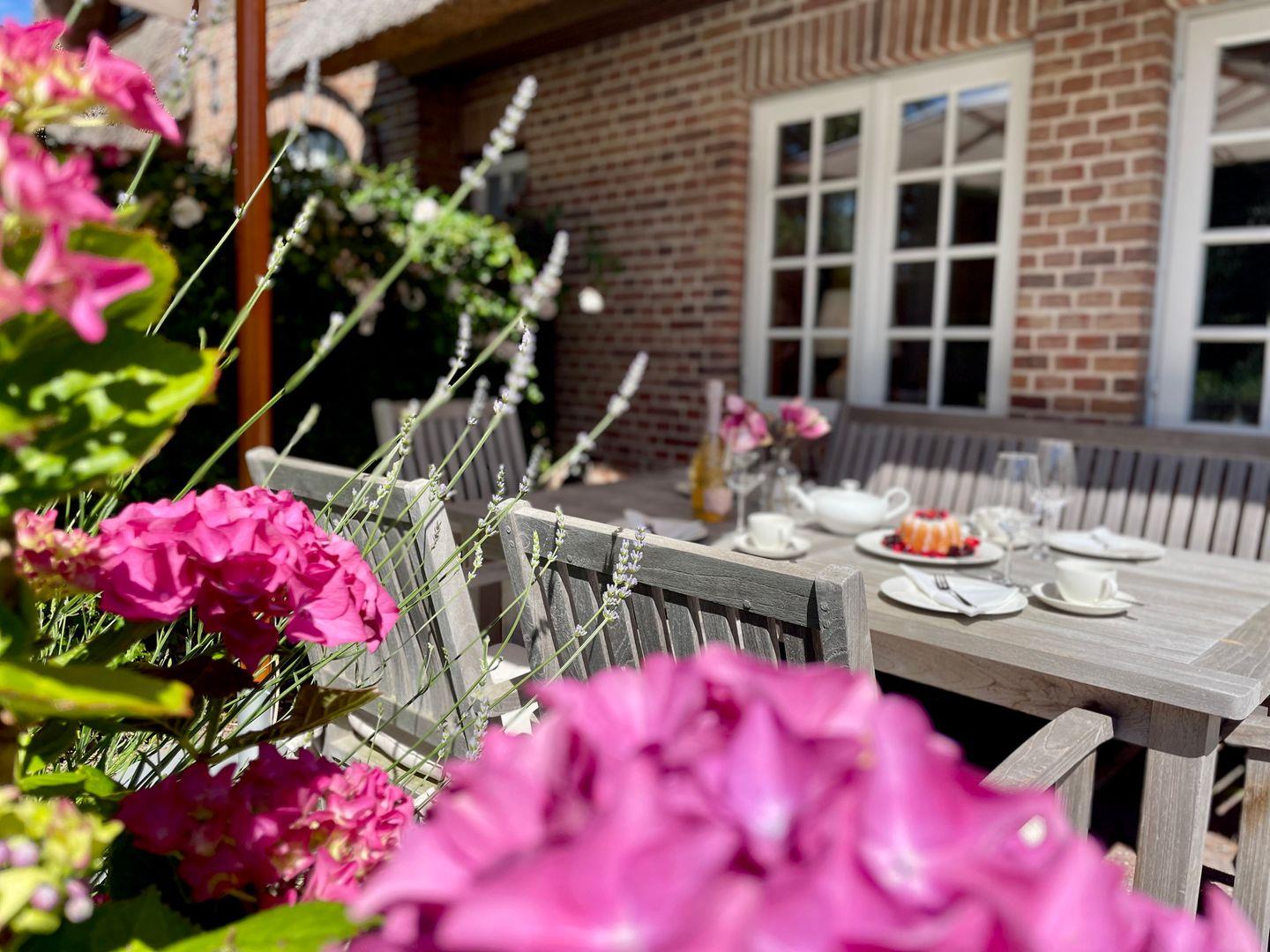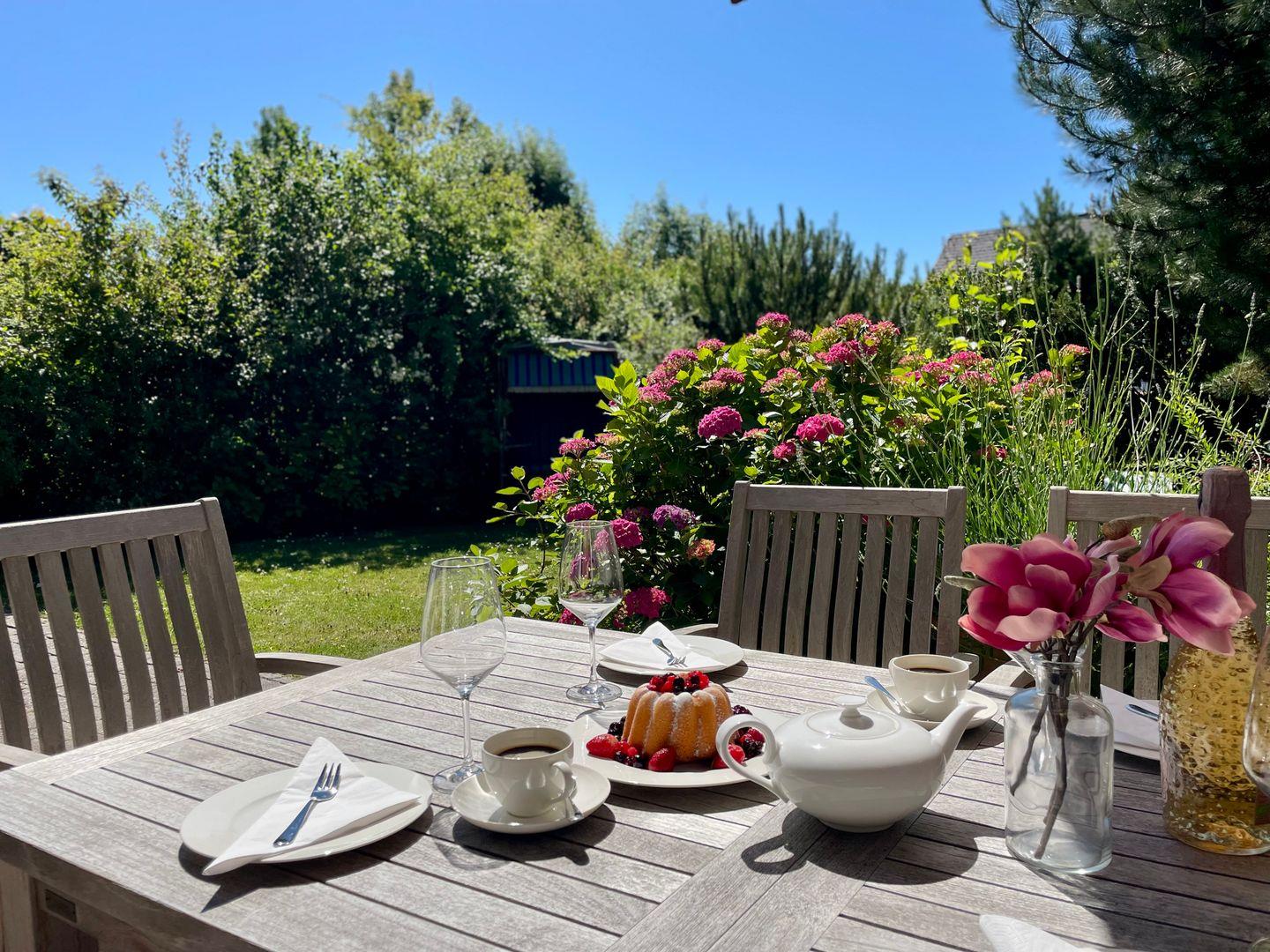 Ein komplett eingewachsener Garten nach Süden mit einer windgeschützten Terrasse, lädt dazu ein, den Tag bei einem großartigen Frühstück zu beginnen.