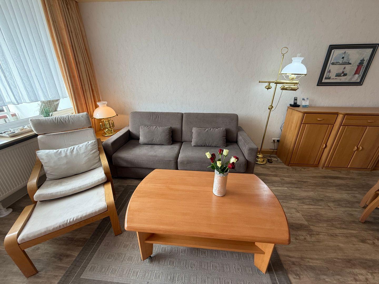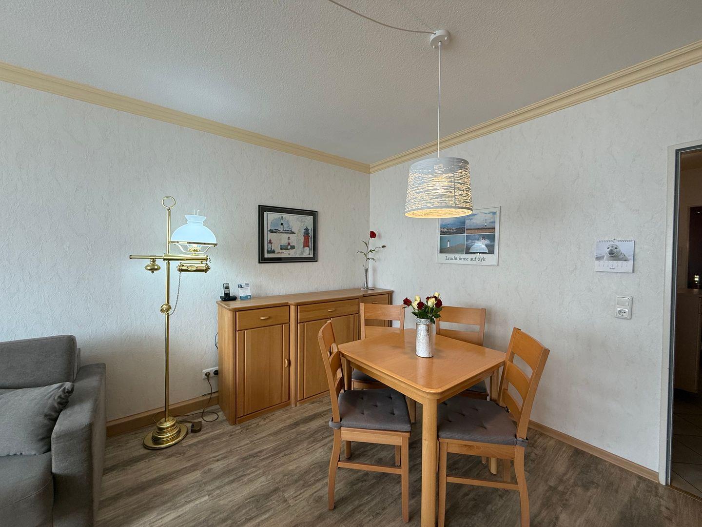 Im Wohnbereich dieser gemütlichen Ferienwohnung erwartet Sie, unter anderem, ein großzügiger Wohn- Essbereich. Er ist mit einem TV (Flachbildschirm inkl. Kabelanschluss), einem Radio/CD-Player sowie W-Lan und Telefon ausgestattet.