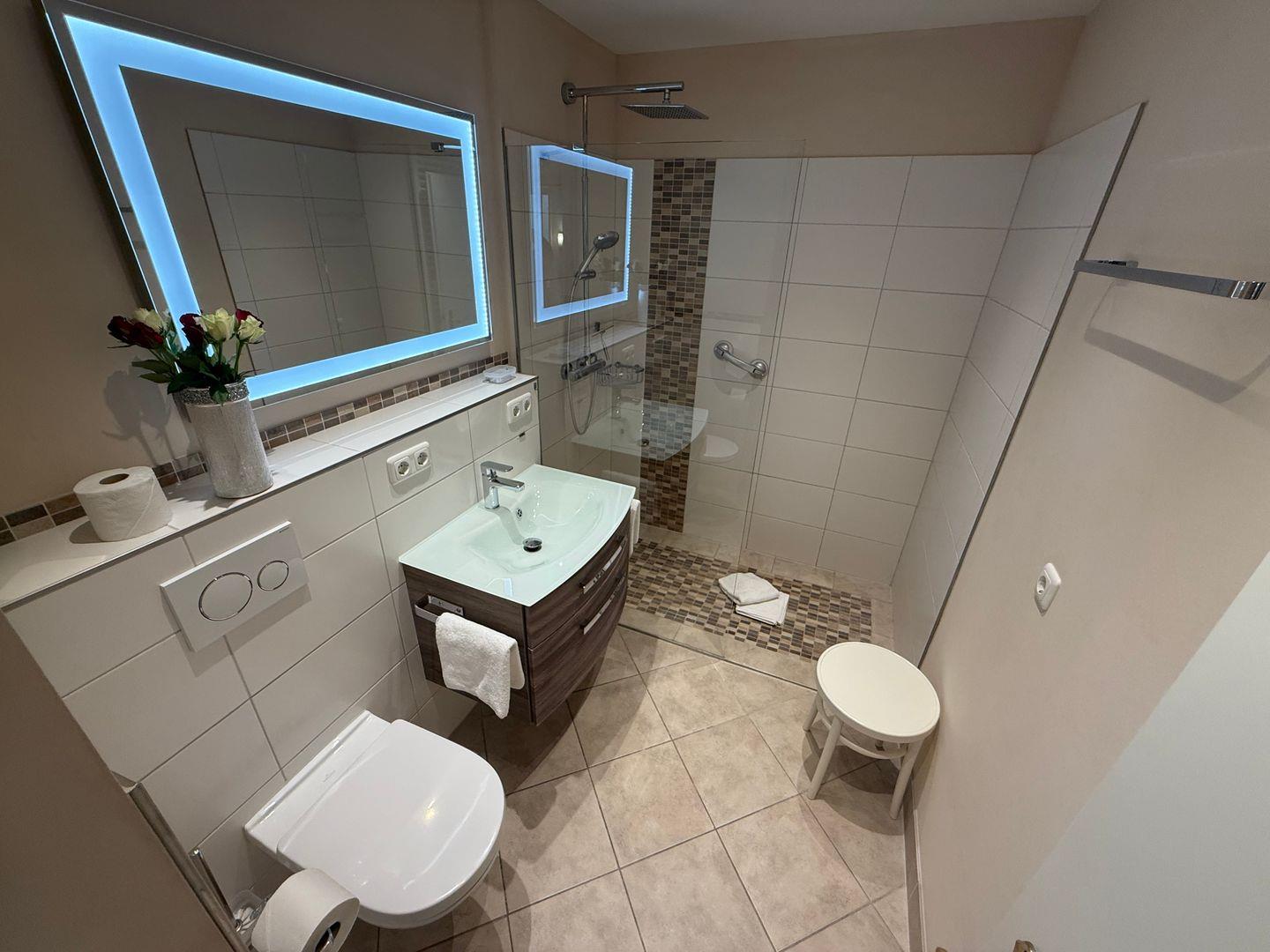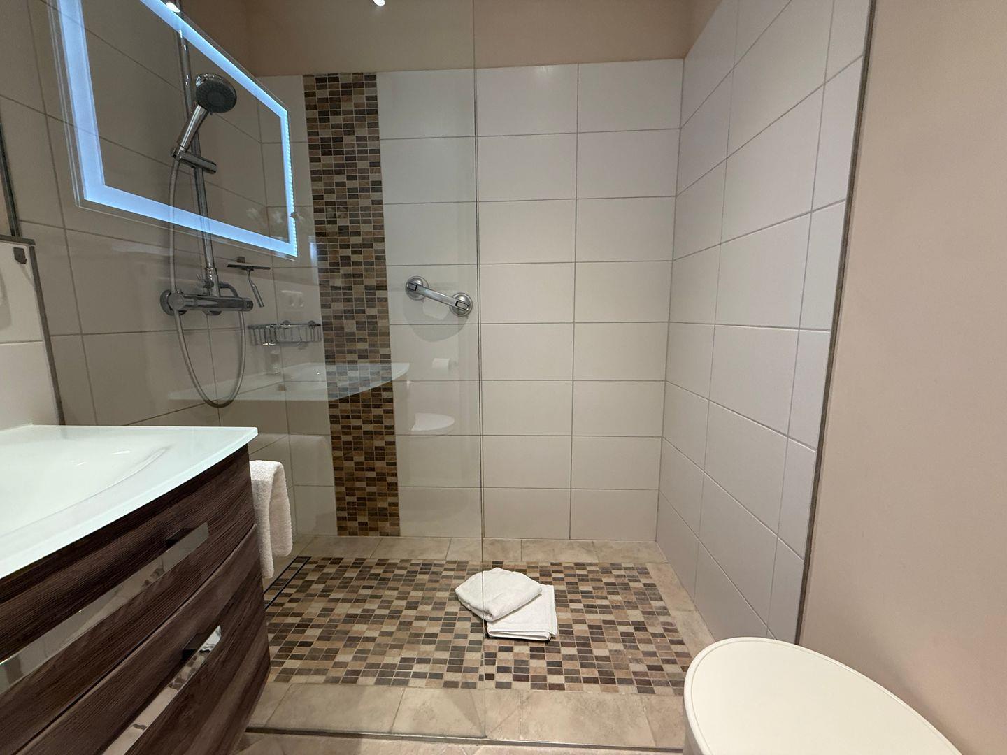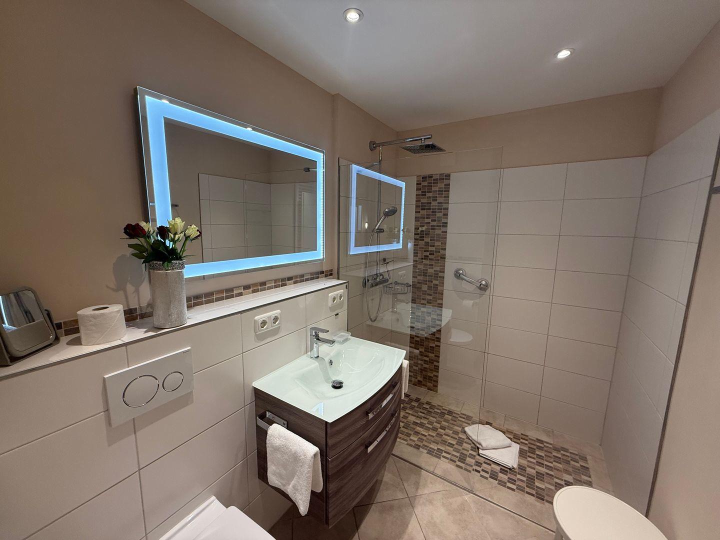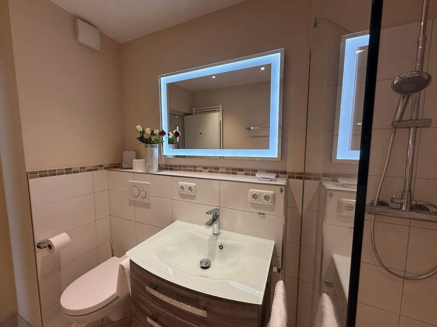 Das moderne Duschbad/WC ist sehr großzügig ausgestattet mit viel Ablageflächen. Ein Kosmetikspiegel sowie ein Fön sind selbstverständlich vorhanden.