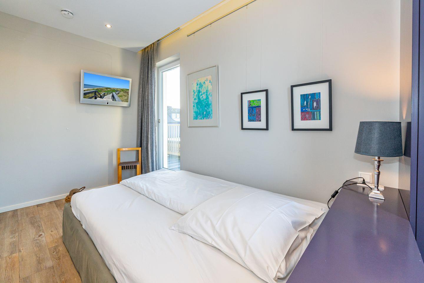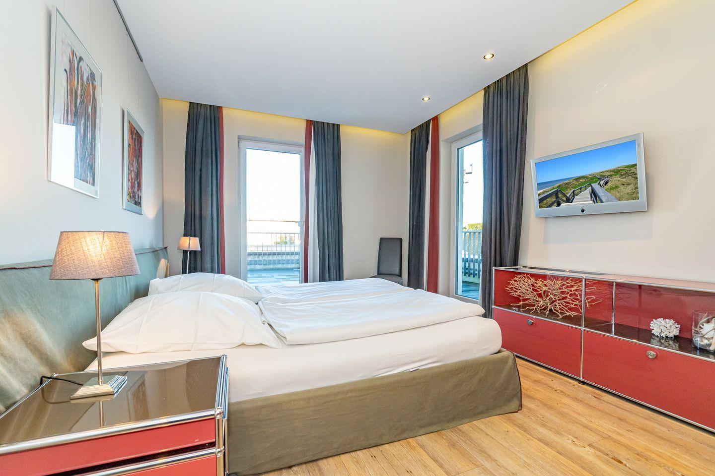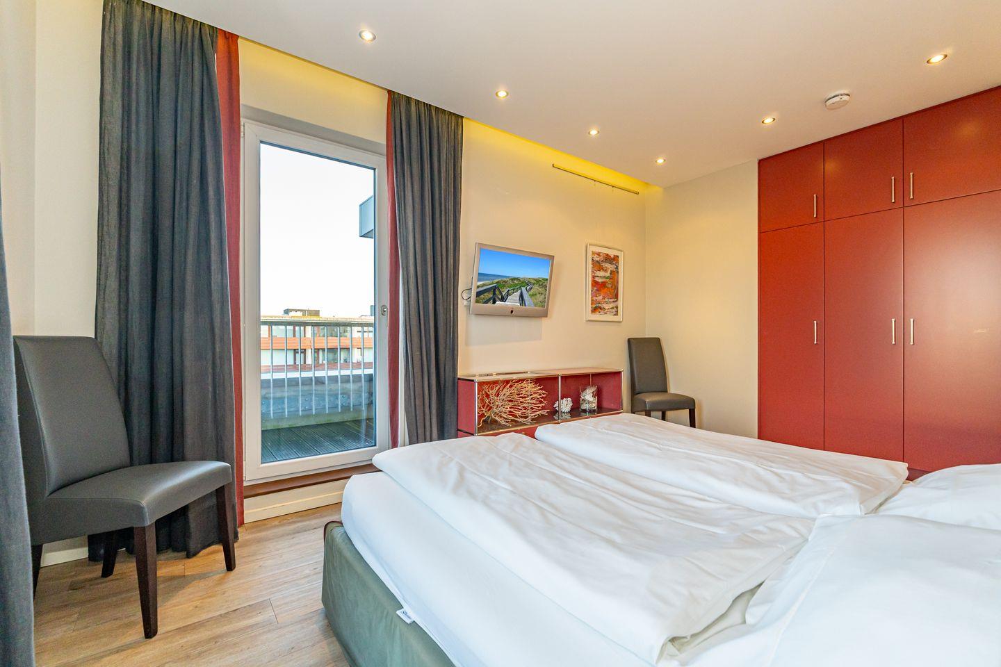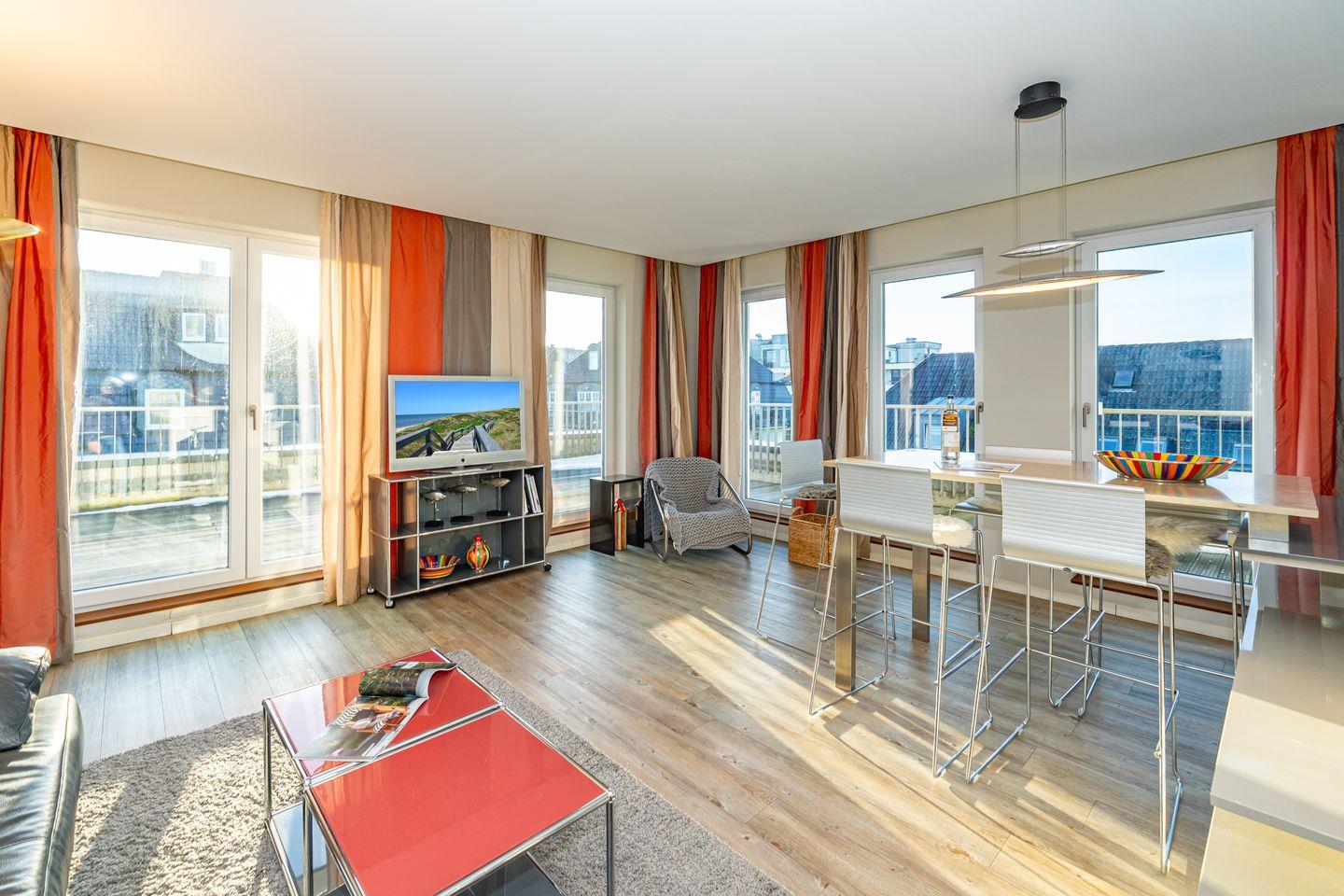 Das High end Penthouse in der Bomhoffstraße auf Sylt überzeugt durch seine erstklassige Ausstattung, die großzügige Raumaufteilung und die attraktive Lage in direkter Nähe zum Sandstrand und zur Nordsee. Mit einer Wohnfläche von 100 m² auf der obersten Etage eines modernen Gebäudes bietet das Penthouse ein exklusives Wohnambiente für bis zu drei Personen. Zwei separate Schlafzimmer mit hochwertigen Schlafmöglichkeiten sorgen für Privatsphäre und erholsame Nächte. Eines davon mit Doppelbett, das andere mit Einzelbett. Bereits beim Betreten des lichtdurchfluteten Wohn- und Essbereichs erkennen Sie die stilvolle Kombination aus Funktionalität und zeitgemäßem Design. Die vollständig ausgestattete und offene Küche lässt kein Detail vermissen: Neben einem Induktionsherd, Backofen und einer Spülmaschine stehen Ihnen eine Nespresso-Espressomaschine, Kaffeefiltermaschine, Wasserkocher, Toaster sowie ein Kühlschrank mit Gefrierfach zur Verfügung. Am Esstisch finden alle Gäste auf den stylischen Barstühlen Platz. Das Badezimmer ist modern eingerichtet und mit einer Dusche, Waschbecken, Spiegel, Fön und ist mit einem Fenster ausgestattet. Ein absolutes Highlight ist der private, großzügige Balkon, der mit Sonnenliegen (saisonal), Gartenmöbeln (saisonal) und einem eigenen Strandkorb (saisonal) ausgestattet ist. Selbstverständlich ist die Nutzung von Waschmaschine und Trockner möglich; diese stehen gemeinschaftlich gegen Gebühr zur Verfügung. Zu den Annehmlichkeiten zählt außerdem ein kostenloser Privatparkplatz direkt in der Tiefgarage des Hauses, der Ihnen die Anreise mit dem eigenen Fahrzeug erleichtert. Ein Aufzug bringt Sie bequem und barrierearm in den vierten Stock.