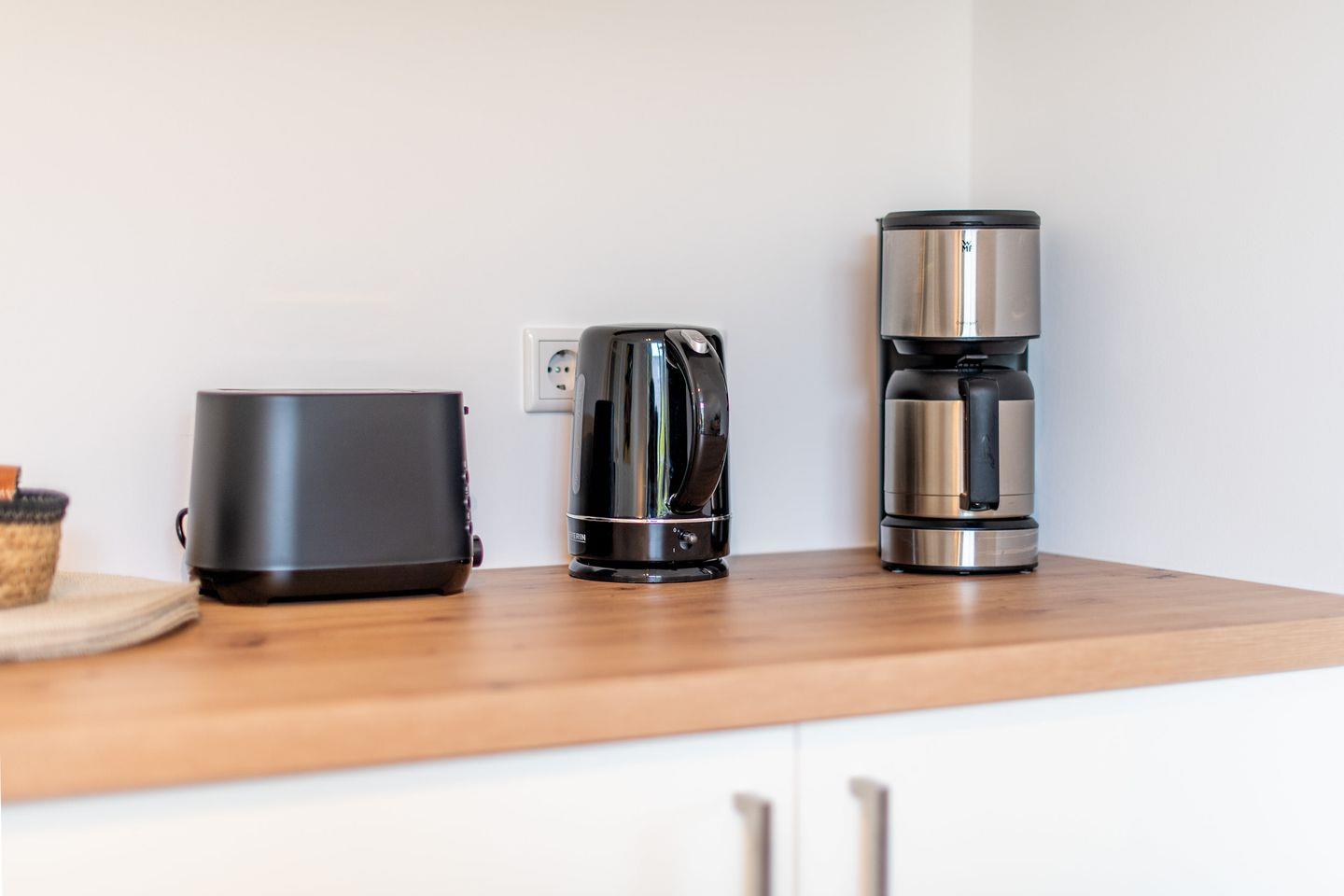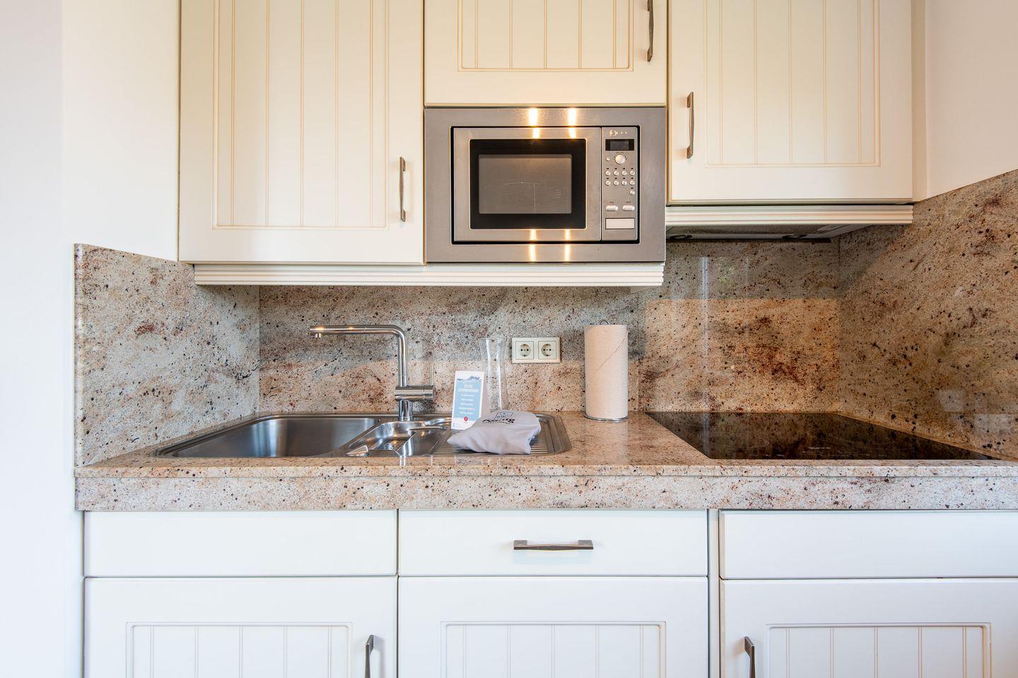 Die offene Küchenzeile ist voll ausgestattet und bietet mit Mikrowelle und Ceranfeld alles, was Sie zur Zubereitung Ihrer Mahlzeiten benötigen. Ob ein schnelles Frühstück, einen köstlichen Kaffee oder eine genussvolle Abendmahlzeit - alles ist möglich.
