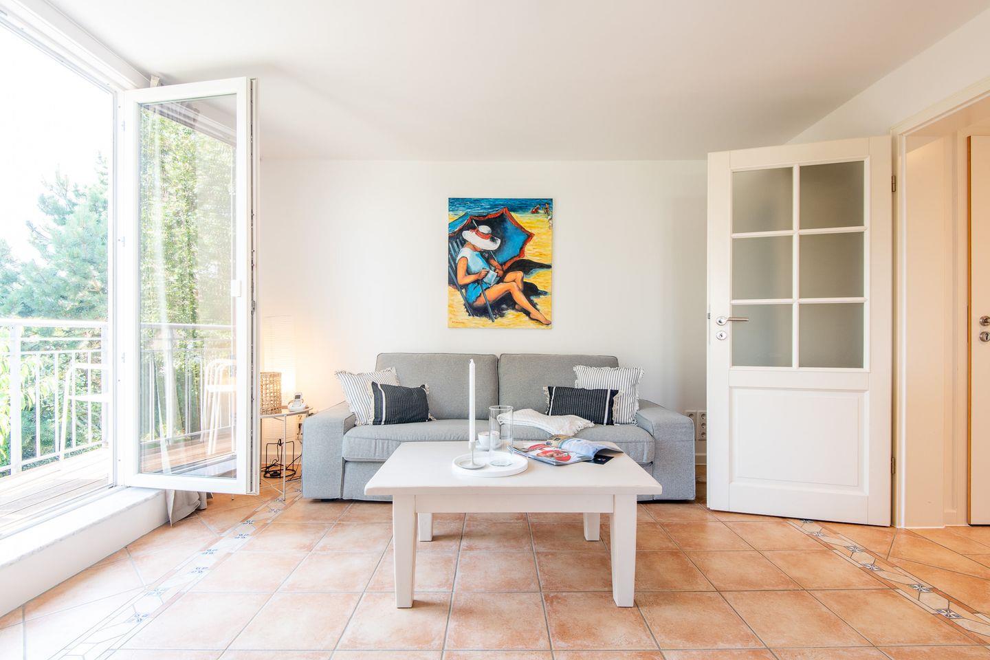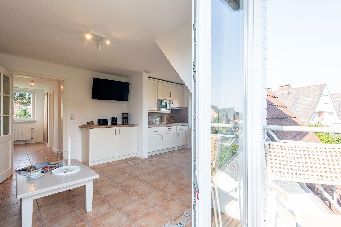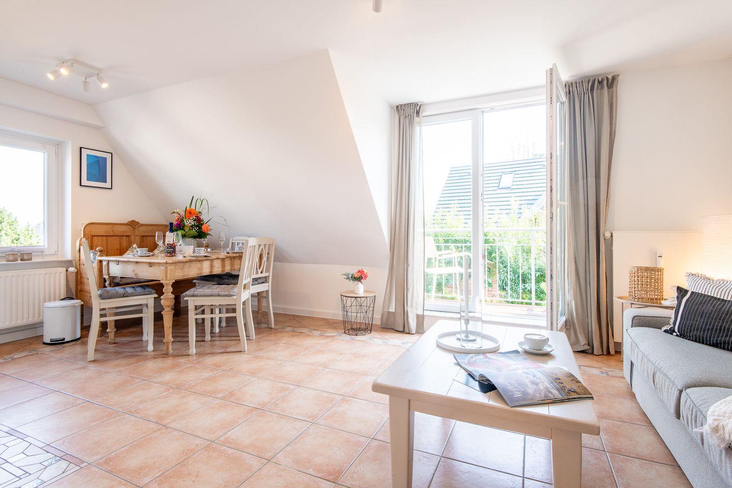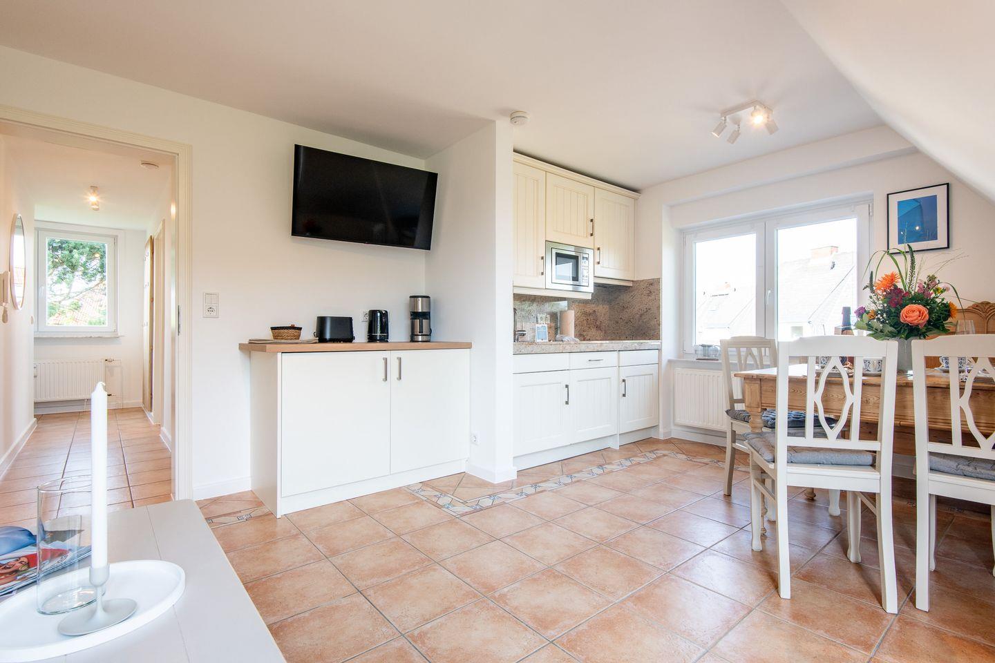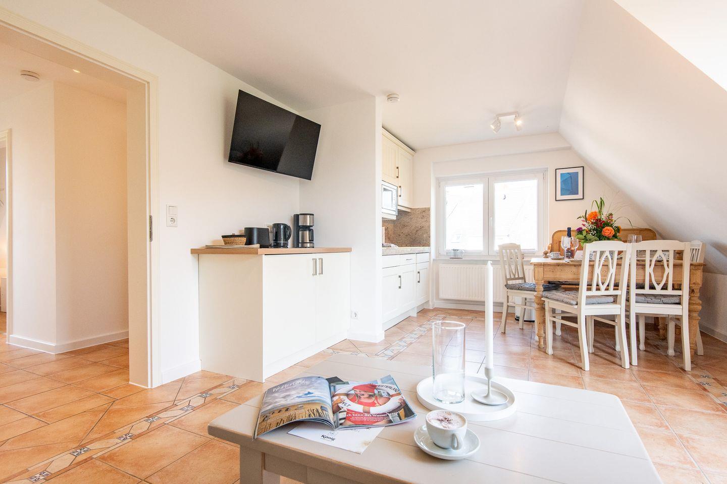 Die Wohnung bietet eine offene und lichtdurchflutete Raumaufteilung. Der gemütliche Wohn- und Essbereich lädt zum Verweilen ein – ideal für entspannte Stunden nach einem ausgiebigen Strandspaziergang oder einem Tagesausflug über die Insel.