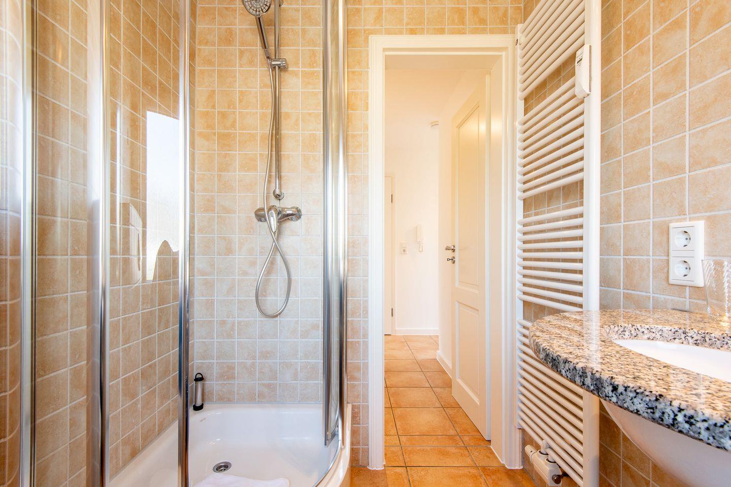 Das moderne Badezimmer verfügt über eine Dusche – perfekt, um erfrischt in den Tag zu starten oder nach einem langen Tag am Meer neue Energie zu tanken.