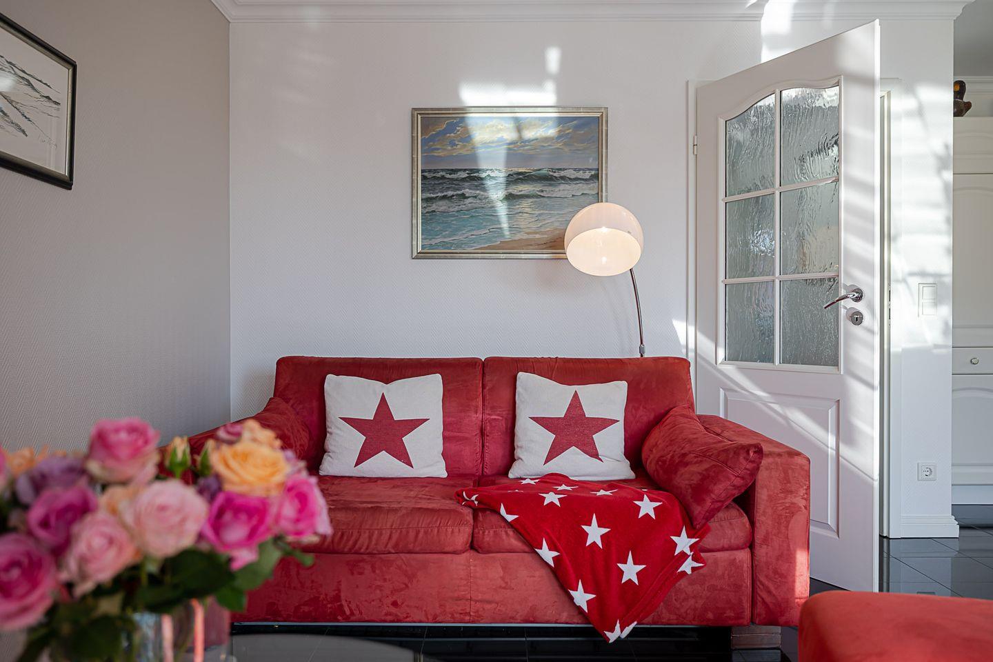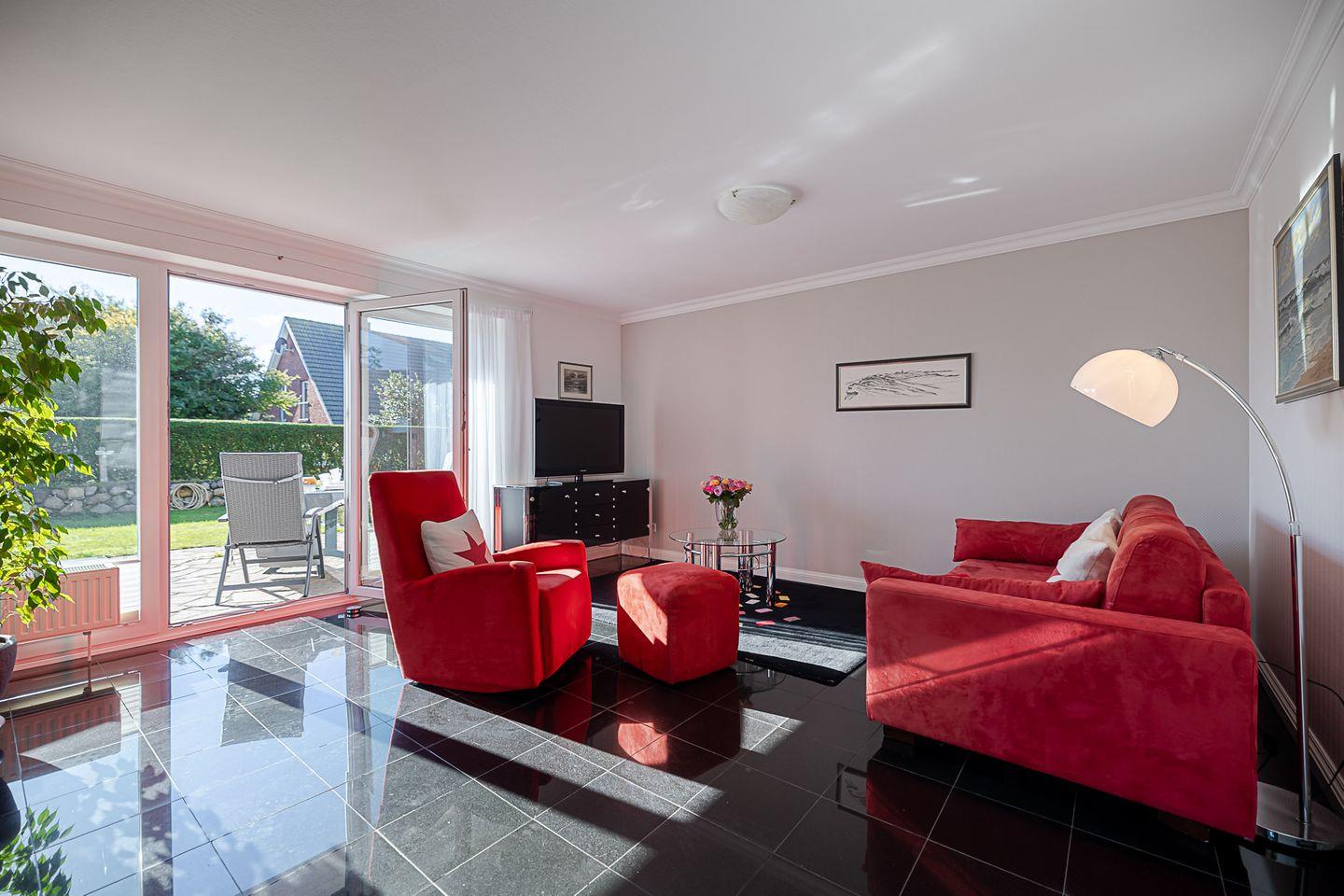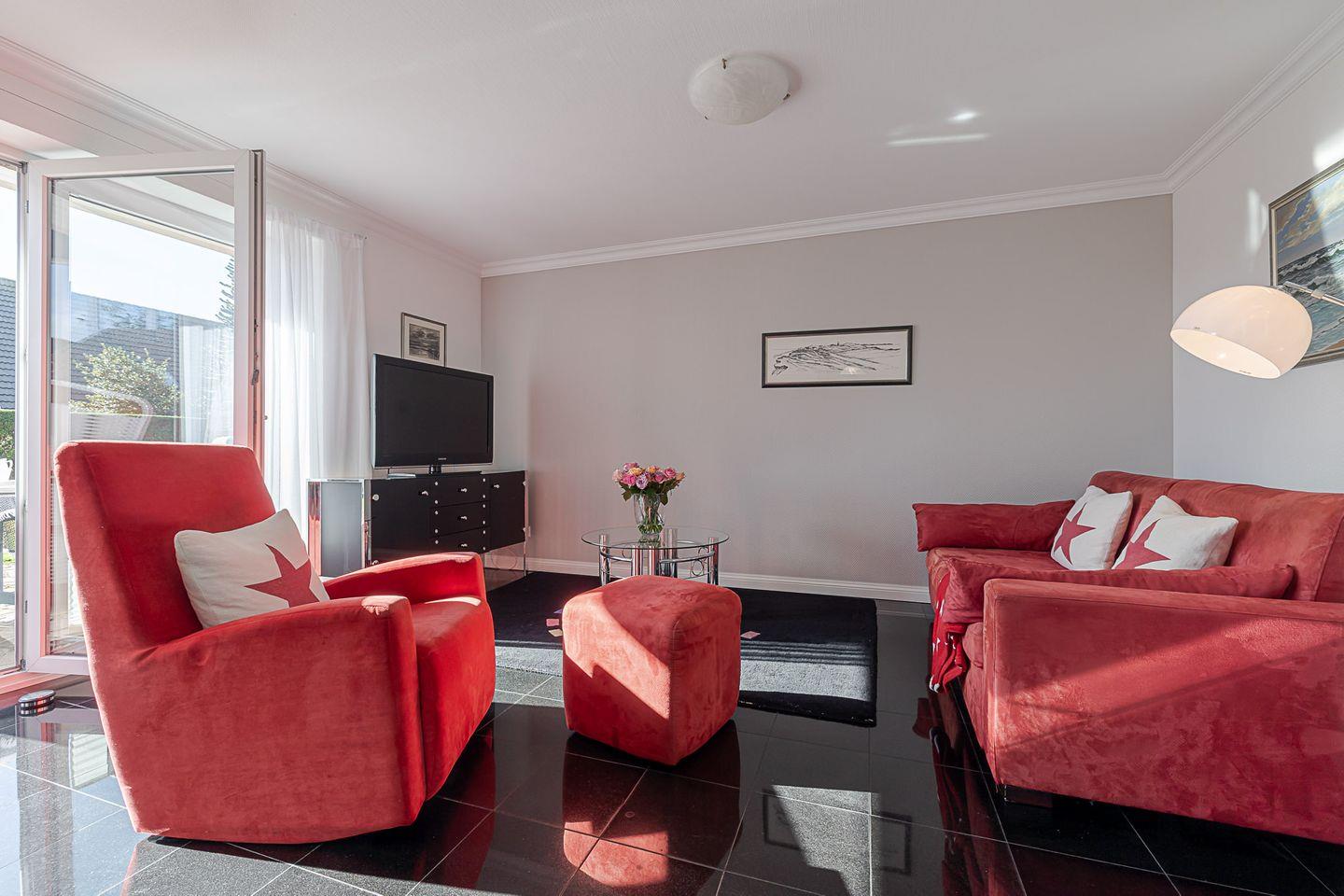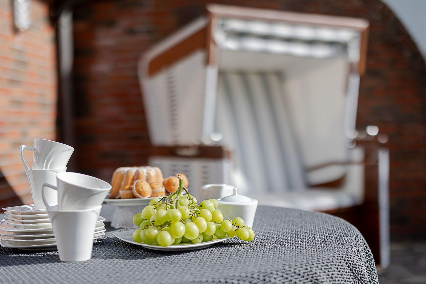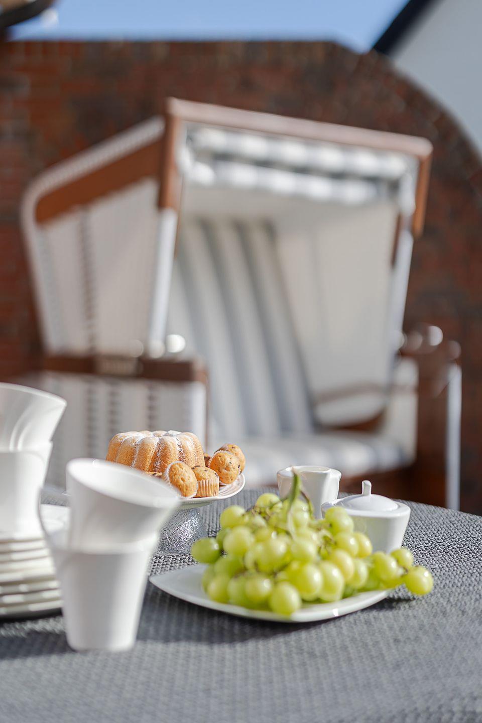 Das Wohnzimmer lädt zum Entspannen ein und ist mit Kabel-TV sowie einer Musikanlage ausgestattet. Zusätzlich bietet die Schlafcouch im Wohnbereich eine flexible Übernachtungsmöglichkeit. Ein besonderes Highlight ist die sonnige Südterrasse mit Möbeln und eigenem Strandkorb – der perfekte Ort, um die Nordseeluft zu genießen oder den Tag entspannt ausklingen zu lassen.