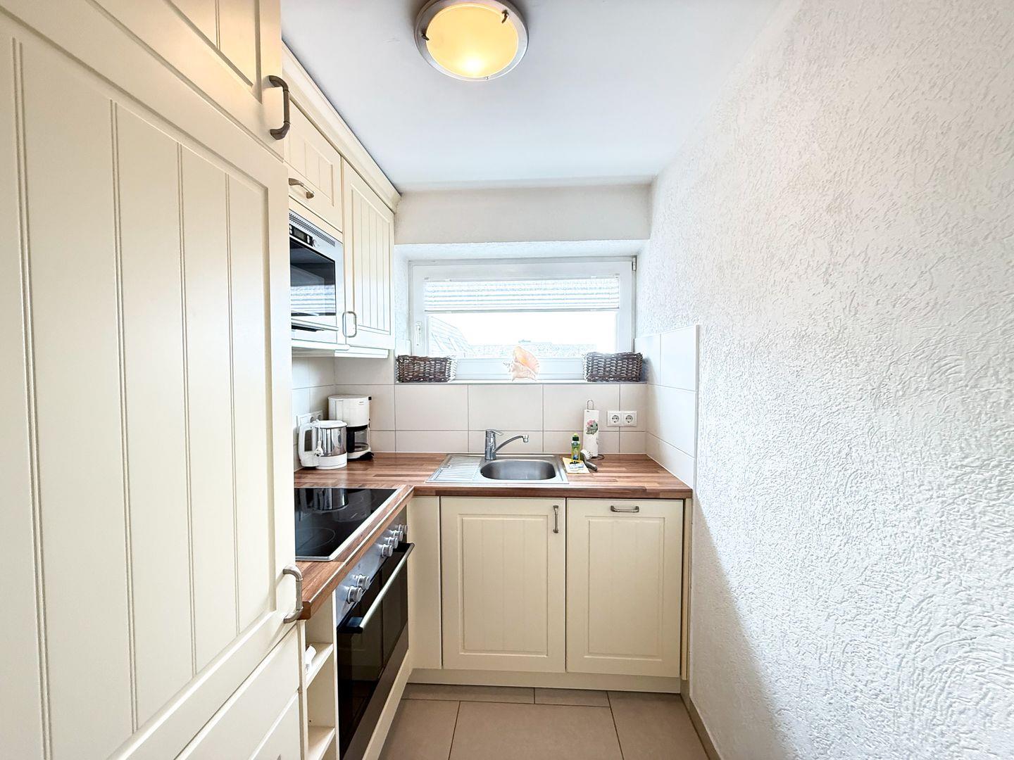 Das Wohnzimmer bietet eine Sofaecke mit zusätzlichem Sessel und einem großen Esstisch. Ein Fernseher sorgt für Unterhaltung nach Wunsch. Der separate Essbereich ist ideal für gemeinsame Mahlzeiten und geselliges Beisammensein. Die moderne, abgeschlossene Küche ist mit Ceranherd, Backofen, Kühl-Gefrierkombination (Gefrierfach im Kühlschrank), Mikrowelle, Kaffeemaschine, Toaster, Wasserkocher, Spülmaschine und den notwendigen Küchenutensilien ausgestattet. Damit steht einer stressfreien Selbstversorgung nichts im Wege.