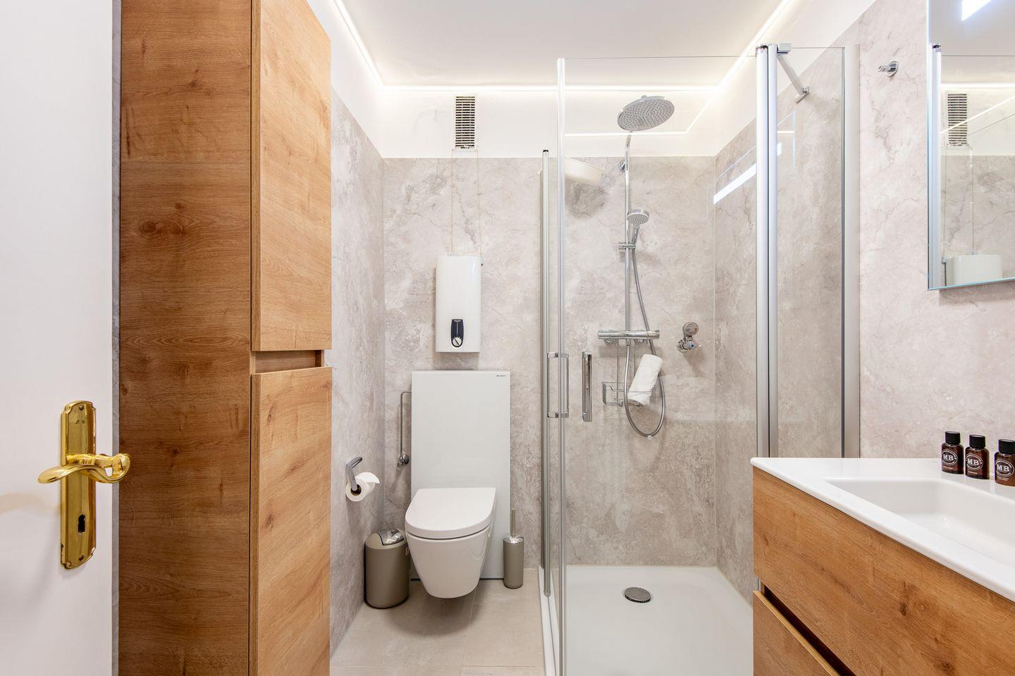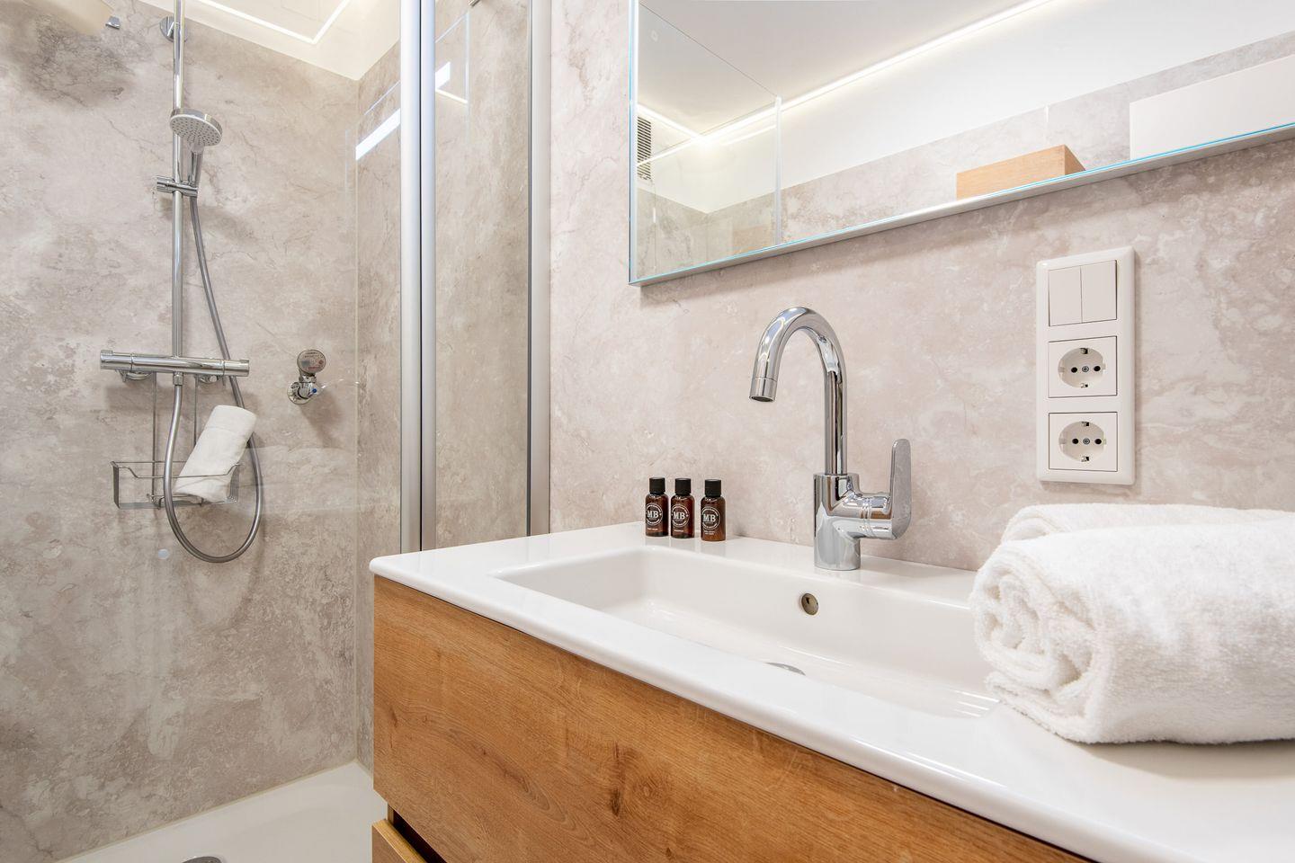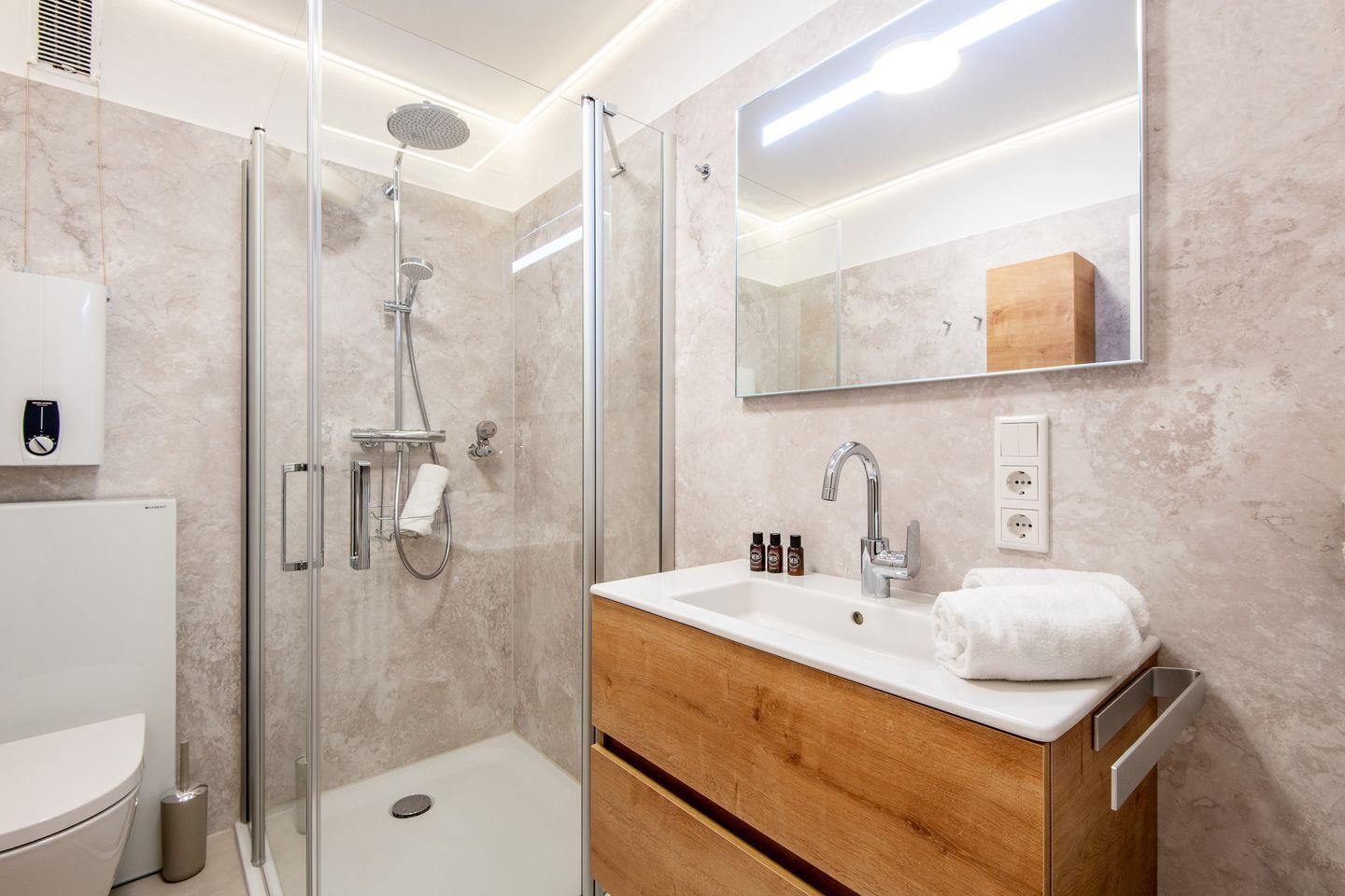 Das Badezimmer ist mit einer bodengleichen Dusche ausgestattet und verspricht dank seines modernen Stils einen angenehmen Start in den Tag – funktional und komfortabel zugleich.